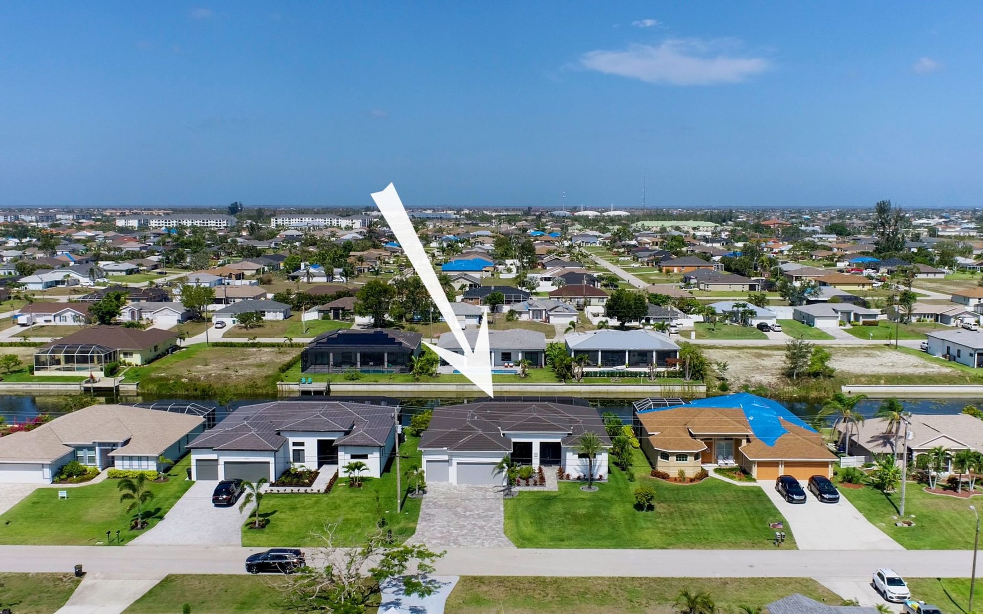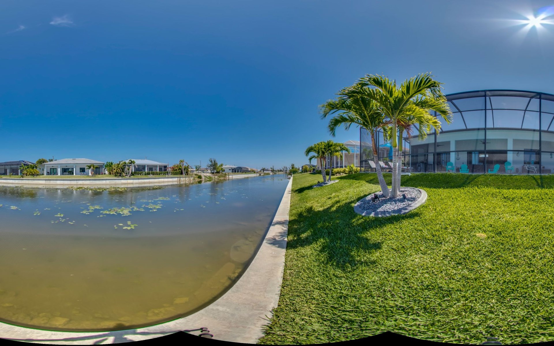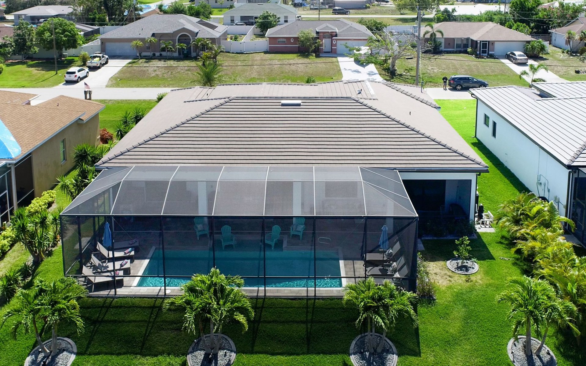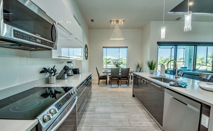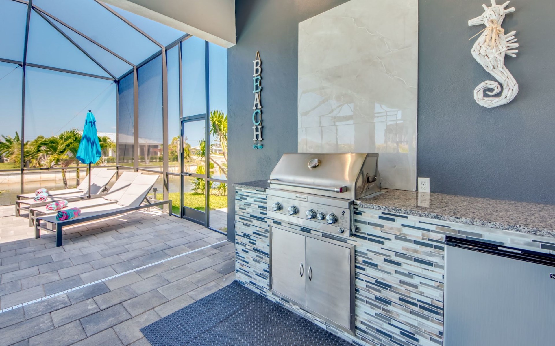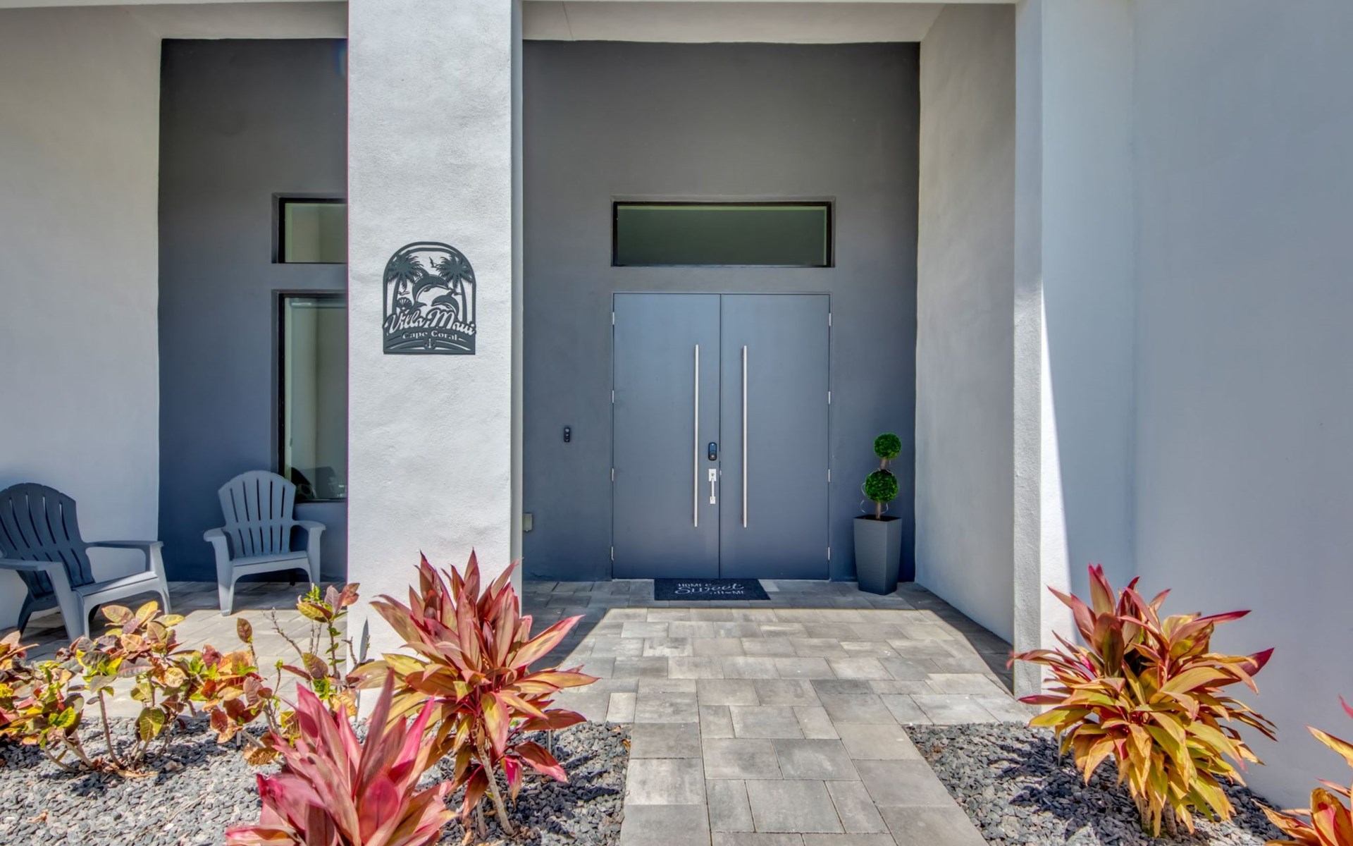 The Villa Maui with heated private pool in the holiday resort of Cape Coral on the west coast of Florida invites you to enjoy a holiday with state-of-the-art facilities and pure luxury in an excellent location with many excursion and shopping opportunities nearby.the Villa Maui was only built in 2019 in a modern style. It is located in a quiet area directly on a south-west facing canal, where you can enjoy the sunset with a view over the canal and experience a wonderful holiday on the Gulf Coast of Florida. Experience the best comfort for your relaxing holiday.Villa Maui is on one level and is approx. 204m² in size.The large, open-plan living room is located in the centre of the house with the open-plan kitchen and spacious dining area. The high ceilings and large windows give the rooms a spacious and bright feel. An oversized fan hangs from the ceiling in the living room.In the living room you will find a large lounge area and a large Smart TV as well as a fireplace.In the open, fully equipped kitchen you will find, among other things:- microwave- oven- French door fridge with freezer compartment and ice cube maker- Food processor- Egg cooker- Nespresso Vertuo coffee machine- Keurig coffee machine- Filter coffee machine- Milk frother- Pots, pans, crockery, cutlery, glasses etc.- Dishwasher- Kettle- Children's crockery and cutleryThe dining area easily seats up to 7-8 people.The windows in the living room and dining area can be blacked out. This ensures privacy, sun protection and privacy at all times.The so-called MASTER AREA is located in the right-hand area.In the master bedroom you have a king-size bed, smart TV, fan, direct pool access and access to the master bathroom. The doors in the master bedroom have electric darkening and an alarm that can be activated if necessary (children).In the master bathroom with natural light, you can shower comfortably in the walk-in rain shower and take a cosy bath in the free-standing bathtub. 2 washbasins, drawers, make-up mirror, hairdryer, towels, bath towels and a separate toilet complete the offer.There are 2 guest rooms and the guest bathroom on the left-hand side of the house.Guest room 1:- large double bed- Access to the pool area- Electric darkening of the doors- Alarm on the doors if required- Smart TV- built-in wardrobe- fanGuest room 2:- large double bed- window- fan- Smart TV- built-in wardrobeGuest bathroom:- Toilet- Walk-in shower with rain shower- Hand towels- Bath towels- Washbasin- Storage facilities- Hairdryer- make-up mirrorOffice/ 3rd guest room- Pull-out sofa- Writing desk- chair- Fan- Blackout blinds on the windowsOf course, we also have something for our younger guests:- free baby cot- baby monitor- high chair- children's cutleryThe Loundry contains the following:- Washing machine- tumble dryer- Ironing board and iron- Hoover- Shopping baskets and bagsThe house has central air conditioning.The pool area is easily accessible from the living room. Experience a breathtaking view over the wide freshwater canal. The plot has beautiful palm trees and we have planted a palm hedge to the neighbouring properties.The heated pool is over 9 metres long and invites you to splash around and relax. The pool area is completely enclosed by a screen. This keeps the mosquitoes away.There are plenty of new sun loungers, cushions and parasols around the pool. A weekly pool service ensures good water quality.A new outdoor kitchen with barbecue, fridge and shelves makes for great barbecue evenings by the pool. Enjoy marvellous sunsets with a view over the canal. Sun worshippers will get their money's worth thanks to the good south-west orientation.There is also a lounge area. A large dining area for up to 10 people and ceiling fans on the terrace round off the offer.New: we have had hurricane shutters installed on the terrace. The shutters not only protect against the storm, but our guests can also adjust them electrically to protect them from the sun, rain and wind on the terrace. Enjoy your holiday to the full.New: TV on the terrace, watch TV in the pool!Bath towels, towels and bed linen are included in the price. Beach chairs and umbrellas for your beach visit can be used free of charge.You can park your car safely in the garage.Please note that security cameras are installed in front of the house at the garage and entrance for your safety. It is not permitted to tamper with the electrics, Wi-Fi router or TV sets!-You can easily access the pool area from the living room. Experience a breathtaking view over the wide fresh water channel. The plot has beautiful palm trees and we have planted a palm hedge to the neighbouring properties.The heated pool is over 9 metres long and invites you to splash around and relax. The pool area is completely enclosed by a screen. This keeps the mosquitoes away.There are plenty of new sun loungers, cushions and parasols around the pool. A weekly pool service ensures good water quality.A new outdoor kitchen with barbecue, fridge and shelves makes for great barbecue evenings by the pool. Enjoy marvellous sunsets with a view over the canal. Sun worshippers will get their money's worth thanks to the good south-west orientation.There is also a lounge area. A large dining area for up to 10 people and ceiling fans on the terrace round off the offer.New: we have had hurricane shutters installed on the terrace. The shutters not only protect against the storm, but our guests can also adjust them electrically to protect them from the sun, rain and wind on the terrace. Enjoy your holiday to the full.Bath towels, towels and bed linen are included in the price. Beach chairs and umbrellas for your beach visit can be used free of charge.The screen protects you from mosquitoes on the terrace.Sunshades, sunbeds and bath towels are available for free use in the house.Various toys and air mattresses may be available on site and a lounge area has been integrated.The front garden was also embellished in October 2021 with new plants an