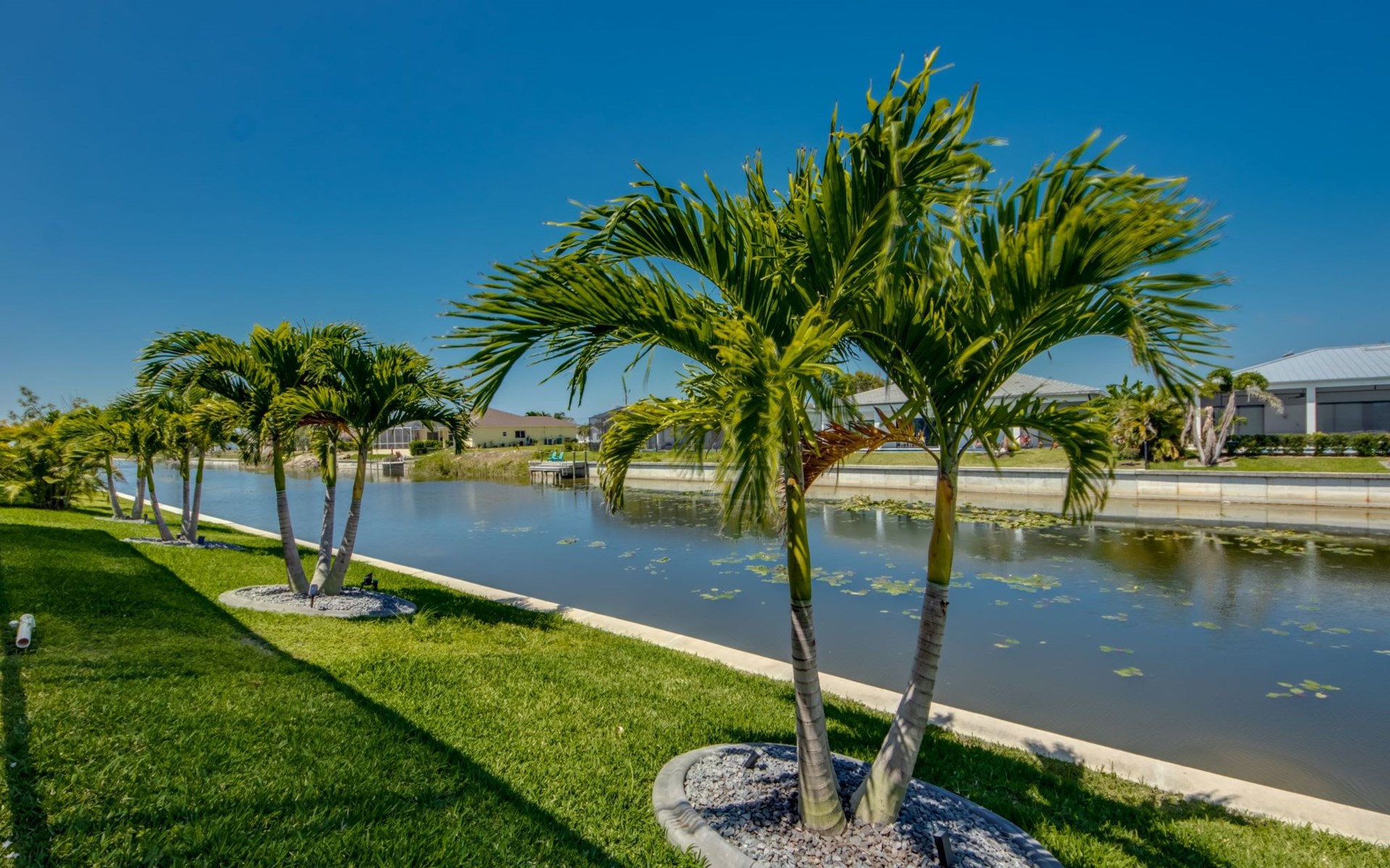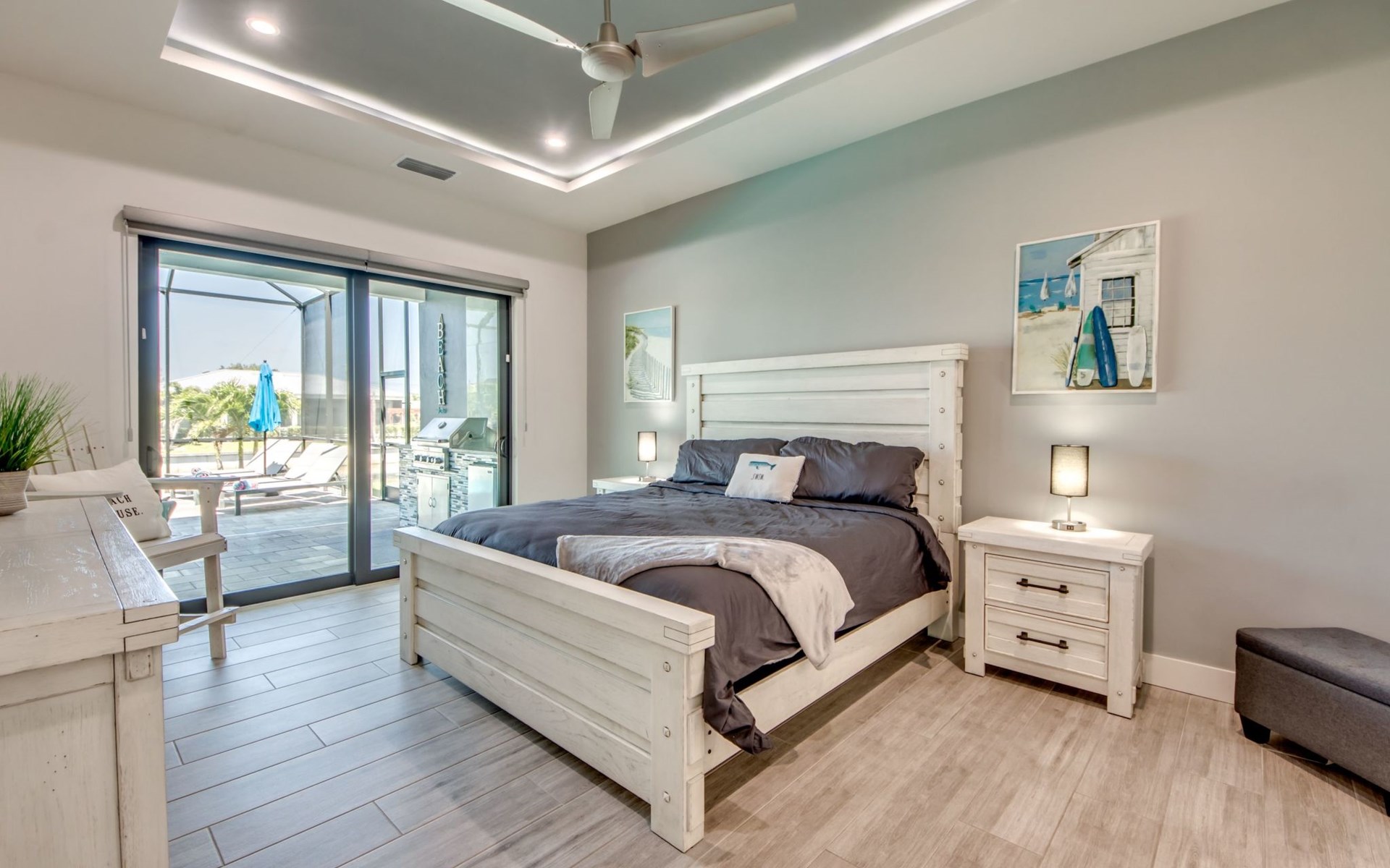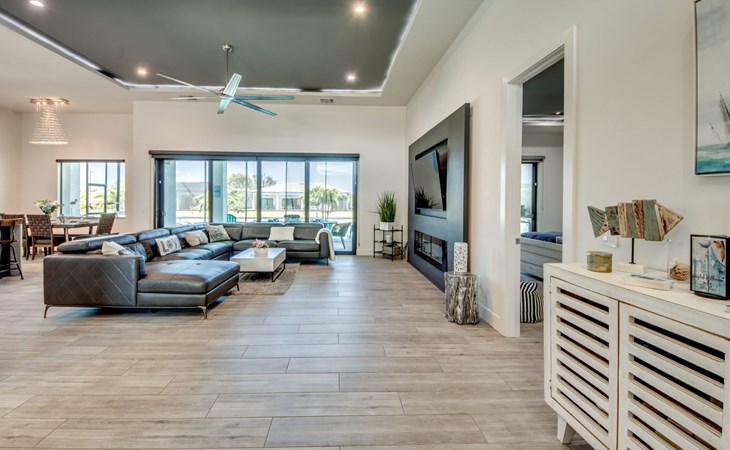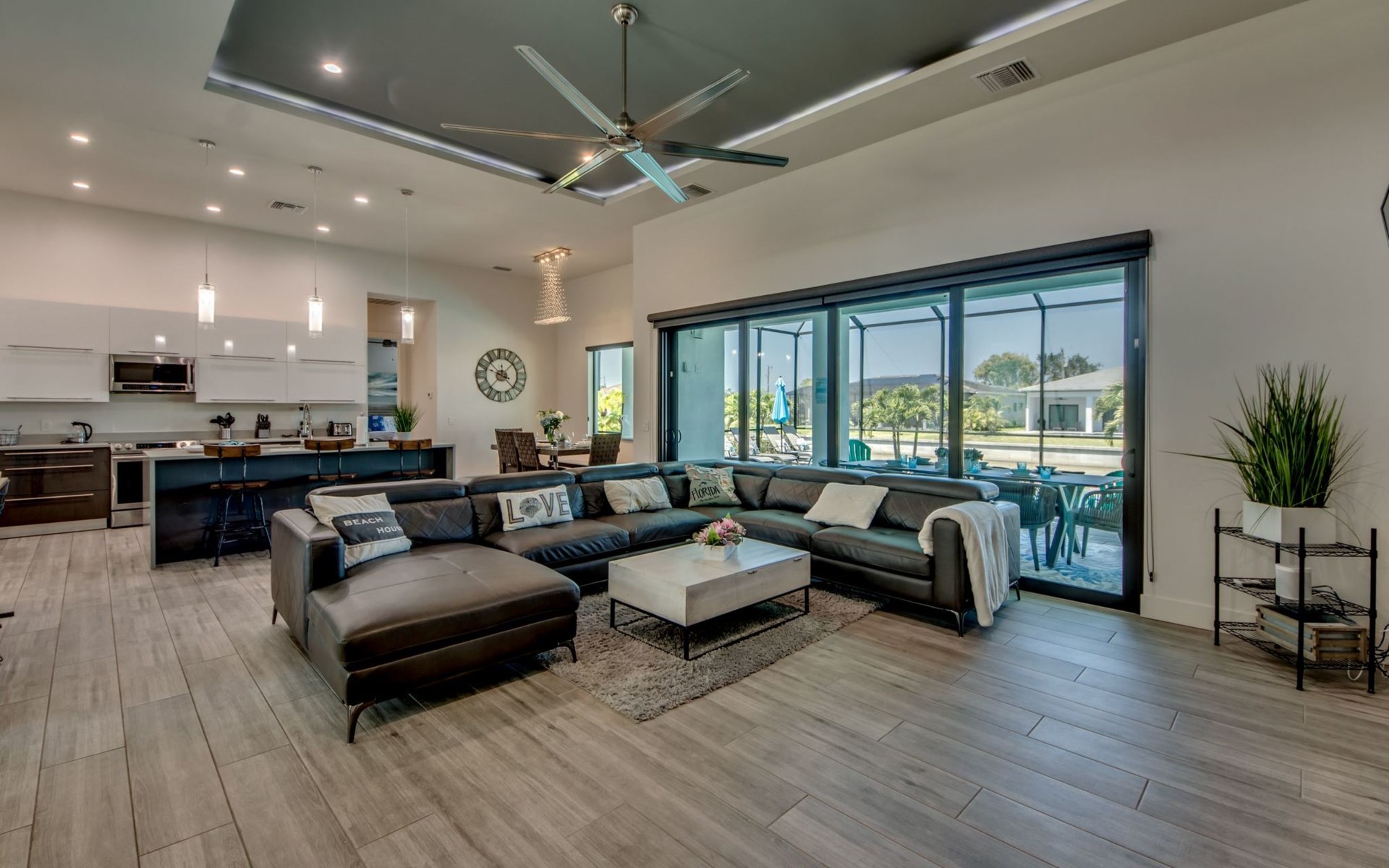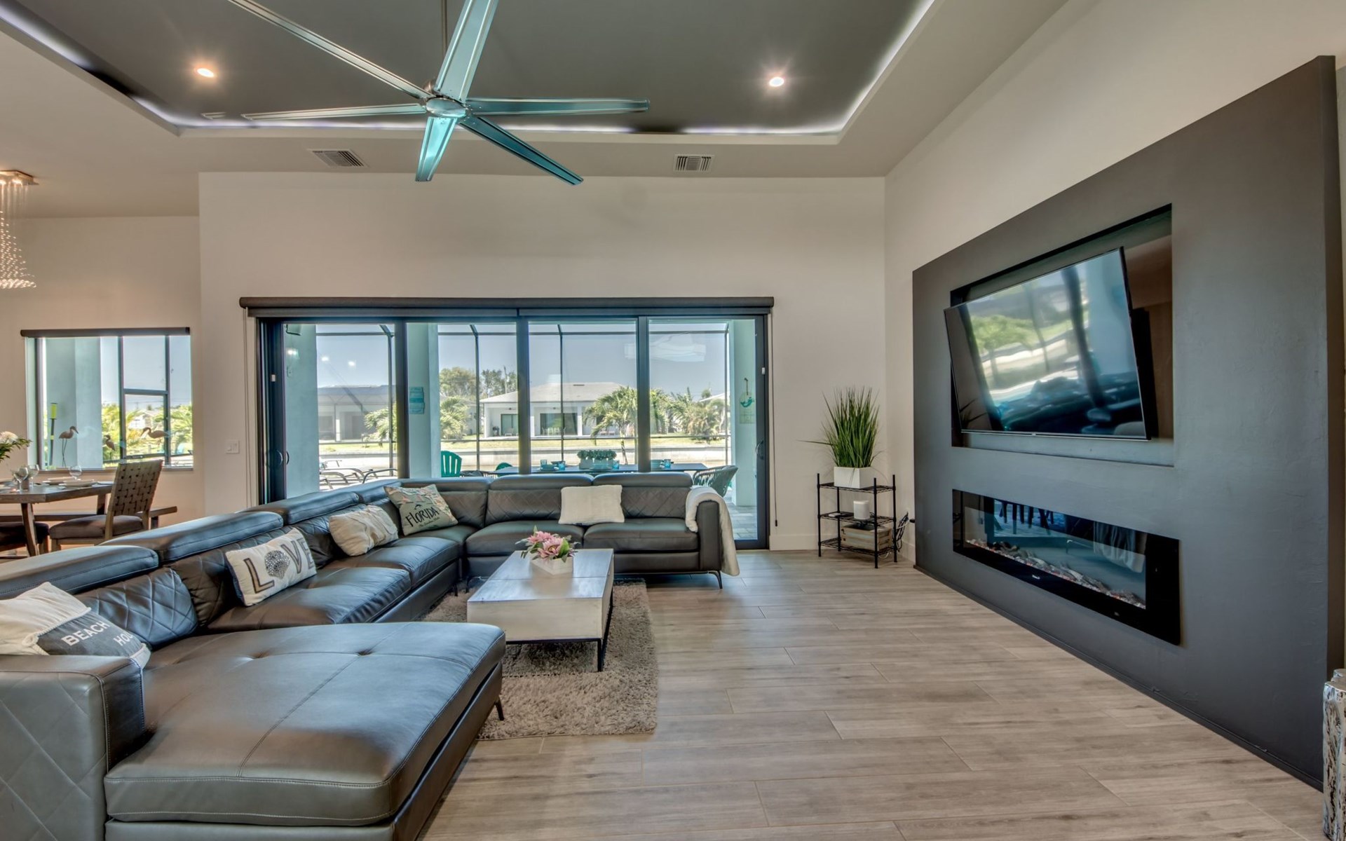 The Villa Maui with heated private pool in the holiday resort of Cape Coral on the west coast of Florida invites you to enjoy a holiday with state-of-the-art facilities and pure luxury in an excellent location with many excursion and shopping opportunities nearby.the Villa Maui was only built in 2019 in a modern style. It is located in a quiet area directly on a south-west facing canal, where you can enjoy the sunset with a view over the canal and experience a wonderful holiday on the Gulf Coast of Florida. Experience the best comfort for your relaxing holiday.Villa Maui is on one level and is approx. 204m² in size.The large, open-plan living room is located in the centre of the house with the open-plan kitchen and spacious dining area. The high ceilings and large windows give the rooms a spacious and bright feel. An oversized fan hangs from the ceiling in the living room.In the living room you will find a large lounge area and a large Smart TV as well as a fireplace.In the open, fully equipped kitchen you will find, among other things:- microwave- oven- French door fridge with freezer compartment and ice cube maker- Food processor- Egg cooker- Nespresso Vertuo coffee machine- Keurig coffee machine- Filter coffee machine- Milk frother- Pots, pans, crockery, cutlery, glasses etc.- Dishwasher- Kettle- Children's crockery and cutleryThe dining area easily seats up to 7-8 people.The windows in the living room and dining area can be blacked out. This ensures privacy, sun protection and privacy at all times.The so-called MASTER AREA is located in the right-hand area.In the master bedroom you have a king-size bed, smart TV, fan, direct pool access and access to the master bathroom. The doors in the master bedroom have electric darkening and an alarm that can be activated if necessary (children).In the master bathroom with natural light, you can shower comfortably in the walk-in rain shower and take a cosy bath in the free-standing bathtub. 2 washbasins, drawers, make-up mirror, hairdryer, towels, bath towels and a separate toilet complete the offer.There are 2 guest rooms and the guest bathroom on the left-hand side of the house.Guest room 1:- large double bed- Access to the pool area- Electric darkening of the doors- Alarm on the doors if required- Smart TV- built-in wardrobe- fanGuest room 2:- large double bed- window- fan- Smart TV- built-in wardrobeGuest bathroom:- Toilet- Walk-in shower with rain shower- Hand towels- Bath towels- Washbasin- Storage facilities- Hairdryer- make-up mirrorOffice/ 3rd guest room- Pull-out sofa- Writing desk- chair- Fan- Blackout blinds on the windowsOf course, we also have something for our younger guests:- free baby cot- baby monitor- high chair- children's cutleryThe Loundry contains the following:- Washing machine- tumble dryer- Ironing board and iron- Hoover- Shopping baskets and bagsThe house has central air conditioning.The pool area is easily accessible from the living room. Experience a breathtaking view over the wide freshwater canal. The plot has beautiful palm trees and we have planted a palm hedge to the neighbouring properties.The heated pool is over 9 metres long and invites you to splash around and relax. The pool area is completely enclosed by a screen. This keeps the mosquitoes away.There are plenty of new sun loungers, cushions and parasols around the pool. A weekly pool service ensures good water quality.A new outdoor kitchen with barbecue, fridge and shelves makes for great barbecue evenings by the pool. Enjoy marvellous sunsets with a view over the canal. Sun worshippers will get their money's worth thanks to the good south-west orientation.There is also a lounge area. A large dining area for up to 10 people and ceiling fans on the terrace round off the offer.New: we have had hurricane shutters installed on the terrace. The shutters not only protect against the storm, but our guests can also adjust them electrically to protect them from the sun, rain and wind on the terrace. Enjoy your holiday to the full.New: TV on the terrace, watch TV in the pool!Bath towels, towels and bed linen are included in the price. Beach chairs and umbrellas for your beach visit can be used free of charge.You can park your car safely in the garage.Please note that security cameras are installed in front of the house at the garage and entrance for your safety. It is not permitted to tamper with the electrics, Wi-Fi router or TV sets!-You can easily access the pool area from the living room. Experience a breathtaking view over the wide fresh water channel. The plot has beautiful palm trees and we have planted a palm hedge to the neighbouring properties.The heated pool is over 9 metres long and invites you to splash around and relax. The pool area is completely enclosed by a screen. This keeps the mosquitoes away.There are plenty of new sun loungers, cushions and parasols around the pool. A weekly pool service ensures good water quality.A new outdoor kitchen with barbecue, fridge and shelves makes for great barbecue evenings by the pool. Enjoy marvellous sunsets with a view over the canal. Sun worshippers will get their money's worth thanks to the good south-west orientation.There is also a lounge area. A large dining area for up to 10 people and ceiling fans on the terrace round off the offer.New: we have had hurricane shutters installed on the terrace. The shutters not only protect against the storm, but our guests can also adjust them electrically to protect them from the sun, rain and wind on the terrace. Enjoy your holiday to the full.Bath towels, towels and bed linen are included in the price. Beach chairs and umbrellas for your beach visit can be used free of charge.The screen protects you from mosquitoes on the terrace.Sunshades, sunbeds and bath towels are available for free use in the house.Various toys and air mattresses may be available on site and a lounge area has been integrated.The front garden was also embellished in October 2021 with new plants an