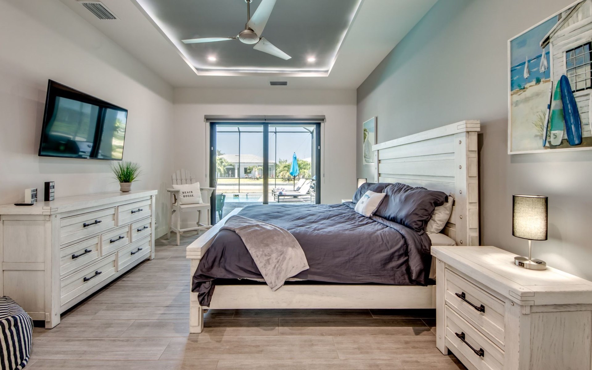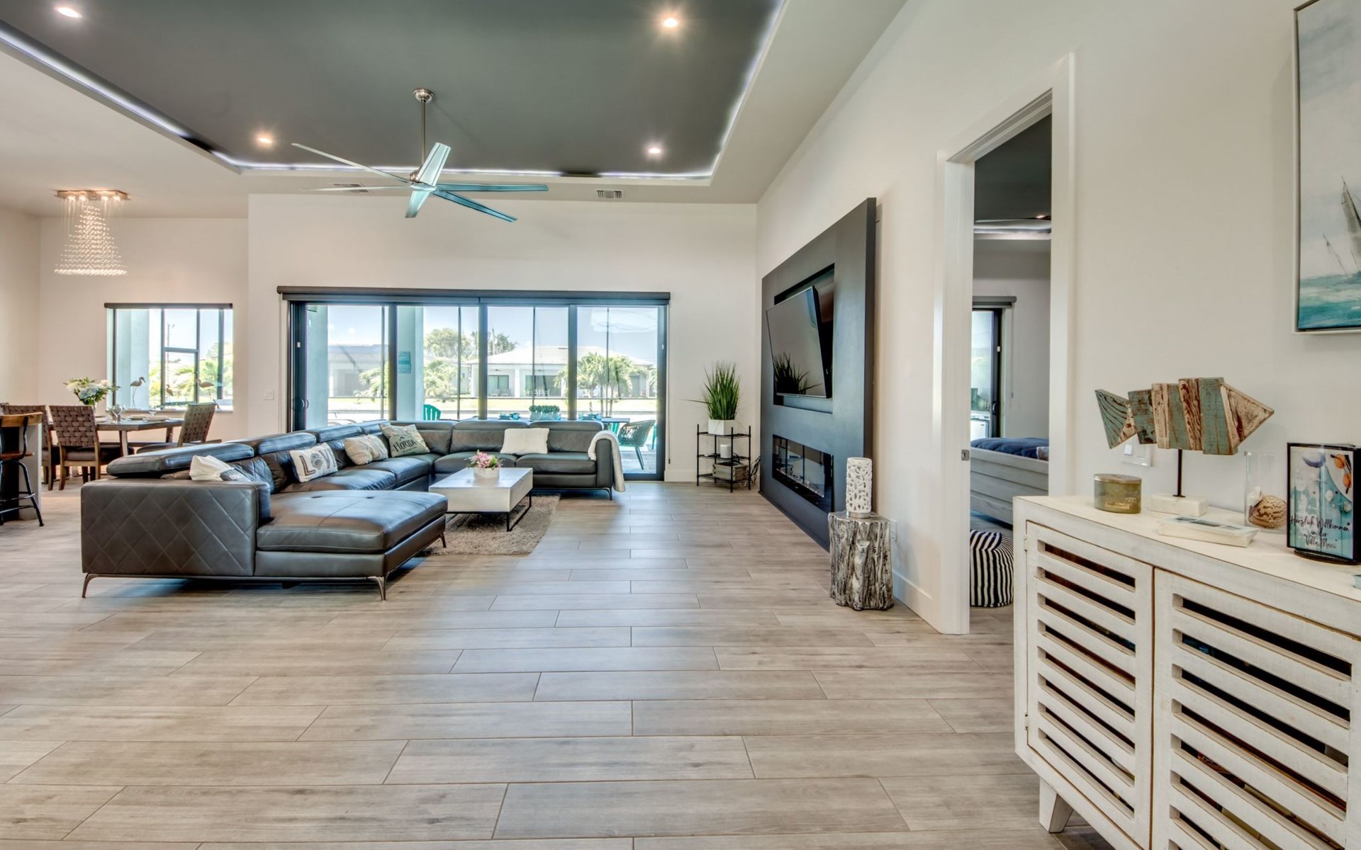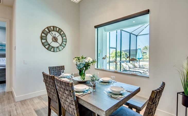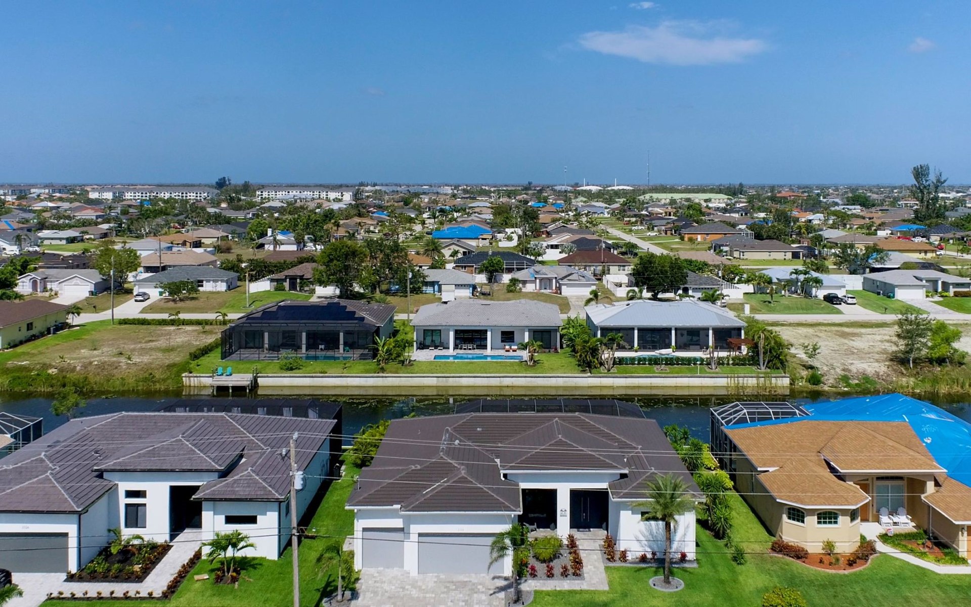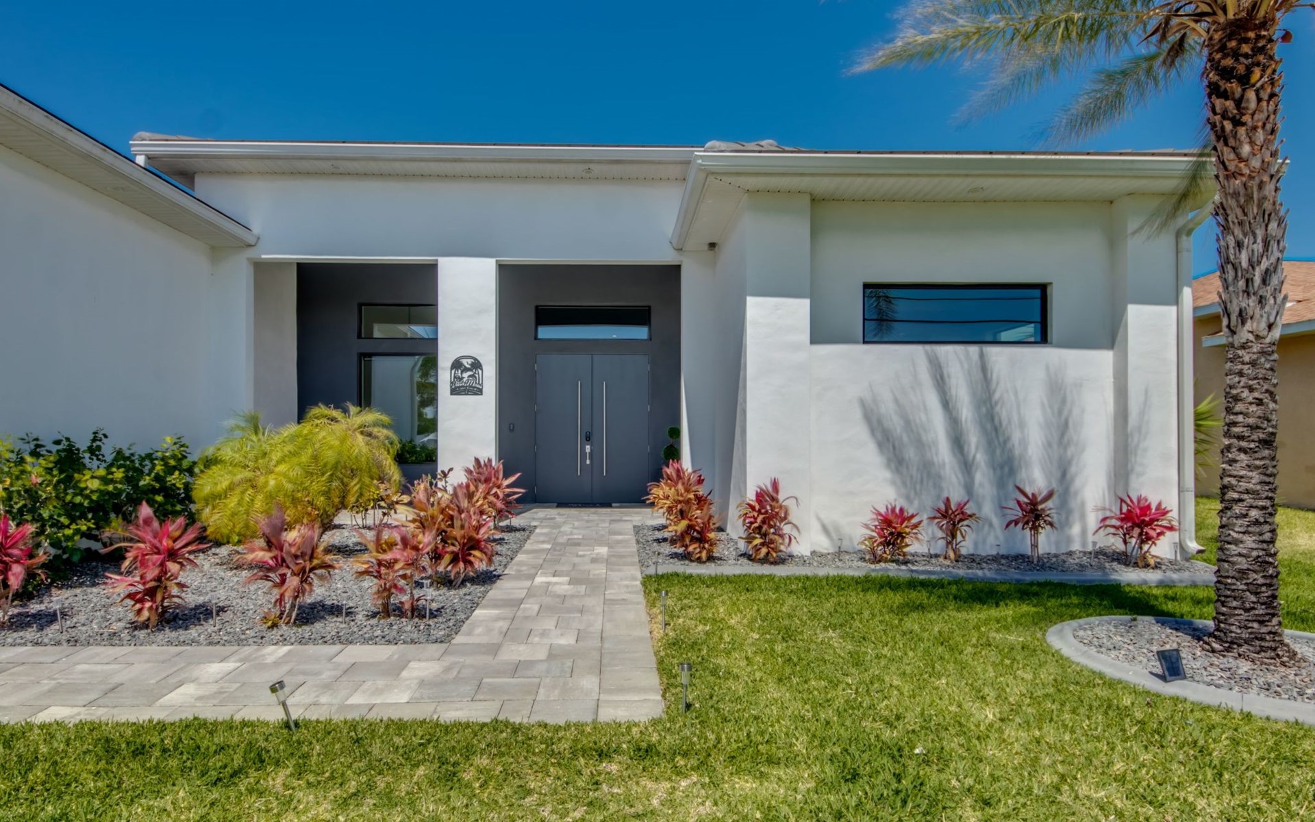 The Villa Maui with heated private pool in the holiday resort of Cape Coral on the west coast of Florida invites you to enjoy a holiday with state-of-the-art facilities and pure luxury in an excellent location with many excursion and shopping opportunities nearby.the Villa Maui was only built in 2019 in a modern style. It is located in a quiet area directly on a south-west facing canal, where you can enjoy the sunset with a view over the canal and experience a wonderful holiday on the Gulf Coast of Florida. Experience the best comfort for your relaxing holiday.Villa Maui is on one level and is approx. 204m² in size.The large, open-plan living room is located in the centre of the house with the open-plan kitchen and spacious dining area. The high ceilings and large windows give the rooms a spacious and bright feel. An oversized fan hangs from the ceiling in the living room.In the living room you will find a large lounge area and a large Smart TV as well as a fireplace.In the open, fully equipped kitchen you will find, among other things:- microwave- oven- French door fridge with freezer compartment and ice cube maker- Food processor- Egg cooker- Nespresso Vertuo coffee machine- Keurig coffee machine- Filter coffee machine- Milk frother- Pots, pans, crockery, cutlery, glasses etc.- Dishwasher- Kettle- Children's crockery and cutleryThe dining area easily seats up to 7-8 people.The windows in the living room and dining area can be blacked out. This ensures privacy, sun protection and privacy at all times.The so-called MASTER AREA is located in the right-hand area.In the master bedroom you have a king-size bed, smart TV, fan, direct pool access and access to the master bathroom. The doors in the master bedroom have electric darkening and an alarm that can be activated if necessary (children).In the master bathroom with natural light, you can shower comfortably in the walk-in rain shower and take a cosy bath in the free-standing bathtub. 2 washbasins, drawers, make-up mirror, hairdryer, towels, bath towels and a separate toilet complete the offer.There are 2 guest rooms and the guest bathroom on the left-hand side of the house.Guest room 1:- large double bed- Access to the pool area- Electric darkening of the doors- Alarm on the doors if required- Smart TV- built-in wardrobe- fanGuest room 2:- large double bed- window- fan- Smart TV- built-in wardrobeGuest bathroom:- Toilet- Walk-in shower with rain shower- Hand towels- Bath towels- Washbasin- Storage facilities- Hairdryer- make-up mirrorOffice/ 3rd guest room- Pull-out sofa- Writing desk- chair- Fan- Blackout blinds on the windowsOf course, we also have something for our younger guests:- free baby cot- baby monitor- high chair- children's cutleryThe Loundry contains the following:- Washing machine- tumble dryer- Ironing board and iron- Hoover- Shopping baskets and bagsThe house has central air conditioning.The pool area is easily accessible from the living room. Experience a breathtaking view over the wide freshwater canal. The plot has beautiful palm trees and we have planted a palm hedge to the neighbouring properties.The heated pool is over 9 metres long and invites you to splash around and relax. The pool area is completely enclosed by a screen. This keeps the mosquitoes away.There are plenty of new sun loungers, cushions and parasols around the pool. A weekly pool service ensures good water quality.A new outdoor kitchen with barbecue, fridge and shelves makes for great barbecue evenings by the pool. Enjoy marvellous sunsets with a view over the canal. Sun worshippers will get their money's worth thanks to the good south-west orientation.There is also a lounge area. A large dining area for up to 10 people and ceiling fans on the terrace round off the offer.New: we have had hurricane shutters installed on the terrace. The shutters not only protect against the storm, but our guests can also adjust them electrically to protect them from the sun, rain and wind on the terrace. Enjoy your holiday to the full.New: TV on the terrace, watch TV in the pool!Bath towels, towels and bed linen are included in the price. Beach chairs and umbrellas for your beach visit can be used free of charge.You can park your car safely in the garage.Please note that security cameras are installed in front of the house at the garage and entrance for your safety. It is not permitted to tamper with the electrics, Wi-Fi router or TV sets!-You can easily access the pool area from the living room. Experience a breathtaking view over the wide fresh water channel. The plot has beautiful palm trees and we have planted a palm hedge to the neighbouring properties.The heated pool is over 9 metres long and invites you to splash around and relax. The pool area is completely enclosed by a screen. This keeps the mosquitoes away.There are plenty of new sun loungers, cushions and parasols around the pool. A weekly pool service ensures good water quality.A new outdoor kitchen with barbecue, fridge and shelves makes for great barbecue evenings by the pool. Enjoy marvellous sunsets with a view over the canal. Sun worshippers will get their money's worth thanks to the good south-west orientation.There is also a lounge area. A large dining area for up to 10 people and ceiling fans on the terrace round off the offer.New: we have had hurricane shutters installed on the terrace. The shutters not only protect against the storm, but our guests can also adjust them electrically to protect them from the sun, rain and wind on the terrace. Enjoy your holiday to the full.Bath towels, towels and bed linen are included in the price. Beach chairs and umbrellas for your beach visit can be used free of charge.The screen protects you from mosquitoes on the terrace.Sunshades, sunbeds and bath towels are available for free use in the house.Various toys and air mattresses may be available on site and a lounge area has been integrated.The front garden was also embellished in October 2021 with new plants an