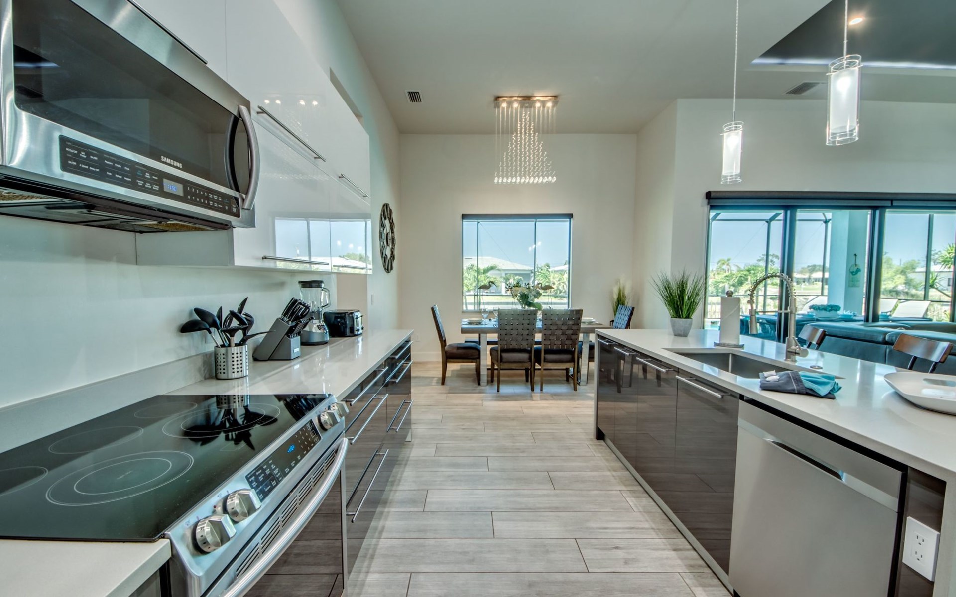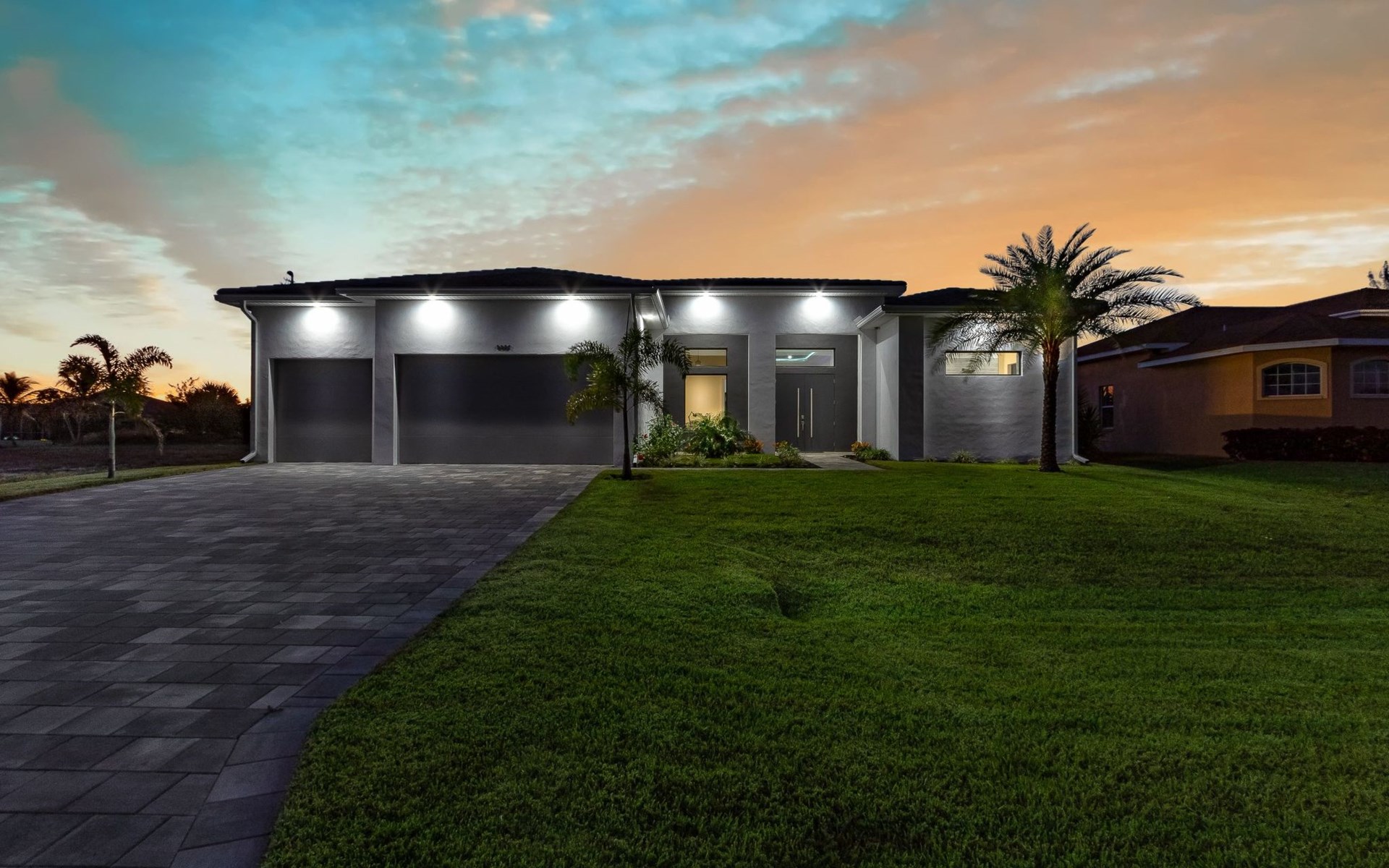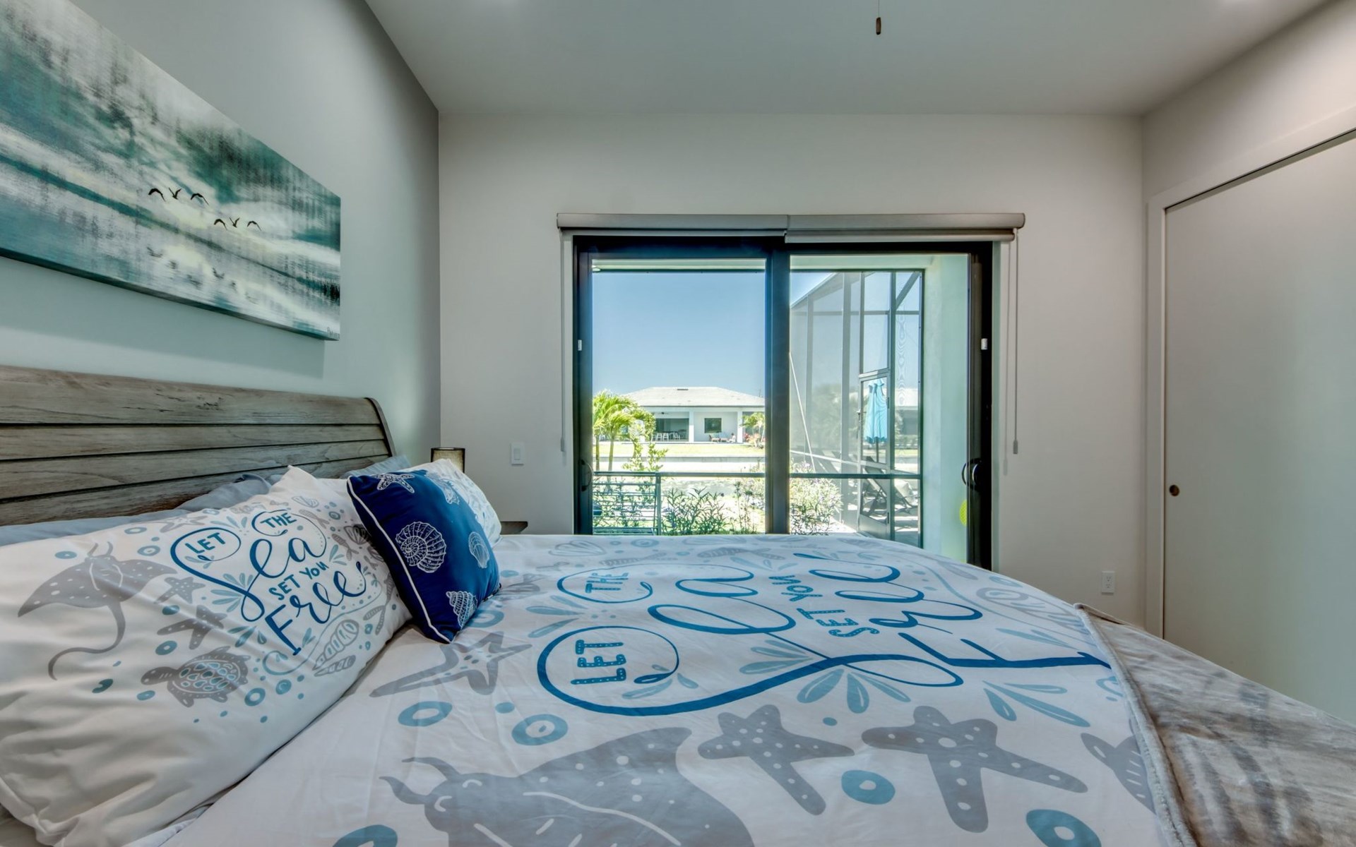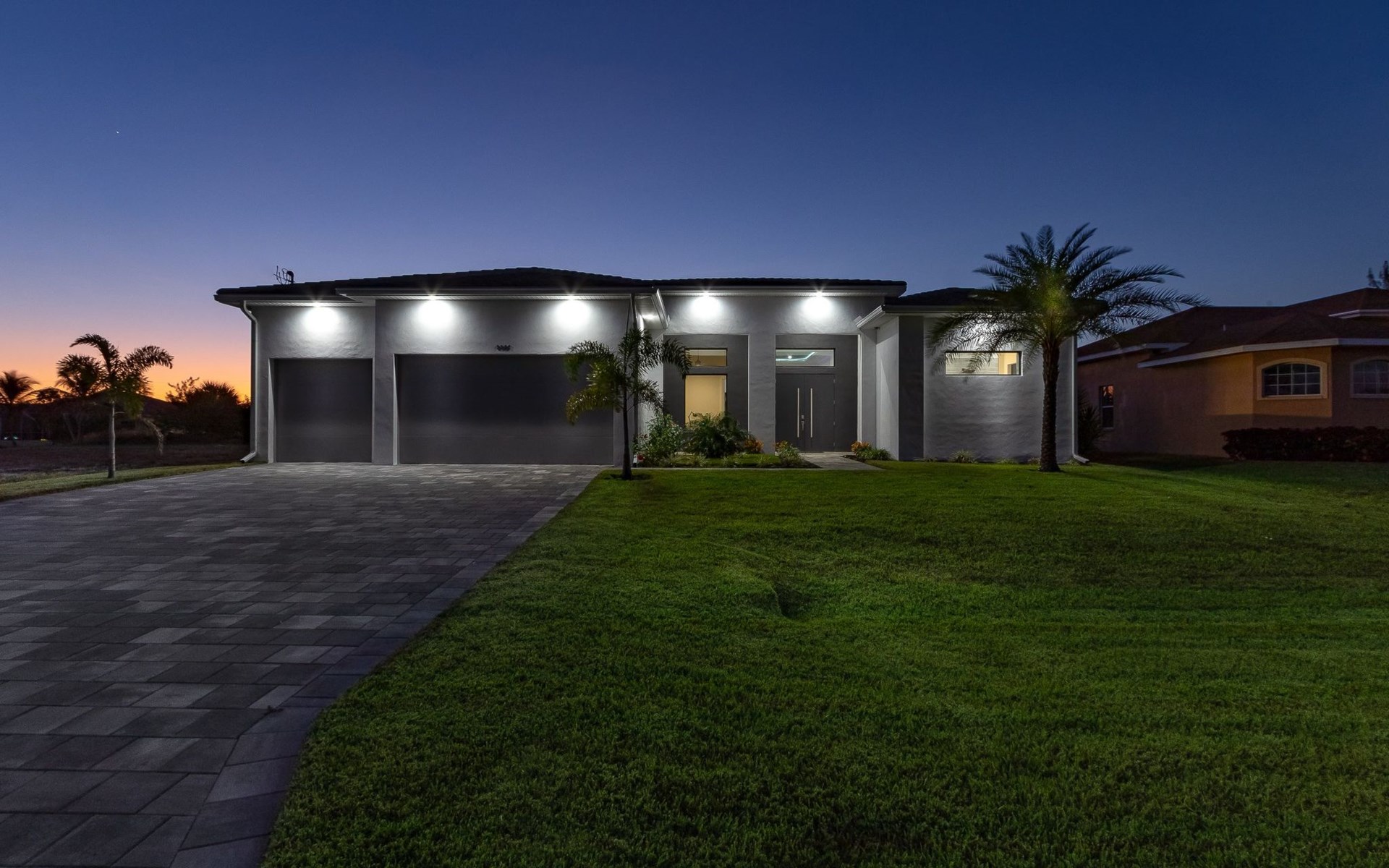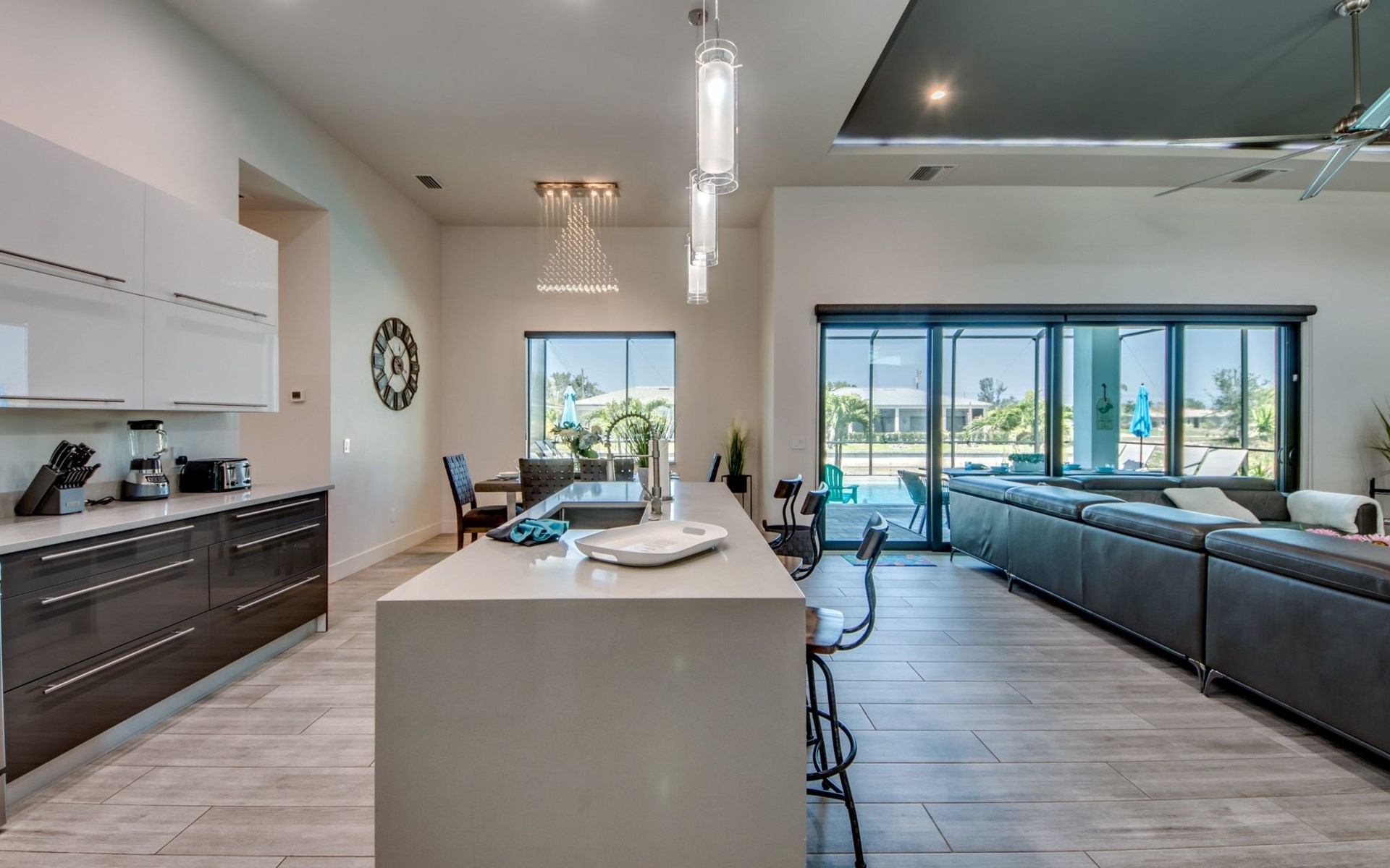 The Villa Maui with heated private pool in the holiday resort of Cape Coral on the west coast of Florida invites you to enjoy a holiday with state-of-the-art facilities and pure luxury in an excellent location with many excursion and shopping opportunities nearby.the Villa Maui was only built in 2019 in a modern style. It is located in a quiet area directly on a south-west facing canal, where you can enjoy the sunset with a view over the canal and experience a wonderful holiday on the Gulf Coast of Florida. Experience the best comfort for your relaxing holiday.Villa Maui is on one level and is approx. 204m² in size.The large, open-plan living room is located in the centre of the house with the open-plan kitchen and spacious dining area. The high ceilings and large windows give the rooms a spacious and bright feel. An oversized fan hangs from the ceiling in the living room.In the living room you will find a large lounge area and a large Smart TV as well as a fireplace.In the open, fully equipped kitchen you will find, among other things:- microwave- oven- French door fridge with freezer compartment and ice cube maker- Food processor- Egg cooker- Nespresso Vertuo coffee machine- Keurig coffee machine- Filter coffee machine- Milk frother- Pots, pans, crockery, cutlery, glasses etc.- Dishwasher- Kettle- Children's crockery and cutleryThe dining area easily seats up to 7-8 people.The windows in the living room and dining area can be blacked out. This ensures privacy, sun protection and privacy at all times.The so-called MASTER AREA is located in the right-hand area.In the master bedroom you have a king-size bed, smart TV, fan, direct pool access and access to the master bathroom. The doors in the master bedroom have electric darkening and an alarm that can be activated if necessary (children).In the master bathroom with natural light, you can shower comfortably in the walk-in rain shower and take a cosy bath in the free-standing bathtub. 2 washbasins, drawers, make-up mirror, hairdryer, towels, bath towels and a separate toilet complete the offer.There are 2 guest rooms and the guest bathroom on the left-hand side of the house.Guest room 1:- large double bed- Access to the pool area- Electric darkening of the doors- Alarm on the doors if required- Smart TV- built-in wardrobe- fanGuest room 2:- large double bed- window- fan- Smart TV- built-in wardrobeGuest bathroom:- Toilet- Walk-in shower with rain shower- Hand towels- Bath towels- Washbasin- Storage facilities- Hairdryer- make-up mirrorOffice/ 3rd guest room- Pull-out sofa- Writing desk- chair- Fan- Blackout blinds on the windowsOf course, we also have something for our younger guests:- free baby cot- baby monitor- high chair- children's cutleryThe Loundry contains the following:- Washing machine- tumble dryer- Ironing board and iron- Hoover- Shopping baskets and bagsThe house has central air conditioning.The pool area is easily accessible from the living room. Experience a breathtaking view over the wide freshwater canal. The plot has beautiful palm trees and we have planted a palm hedge to the neighbouring properties.The heated pool is over 9 metres long and invites you to splash around and relax. The pool area is completely enclosed by a screen. This keeps the mosquitoes away.There are plenty of new sun loungers, cushions and parasols around the pool. A weekly pool service ensures good water quality.A new outdoor kitchen with barbecue, fridge and shelves makes for great barbecue evenings by the pool. Enjoy marvellous sunsets with a view over the canal. Sun worshippers will get their money's worth thanks to the good south-west orientation.There is also a lounge area. A large dining area for up to 10 people and ceiling fans on the terrace round off the offer.New: we have had hurricane shutters installed on the terrace. The shutters not only protect against the storm, but our guests can also adjust them electrically to protect them from the sun, rain and wind on the terrace. Enjoy your holiday to the full.New: TV on the terrace, watch TV in the pool!Bath towels, towels and bed linen are included in the price. Beach chairs and umbrellas for your beach visit can be used free of charge.You can park your car safely in the garage.Please note that security cameras are installed in front of the house at the garage and entrance for your safety. It is not permitted to tamper with the electrics, Wi-Fi router or TV sets!-You can easily access the pool area from the living room. Experience a breathtaking view over the wide fresh water channel. The plot has beautiful palm trees and we have planted a palm hedge to the neighbouring properties.The heated pool is over 9 metres long and invites you to splash around and relax. The pool area is completely enclosed by a screen. This keeps the mosquitoes away.There are plenty of new sun loungers, cushions and parasols around the pool. A weekly pool service ensures good water quality.A new outdoor kitchen with barbecue, fridge and shelves makes for great barbecue evenings by the pool. Enjoy marvellous sunsets with a view over the canal. Sun worshippers will get their money's worth thanks to the good south-west orientation.There is also a lounge area. A large dining area for up to 10 people and ceiling fans on the terrace round off the offer.New: we have had hurricane shutters installed on the terrace. The shutters not only protect against the storm, but our guests can also adjust them electrically to protect them from the sun, rain and wind on the terrace. Enjoy your holiday to the full.Bath towels, towels and bed linen are included in the price. Beach chairs and umbrellas for your beach visit can be used free of charge.The screen protects you from mosquitoes on the terrace.Sunshades, sunbeds and bath towels are available for free use in the house.Various toys and air mattresses may be available on site and a lounge area has been integrated.The front garden was also embellished in October 2021 with new plants an