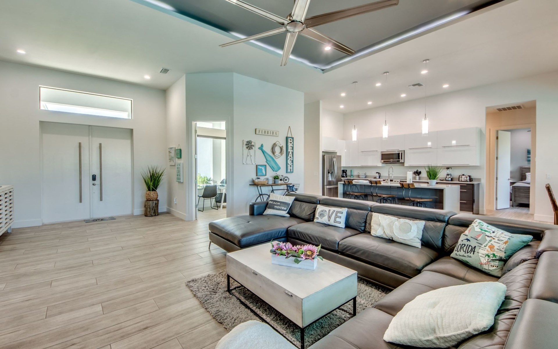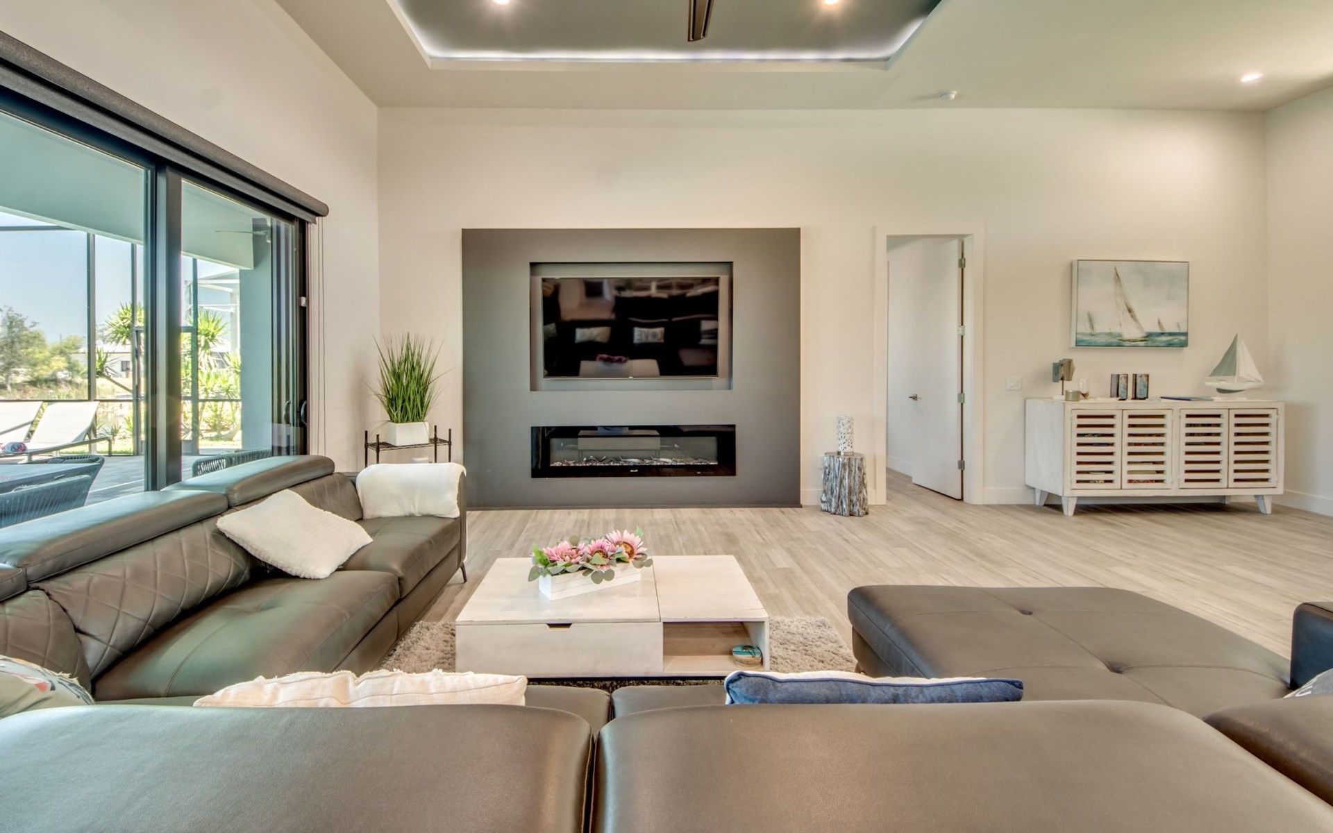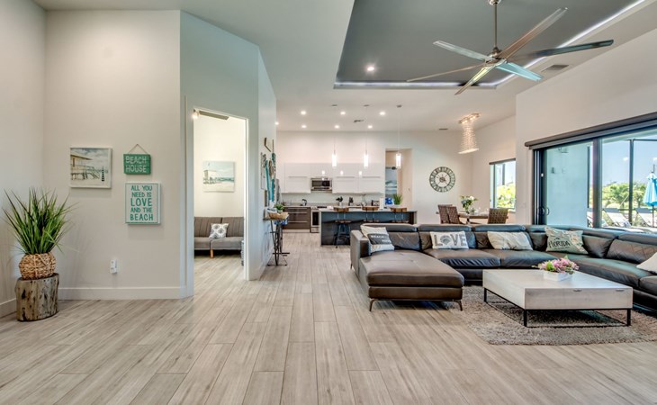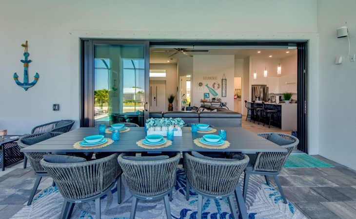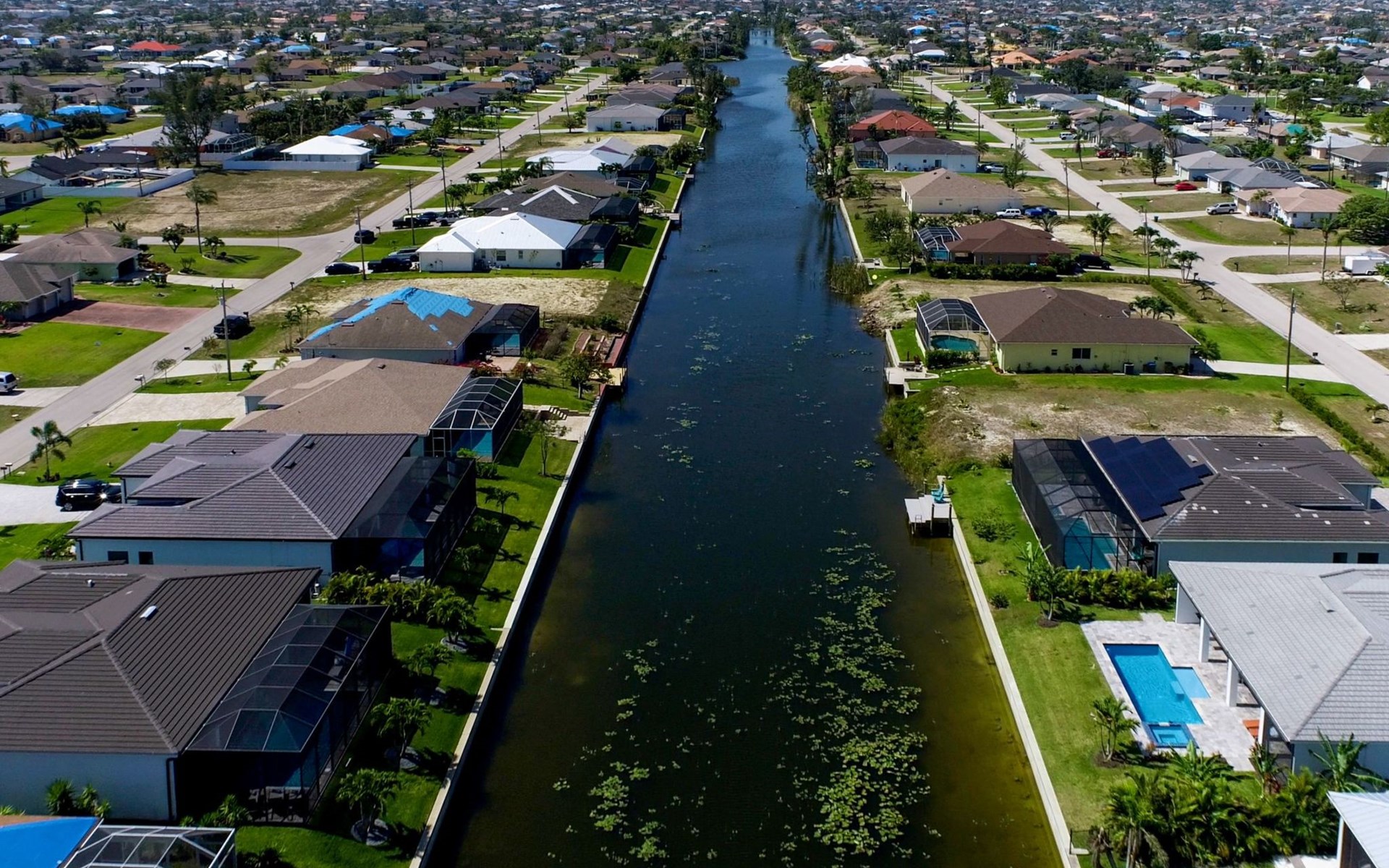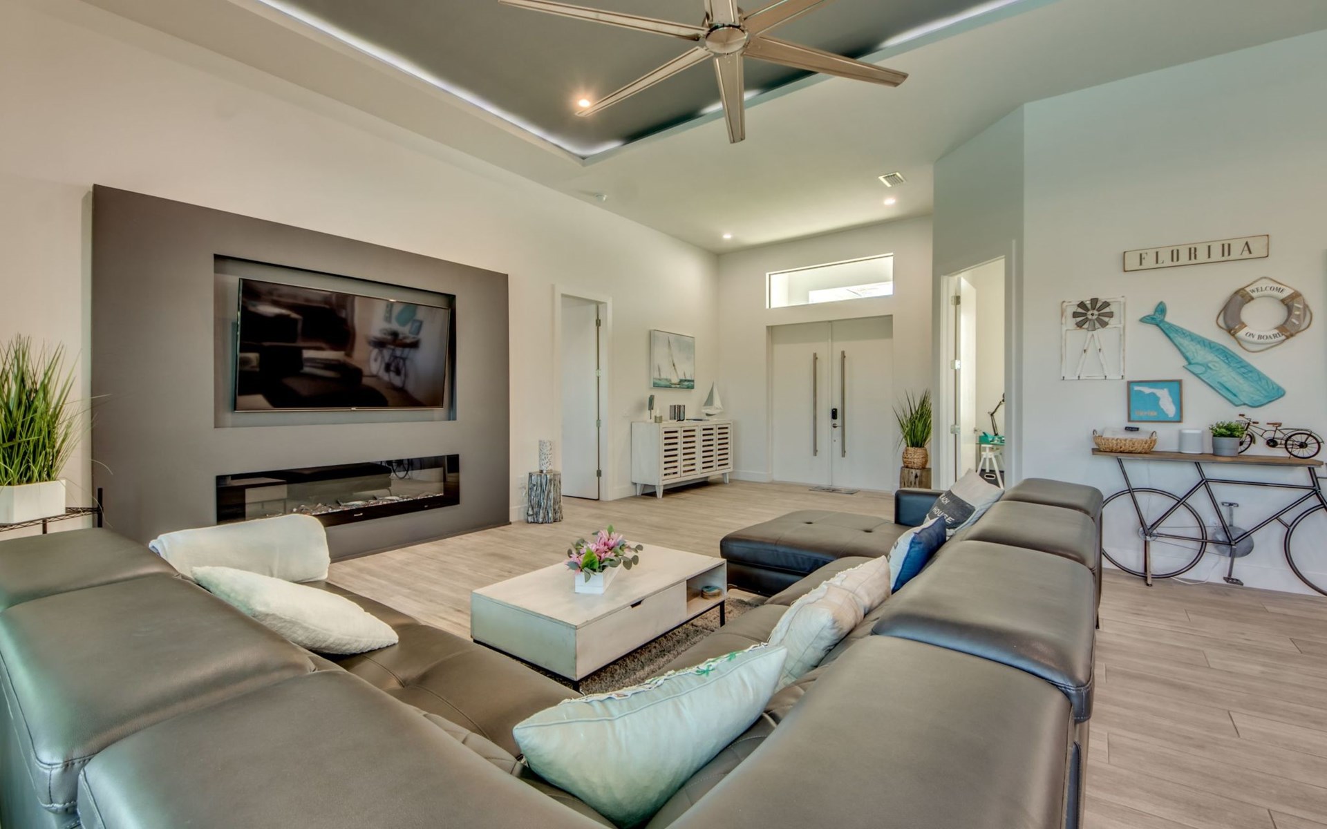 The Villa Maui with heated private pool in the holiday resort of Cape Coral on the west coast of Florida invites you to enjoy a holiday with state-of-the-art facilities and pure luxury in an excellent location with many excursion and shopping opportunities nearby.the Villa Maui was only built in 2019 in a modern style. It is located in a quiet area directly on a south-west facing canal, where you can enjoy the sunset with a view over the canal and experience a wonderful holiday on the Gulf Coast of Florida. Experience the best comfort for your relaxing holiday.Villa Maui is on one level and is approx. 204m² in size.The large, open-plan living room is located in the centre of the house with the open-plan kitchen and spacious dining area. The high ceilings and large windows give the rooms a spacious and bright feel. An oversized fan hangs from the ceiling in the living room.In the living room you will find a large lounge area and a large Smart TV as well as a fireplace.In the open, fully equipped kitchen you will find, among other things:- microwave- oven- French door fridge with freezer compartment and ice cube maker- Food processor- Egg cooker- Nespresso Vertuo coffee machine- Keurig coffee machine- Filter coffee machine- Milk frother- Pots, pans, crockery, cutlery, glasses etc.- Dishwasher- Kettle- Children's crockery and cutleryThe dining area easily seats up to 7-8 people.The windows in the living room and dining area can be blacked out. This ensures privacy, sun protection and privacy at all times.The so-called MASTER AREA is located in the right-hand area.In the master bedroom you have a king-size bed, smart TV, fan, direct pool access and access to the master bathroom. The doors in the master bedroom have electric darkening and an alarm that can be activated if necessary (children).In the master bathroom with natural light, you can shower comfortably in the walk-in rain shower and take a cosy bath in the free-standing bathtub. 2 washbasins, drawers, make-up mirror, hairdryer, towels, bath towels and a separate toilet complete the offer.There are 2 guest rooms and the guest bathroom on the left-hand side of the house.Guest room 1:- large double bed- Access to the pool area- Electric darkening of the doors- Alarm on the doors if required- Smart TV- built-in wardrobe- fanGuest room 2:- large double bed- window- fan- Smart TV- built-in wardrobeGuest bathroom:- Toilet- Walk-in shower with rain shower- Hand towels- Bath towels- Washbasin- Storage facilities- Hairdryer- make-up mirrorOffice/ 3rd guest room- Pull-out sofa- Writing desk- chair- Fan- Blackout blinds on the windowsOf course, we also have something for our younger guests:- free baby cot- baby monitor- high chair- children's cutleryThe Loundry contains the following:- Washing machine- tumble dryer- Ironing board and iron- Hoover- Shopping baskets and bagsThe house has central air conditioning.The pool area is easily accessible from the living room. Experience a breathtaking view over the wide freshwater canal. The plot has beautiful palm trees and we have planted a palm hedge to the neighbouring properties.The heated pool is over 9 metres long and invites you to splash around and relax. The pool area is completely enclosed by a screen. This keeps the mosquitoes away.There are plenty of new sun loungers, cushions and parasols around the pool. A weekly pool service ensures good water quality.A new outdoor kitchen with barbecue, fridge and shelves makes for great barbecue evenings by the pool. Enjoy marvellous sunsets with a view over the canal. Sun worshippers will get their money's worth thanks to the good south-west orientation.There is also a lounge area. A large dining area for up to 10 people and ceiling fans on the terrace round off the offer.New: we have had hurricane shutters installed on the terrace. The shutters not only protect against the storm, but our guests can also adjust them electrically to protect them from the sun, rain and wind on the terrace. Enjoy your holiday to the full.New: TV on the terrace, watch TV in the pool!Bath towels, towels and bed linen are included in the price. Beach chairs and umbrellas for your beach visit can be used free of charge.You can park your car safely in the garage.Please note that security cameras are installed in front of the house at the garage and entrance for your safety. It is not permitted to tamper with the electrics, Wi-Fi router or TV sets!-You can easily access the pool area from the living room. Experience a breathtaking view over the wide fresh water channel. The plot has beautiful palm trees and we have planted a palm hedge to the neighbouring properties.The heated pool is over 9 metres long and invites you to splash around and relax. The pool area is completely enclosed by a screen. This keeps the mosquitoes away.There are plenty of new sun loungers, cushions and parasols around the pool. A weekly pool service ensures good water quality.A new outdoor kitchen with barbecue, fridge and shelves makes for great barbecue evenings by the pool. Enjoy marvellous sunsets with a view over the canal. Sun worshippers will get their money's worth thanks to the good south-west orientation.There is also a lounge area. A large dining area for up to 10 people and ceiling fans on the terrace round off the offer.New: we have had hurricane shutters installed on the terrace. The shutters not only protect against the storm, but our guests can also adjust them electrically to protect them from the sun, rain and wind on the terrace. Enjoy your holiday to the full.Bath towels, towels and bed linen are included in the price. Beach chairs and umbrellas for your beach visit can be used free of charge.The screen protects you from mosquitoes on the terrace.Sunshades, sunbeds and bath towels are available for free use in the house.Various toys and air mattresses may be available on site and a lounge area has been integrated.The front garden was also embellished in October 2021 with new plants an