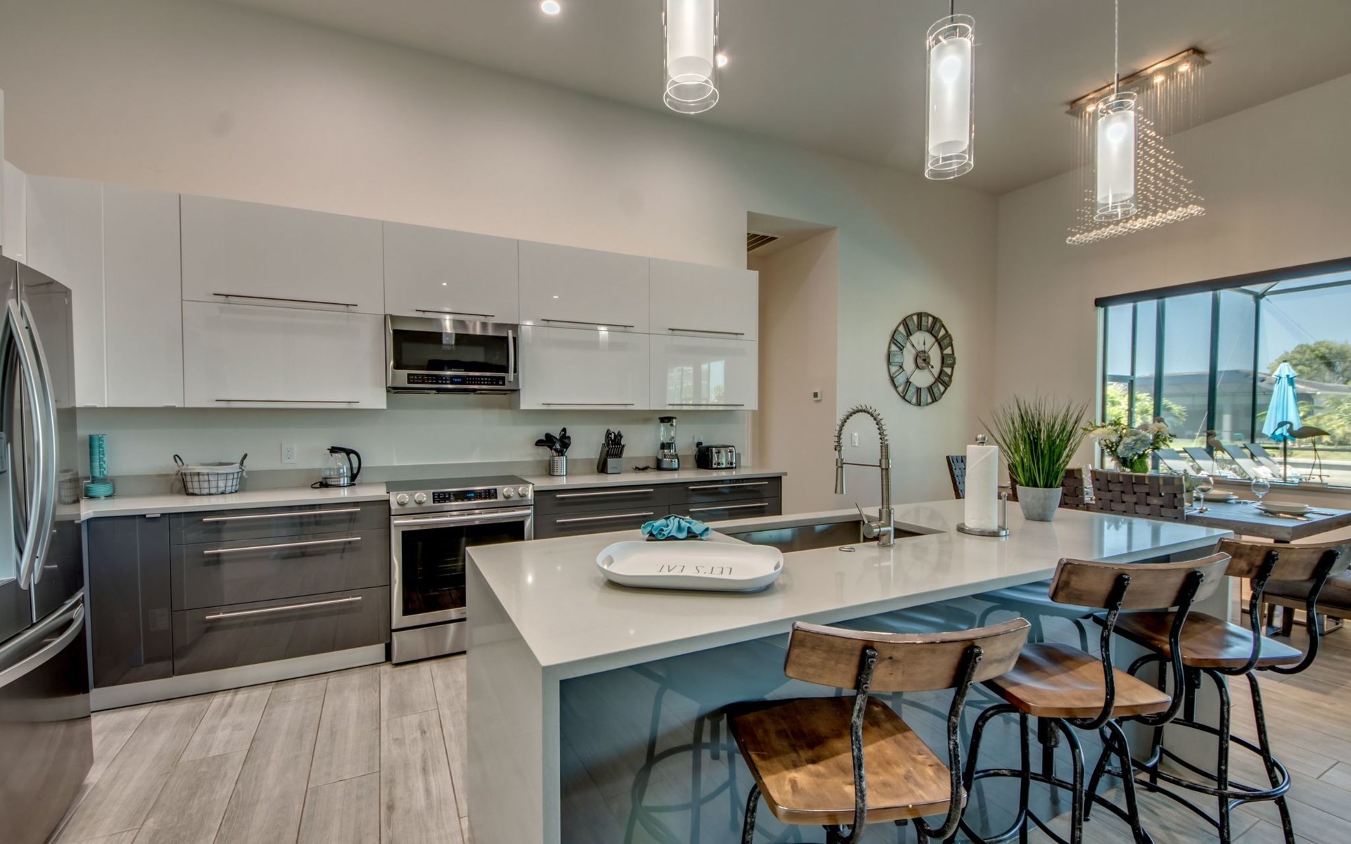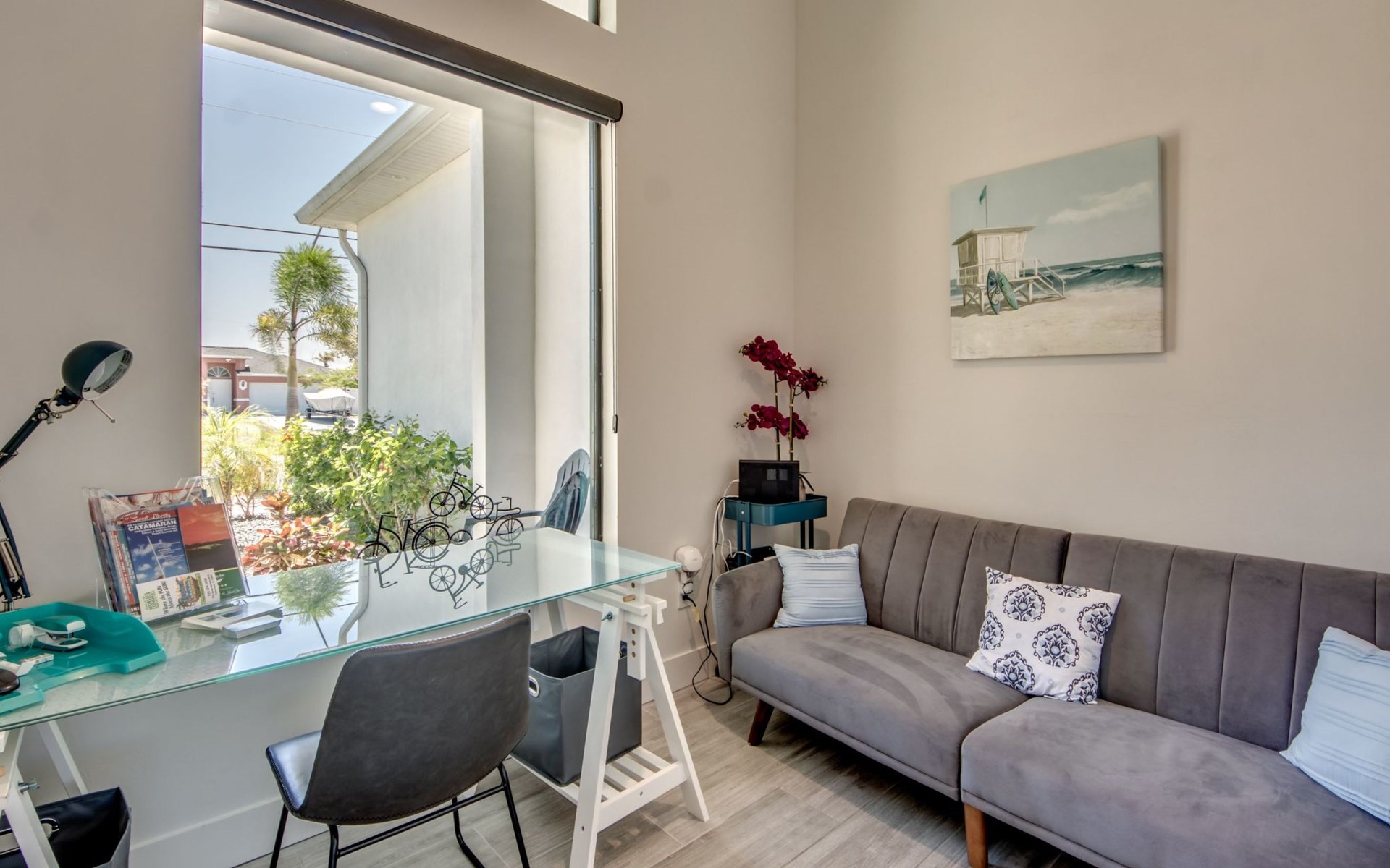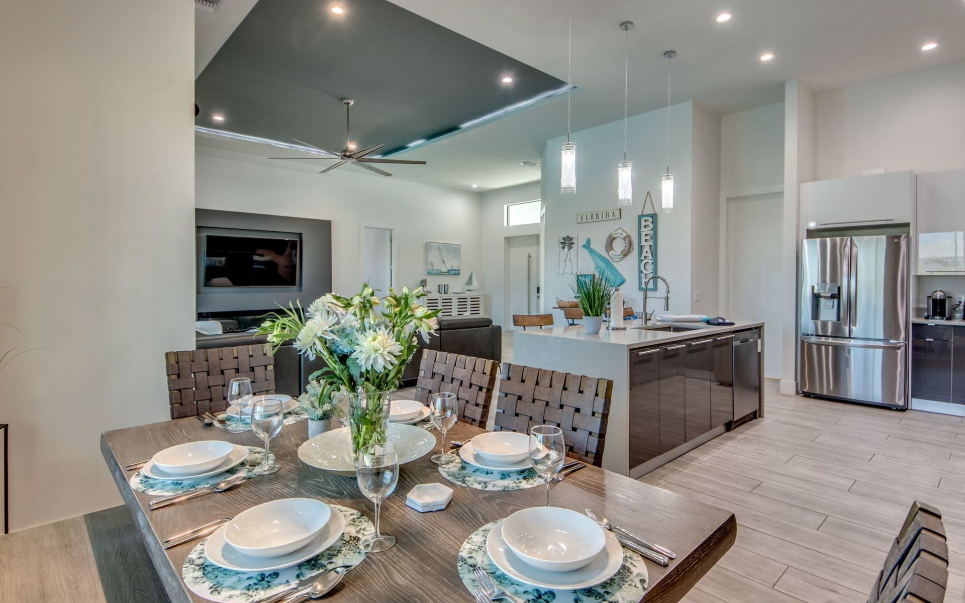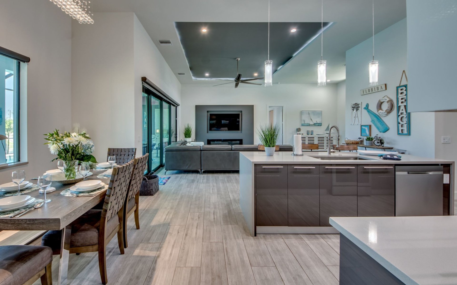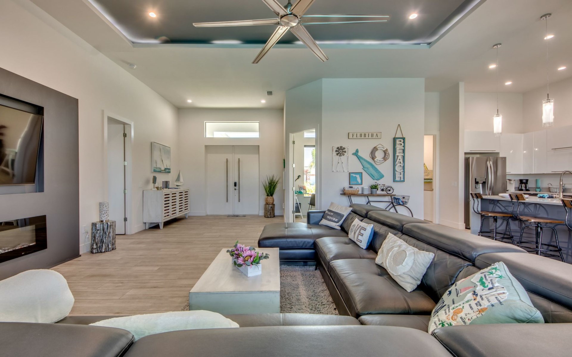 The Villa Maui with heated private pool in the holiday resort of Cape Coral on the west coast of Florida invites you to enjoy a holiday with state-of-the-art facilities and pure luxury in an excellent location with many excursion and shopping opportunities nearby.the Villa Maui was only built in 2019 in a modern style. It is located in a quiet area directly on a south-west facing canal, where you can enjoy the sunset with a view over the canal and experience a wonderful holiday on the Gulf Coast of Florida. Experience the best comfort for your relaxing holiday.Villa Maui is on one level and is approx. 204m² in size.The large, open-plan living room is located in the centre of the house with the open-plan kitchen and spacious dining area. The high ceilings and large windows give the rooms a spacious and bright feel. An oversized fan hangs from the ceiling in the living room.In the living room you will find a large lounge area and a large Smart TV as well as a fireplace.In the open, fully equipped kitchen you will find, among other things:- microwave- oven- French door fridge with freezer compartment and ice cube maker- Food processor- Egg cooker- Nespresso Vertuo coffee machine- Keurig coffee machine- Filter coffee machine- Milk frother- Pots, pans, crockery, cutlery, glasses etc.- Dishwasher- Kettle- Children's crockery and cutleryThe dining area easily seats up to 7-8 people.The windows in the living room and dining area can be blacked out. This ensures privacy, sun protection and privacy at all times.The so-called MASTER AREA is located in the right-hand area.In the master bedroom you have a king-size bed, smart TV, fan, direct pool access and access to the master bathroom. The doors in the master bedroom have electric darkening and an alarm that can be activated if necessary (children).In the master bathroom with natural light, you can shower comfortably in the walk-in rain shower and take a cosy bath in the free-standing bathtub. 2 washbasins, drawers, make-up mirror, hairdryer, towels, bath towels and a separate toilet complete the offer.There are 2 guest rooms and the guest bathroom on the left-hand side of the house.Guest room 1:- large double bed- Access to the pool area- Electric darkening of the doors- Alarm on the doors if required- Smart TV- built-in wardrobe- fanGuest room 2:- large double bed- window- fan- Smart TV- built-in wardrobeGuest bathroom:- Toilet- Walk-in shower with rain shower- Hand towels- Bath towels- Washbasin- Storage facilities- Hairdryer- make-up mirrorOffice/ 3rd guest room- Pull-out sofa- Writing desk- chair- Fan- Blackout blinds on the windowsOf course, we also have something for our younger guests:- free baby cot- baby monitor- high chair- children's cutleryThe Loundry contains the following:- Washing machine- tumble dryer- Ironing board and iron- Hoover- Shopping baskets and bagsThe house has central air conditioning.The pool area is easily accessible from the living room. Experience a breathtaking view over the wide freshwater canal. The plot has beautiful palm trees and we have planted a palm hedge to the neighbouring properties.The heated pool is over 9 metres long and invites you to splash around and relax. The pool area is completely enclosed by a screen. This keeps the mosquitoes away.There are plenty of new sun loungers, cushions and parasols around the pool. A weekly pool service ensures good water quality.A new outdoor kitchen with barbecue, fridge and shelves makes for great barbecue evenings by the pool. Enjoy marvellous sunsets with a view over the canal. Sun worshippers will get their money's worth thanks to the good south-west orientation.There is also a lounge area. A large dining area for up to 10 people and ceiling fans on the terrace round off the offer.New: we have had hurricane shutters installed on the terrace. The shutters not only protect against the storm, but our guests can also adjust them electrically to protect them from the sun, rain and wind on the terrace. Enjoy your holiday to the full.New: TV on the terrace, watch TV in the pool!Bath towels, towels and bed linen are included in the price. Beach chairs and umbrellas for your beach visit can be used free of charge.You can park your car safely in the garage.Please note that security cameras are installed in front of the house at the garage and entrance for your safety. It is not permitted to tamper with the electrics, Wi-Fi router or TV sets!-You can easily access the pool area from the living room. Experience a breathtaking view over the wide fresh water channel. The plot has beautiful palm trees and we have planted a palm hedge to the neighbouring properties.The heated pool is over 9 metres long and invites you to splash around and relax. The pool area is completely enclosed by a screen. This keeps the mosquitoes away.There are plenty of new sun loungers, cushions and parasols around the pool. A weekly pool service ensures good water quality.A new outdoor kitchen with barbecue, fridge and shelves makes for great barbecue evenings by the pool. Enjoy marvellous sunsets with a view over the canal. Sun worshippers will get their money's worth thanks to the good south-west orientation.There is also a lounge area. A large dining area for up to 10 people and ceiling fans on the terrace round off the offer.New: we have had hurricane shutters installed on the terrace. The shutters not only protect against the storm, but our guests can also adjust them electrically to protect them from the sun, rain and wind on the terrace. Enjoy your holiday to the full.Bath towels, towels and bed linen are included in the price. Beach chairs and umbrellas for your beach visit can be used free of charge.The screen protects you from mosquitoes on the terrace.Sunshades, sunbeds and bath towels are available for free use in the house.Various toys and air mattresses may be available on site and a lounge area has been integrated.The front garden was also embellished in October 2021 with new plants an