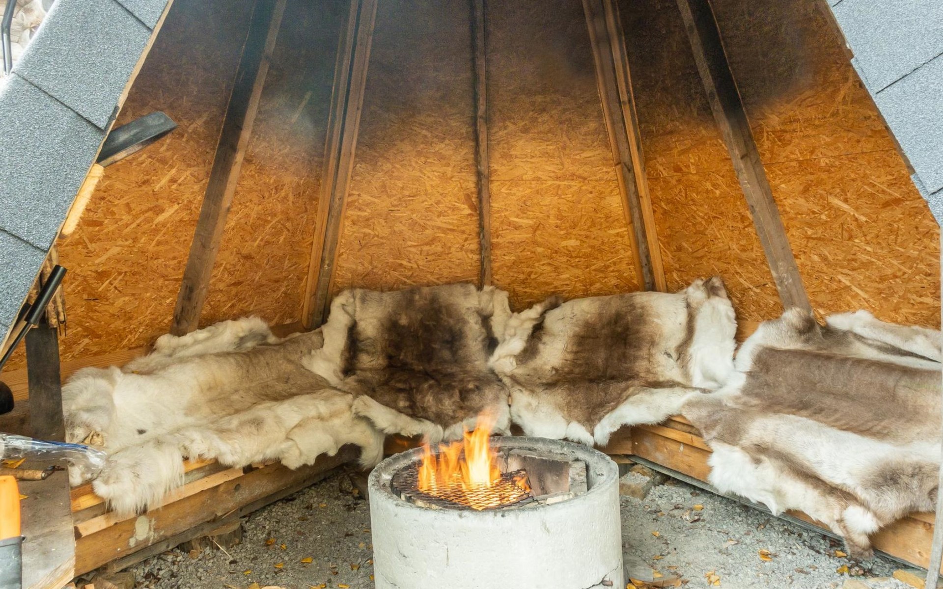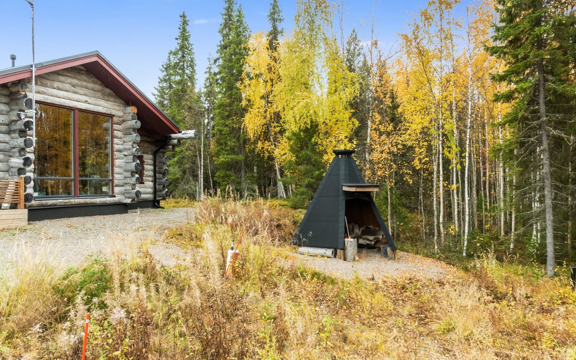 Teepee-style cooking hut, large parking space and paved driveway to the beach.