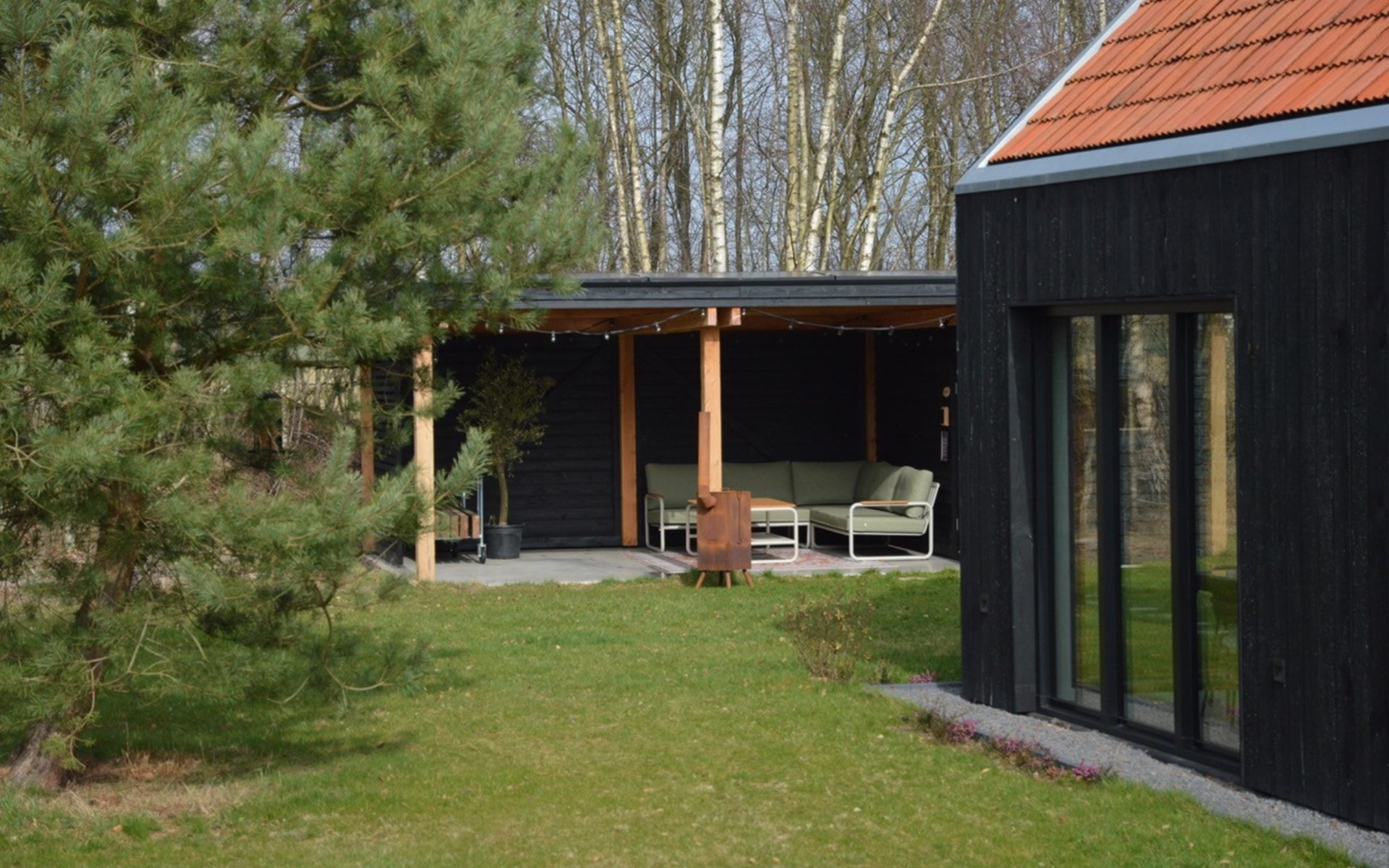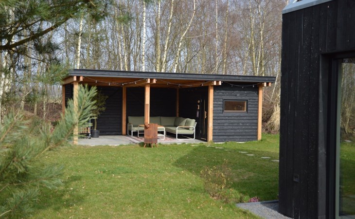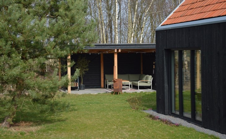 Via de openslaande deuren stap je zo de tuin in. Hier vind je een riante overkapping met een luxe loungeset, waar je beschut kunt zitten en de hele dag van de zon geniet. Op warme zomerdagen bieden de schaduwrijke plekken in de tuin heerlijke verkoeling. Er is een buiten houtkachel aanwezig die tevens dienst kan doen als barbecue.