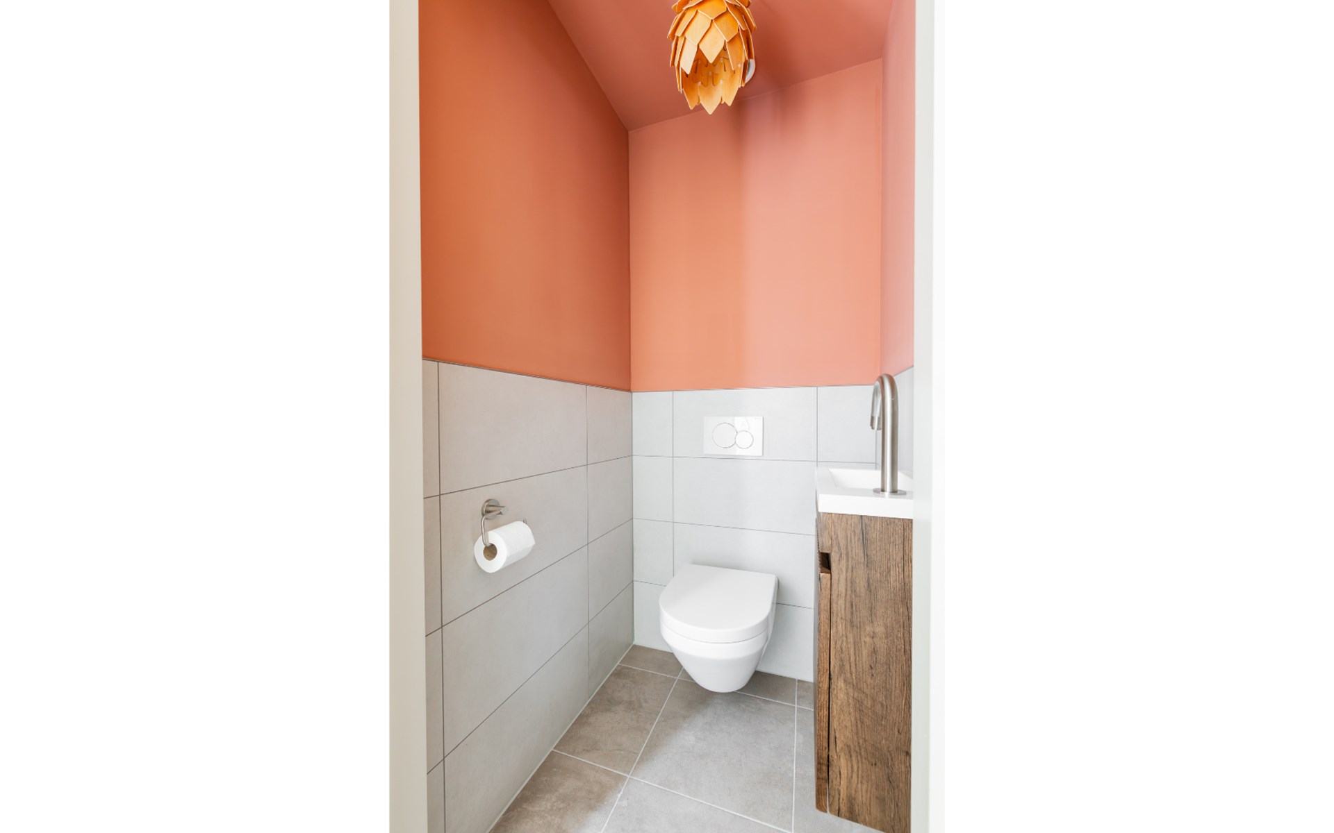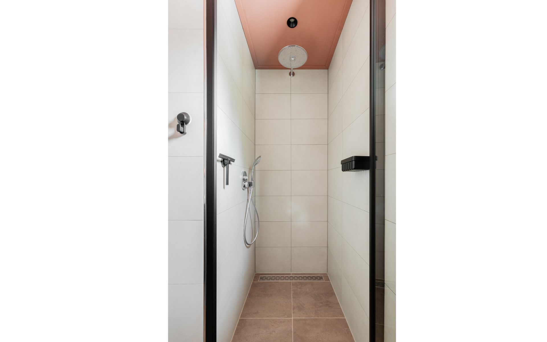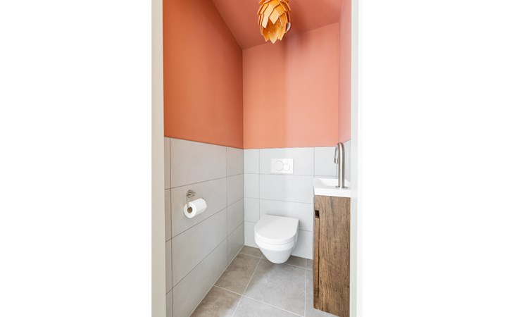 De luxe badkamer beschikt over een dubbele wastafel met veel opbergruimte, vloerverwarming en een moderne regendouche. Daarnaast is er een apart toilet.