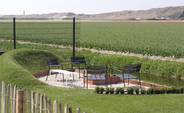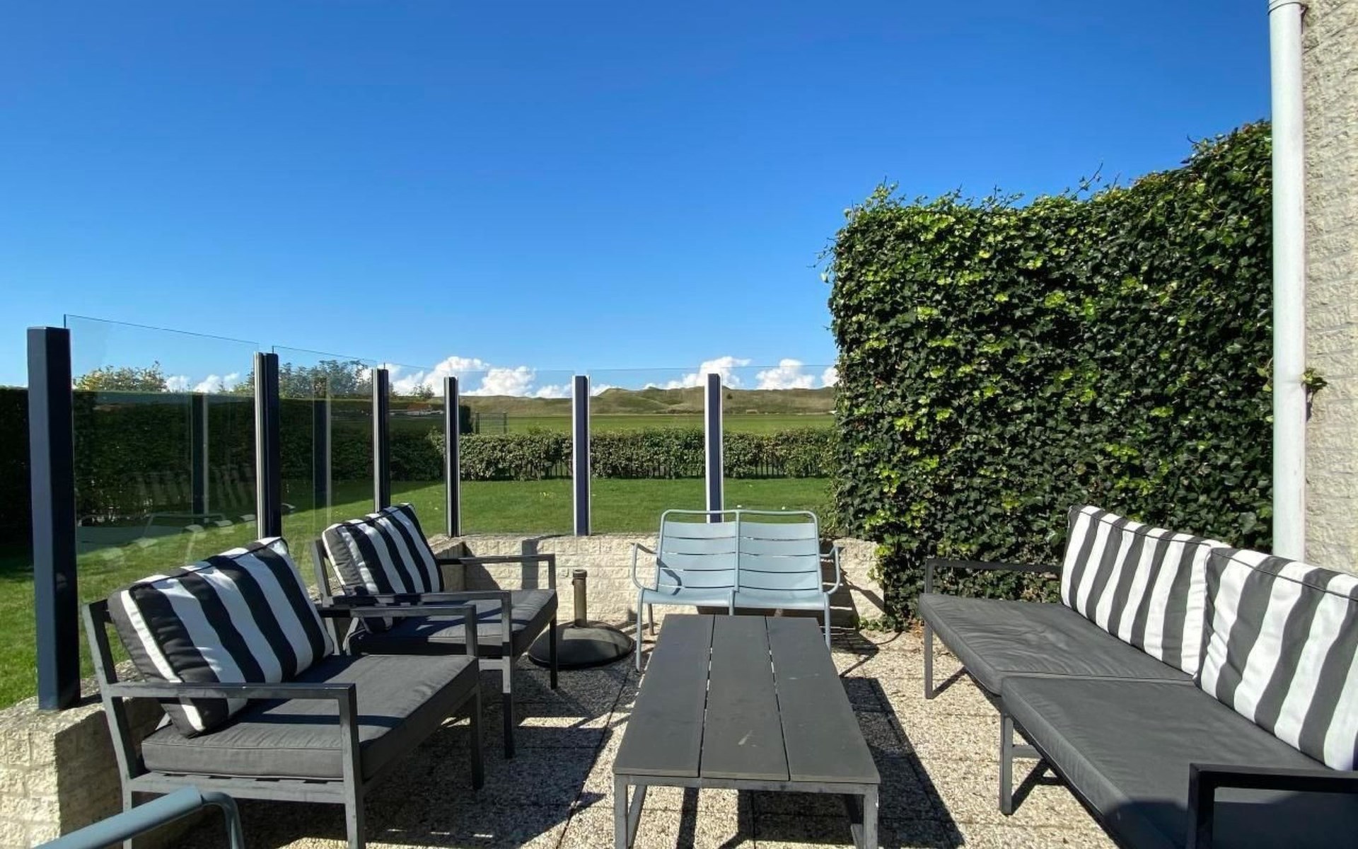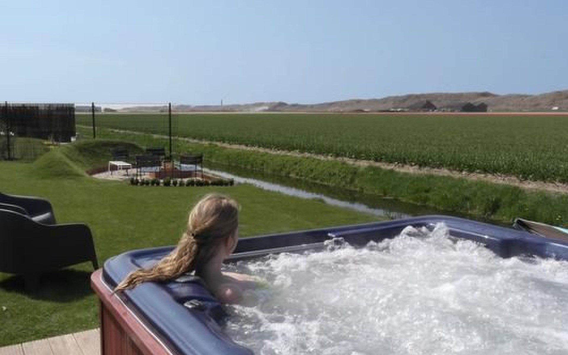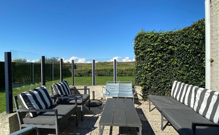Grote omheinde tuin met meerdere terrassen, windvang, lounge set, eettafel, ligstoelen, Weber barbecue en kampvuur plaats!