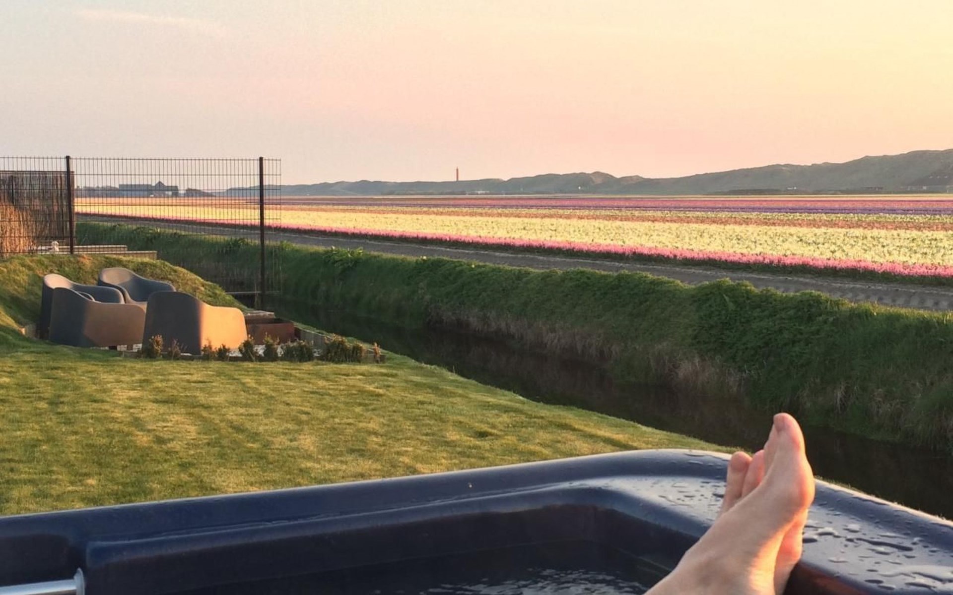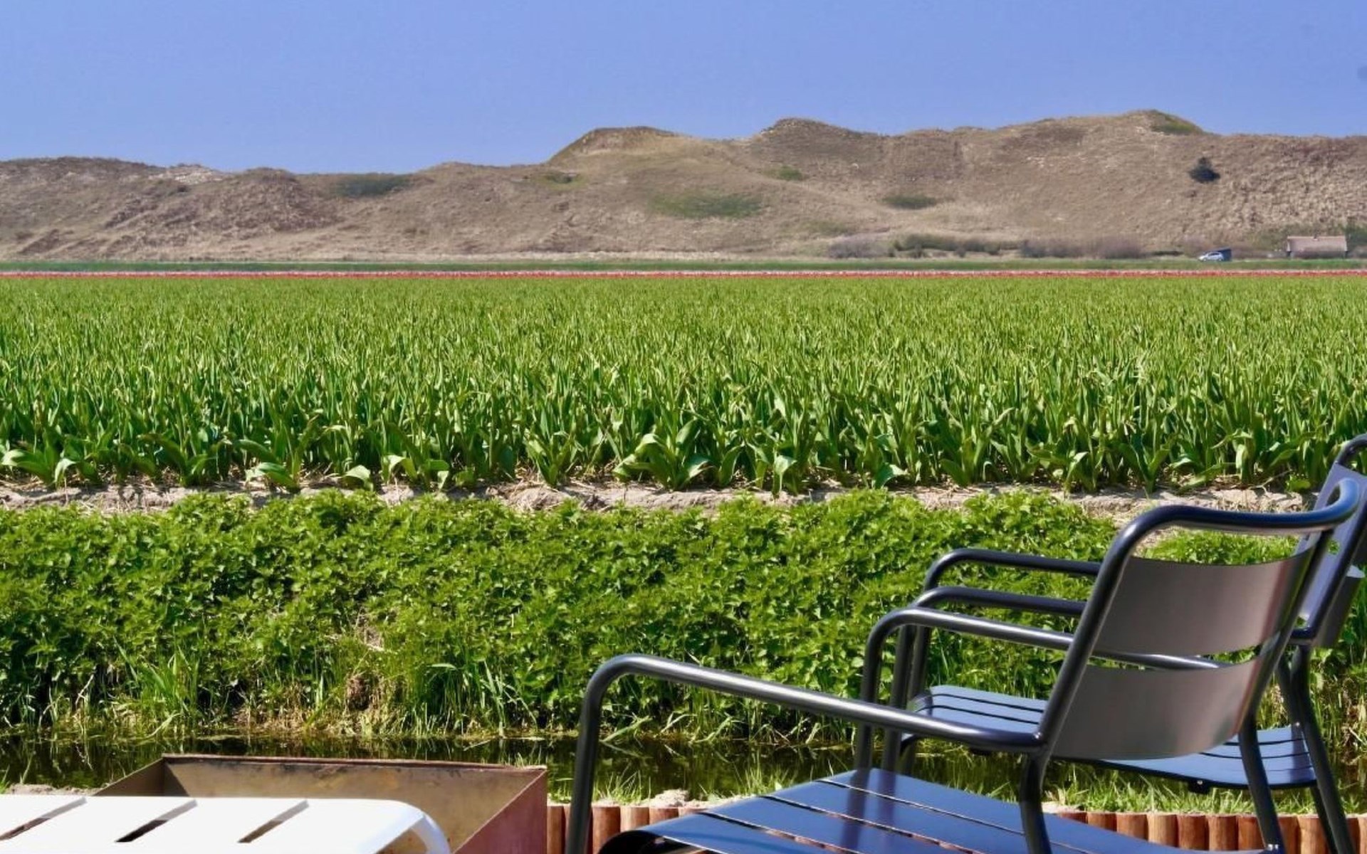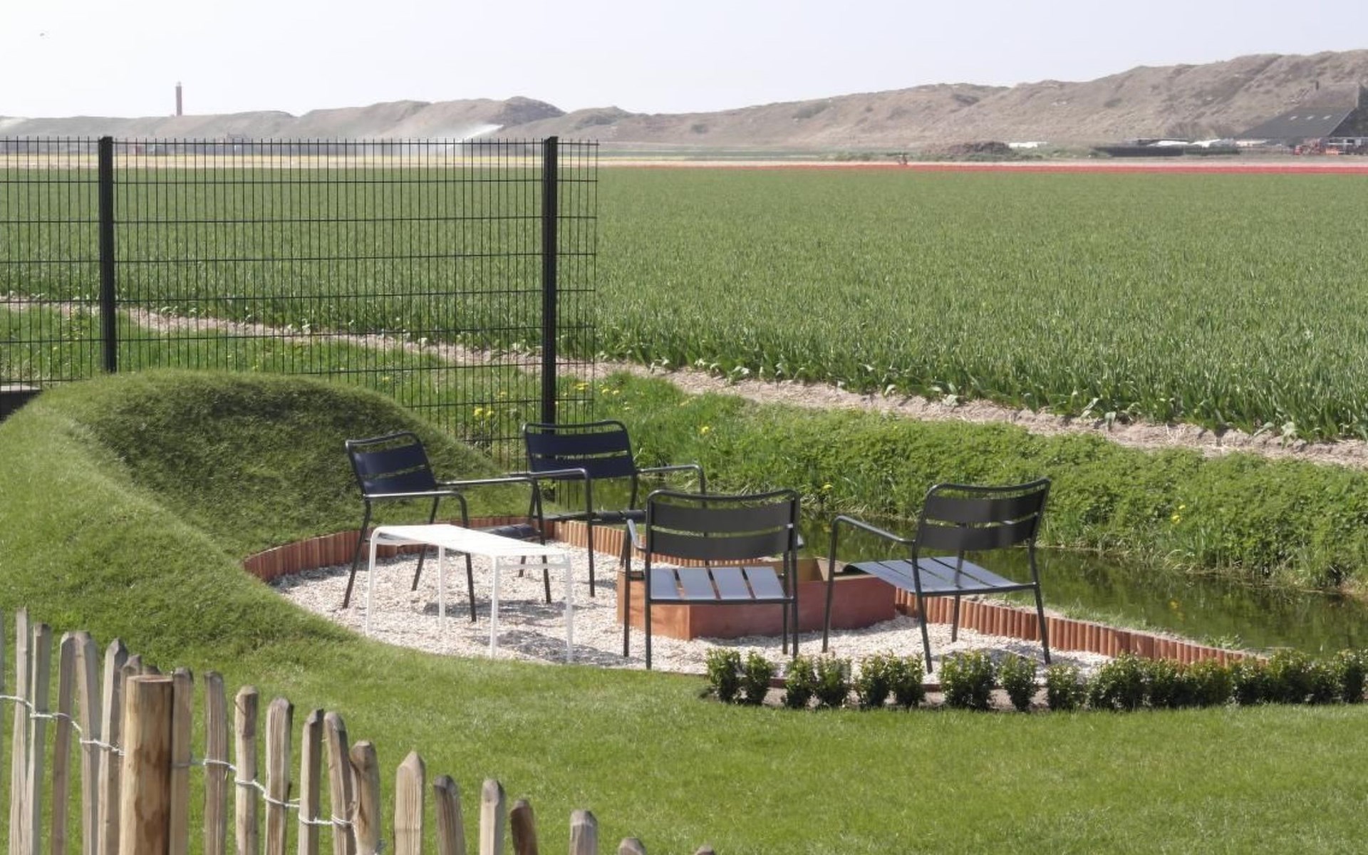 Grote omheinde tuin met meerdere terrassen, windvang, lounge set, eettafel, ligstoelen, Weber barbecue en kampvuur plaats!