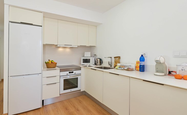 - Open keuken met elektrische kookplaat, elektrische oven, magnetron, vaatwasser, koel-vriescombinatie, koffiezetapparaat, elektrische waterkoker, mixer, broodrooster en citruspers