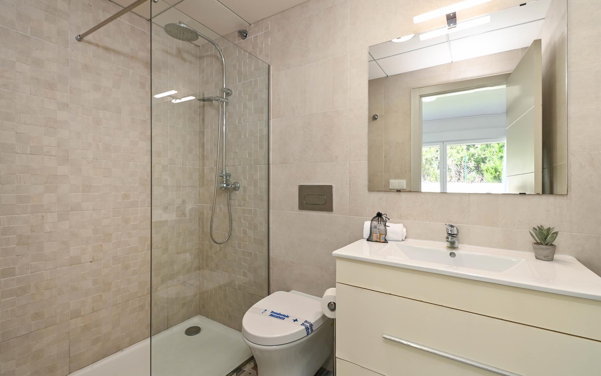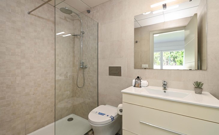 - En-suite badkamer met enkele wastafel, douche en toilet