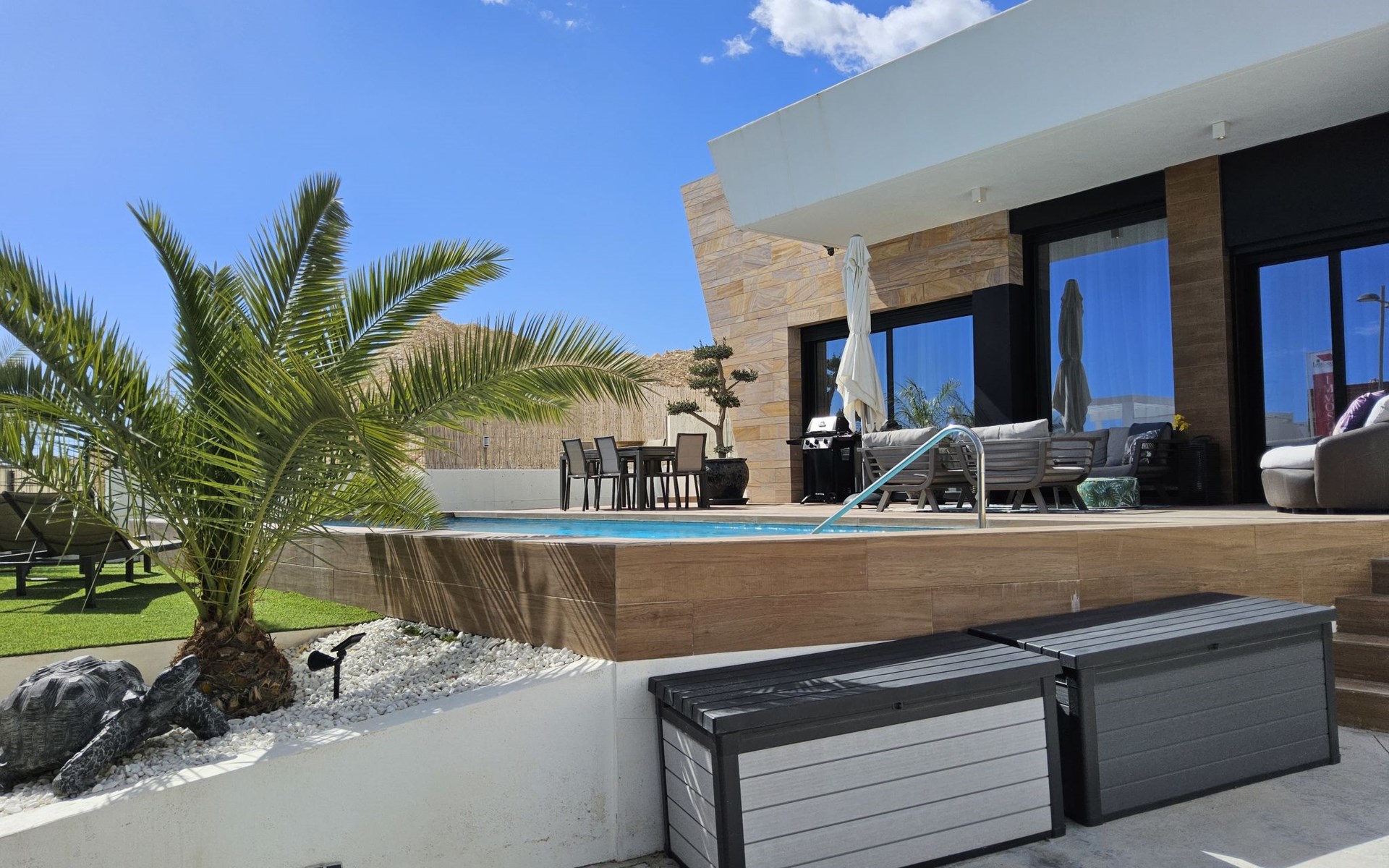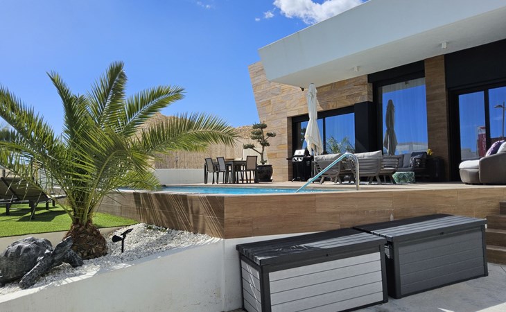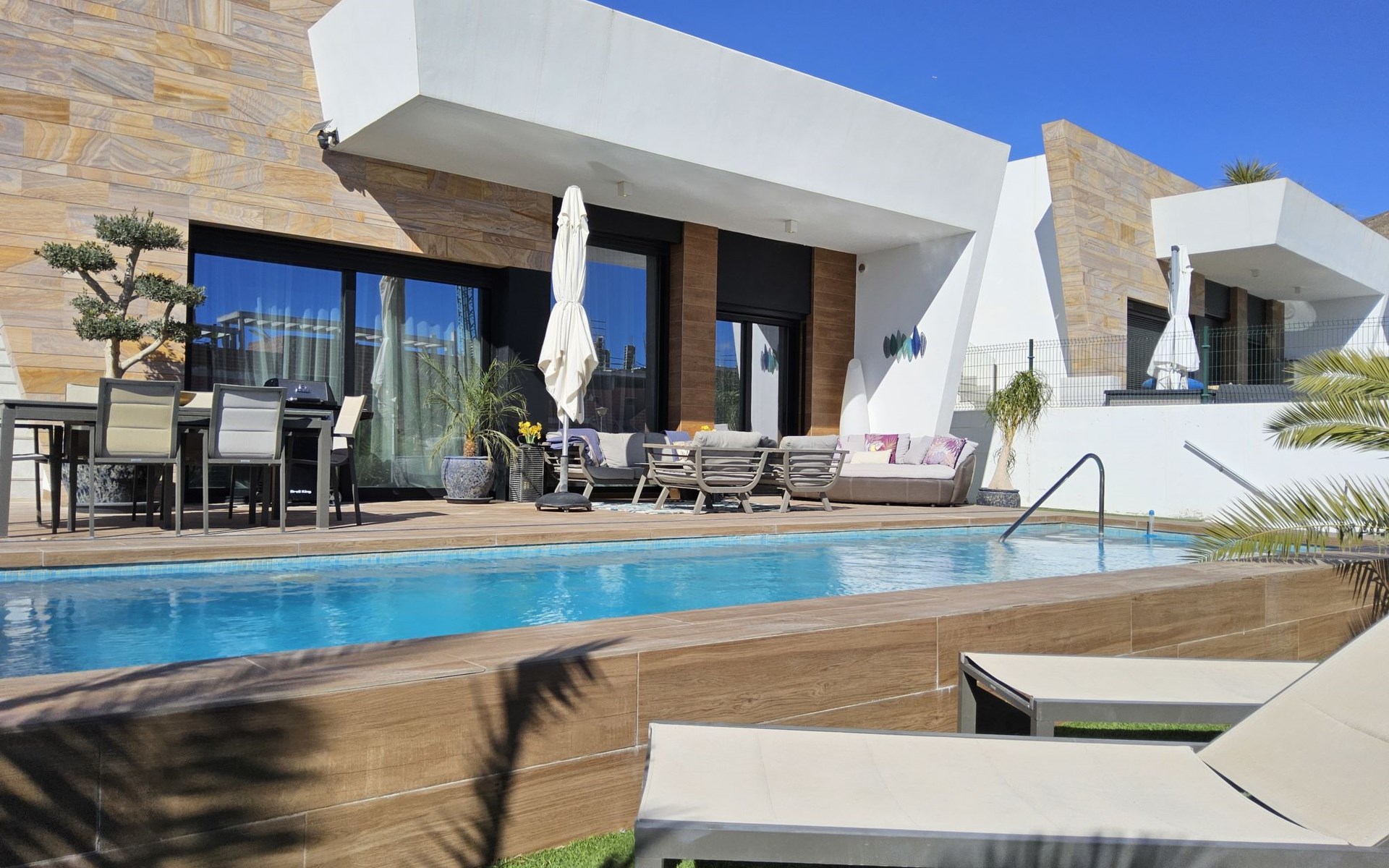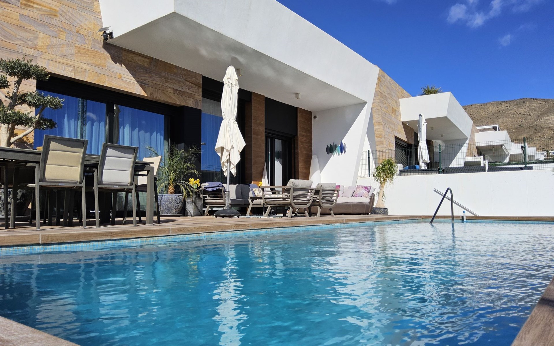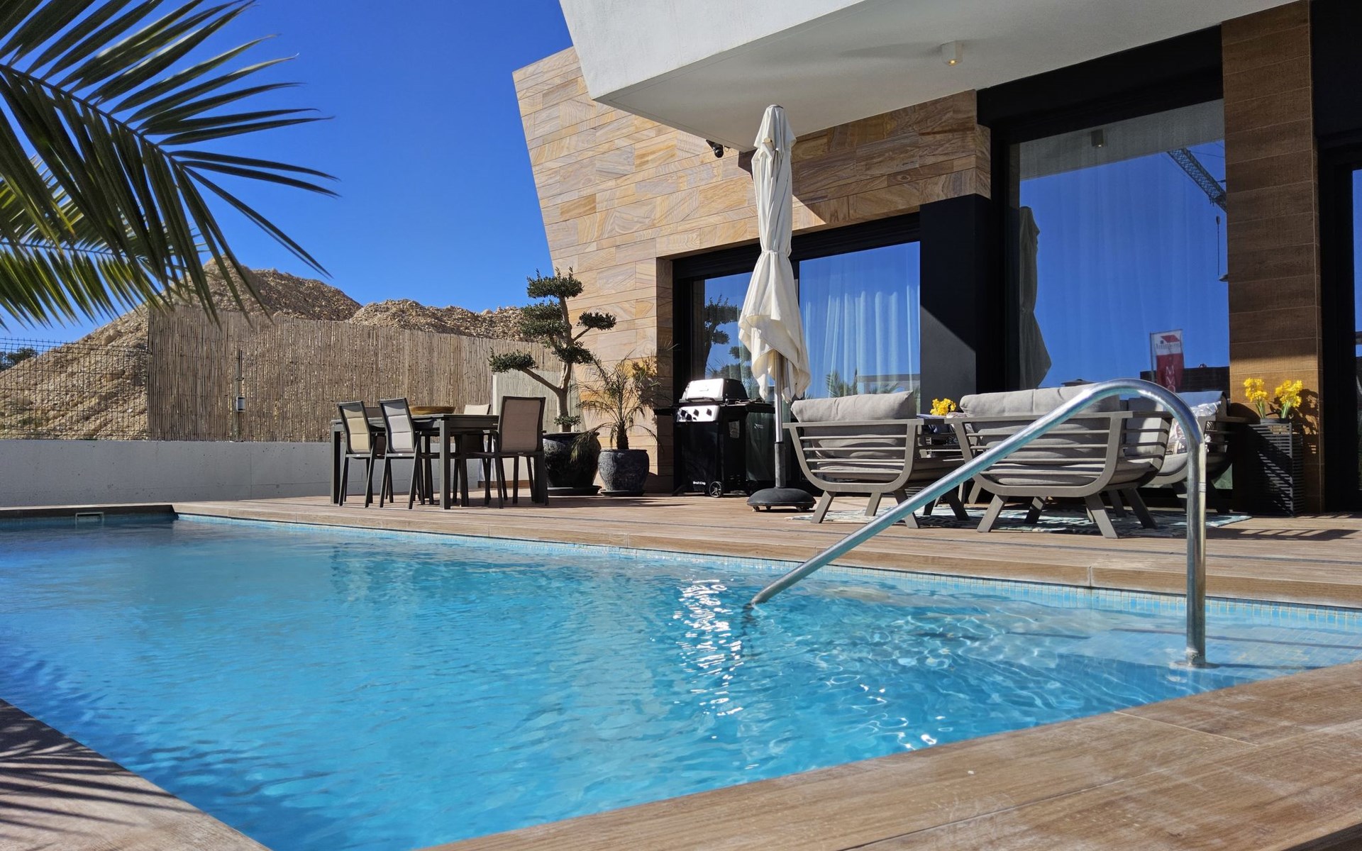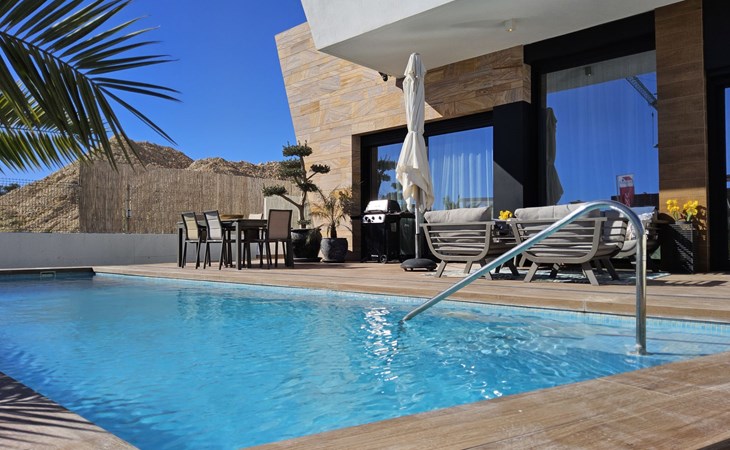 Groot, zeer moderne, comfortabele villa "Benidorm Eudaimonia", van 2 verdiepingen, bouwjaar 2023. Aan de rand van de plaats, 5 km van het centrum van Finestrat, buiten de plaats, 8 km van het centrum van Benidorm, zonnige ligging villa wijk, 3 km van zee, 3 km van het strand. Voor alleengebruik: terrein (omheind) met gazon, openluchtzwembad hoekig (9 x 4 m, 36 m2, seizoensgebonden beschikbaarheid: 01.Jan. - 31.Dec.). Buitendouche, patio (18 m2), tuinmeubelen, barbecue, parkeerplaats op het terrein. Supermarkt 2 km, restaurant 2 km, bar 2 km, bushalte "Benidorm" 2 km, station "Benidorm" 2 km. Golfterrein (18 holes) 4 km, wandelroutes 300 m vanaf het huis. Attracties in de buurt: Terra Mitica 4 km, Terra Natura 5 km, Aqualandia 14 km, Mundomar 14 km, Alicante 44 km, Aeropuerto Alicante 56 km. Auto noodzakelijk. Baby uitrusting op aanvraag. De eigenaar accepteert geen jeugdgroepen. Een deel van het huis is afgesloten en niet bezet. De omgeving is gevoelig voor geluidsoverlast. Gelieve geen lawaai te maken en de rust te bewaren.