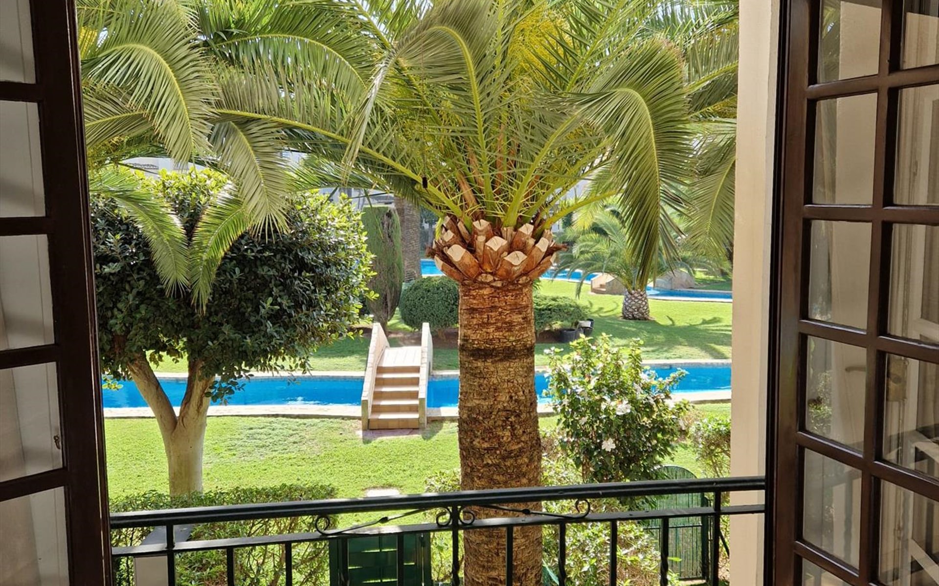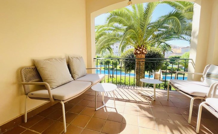 Ons appartement beschikt over een balkon op het zuiden met loungeset. Vanaf het balkon kijk je uit over de tuin en het zwembad waar je iedere ochtend kunt genieten van een heerlijk ontbijt in de zon gedurende het hele jaar.