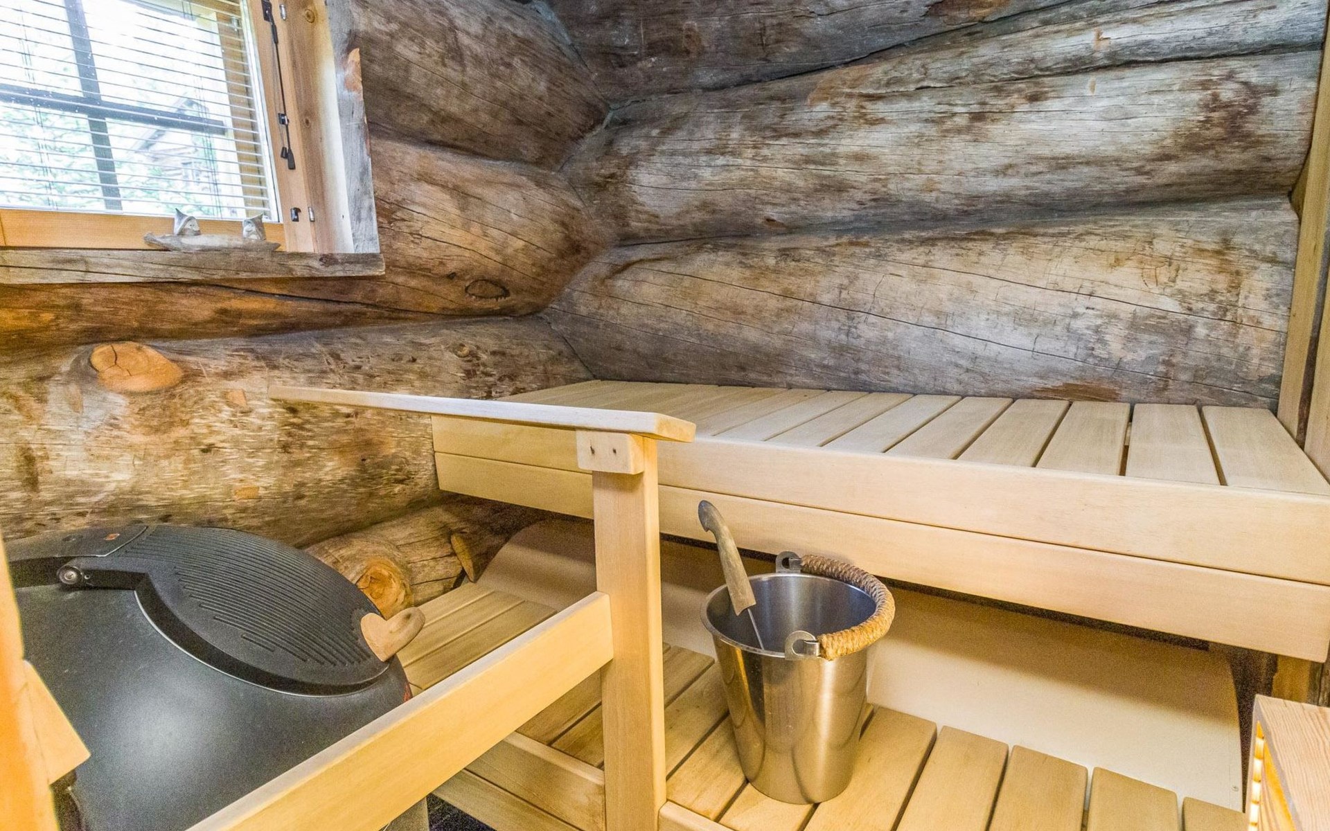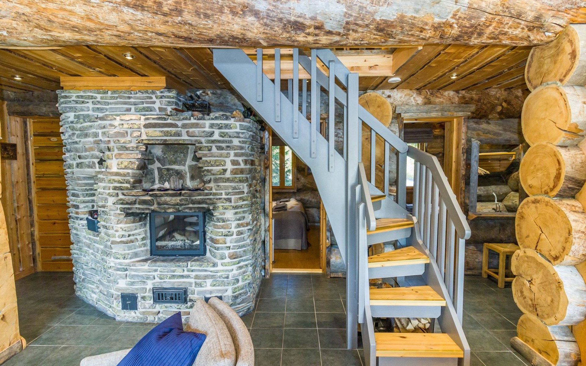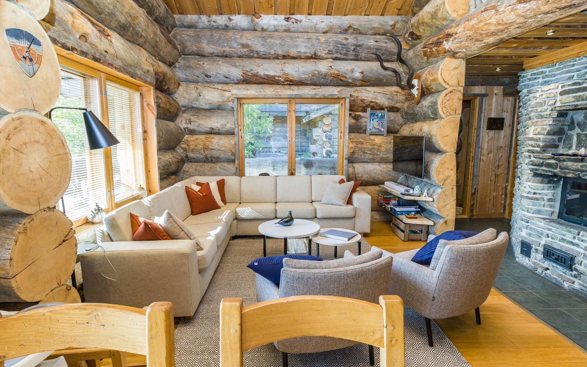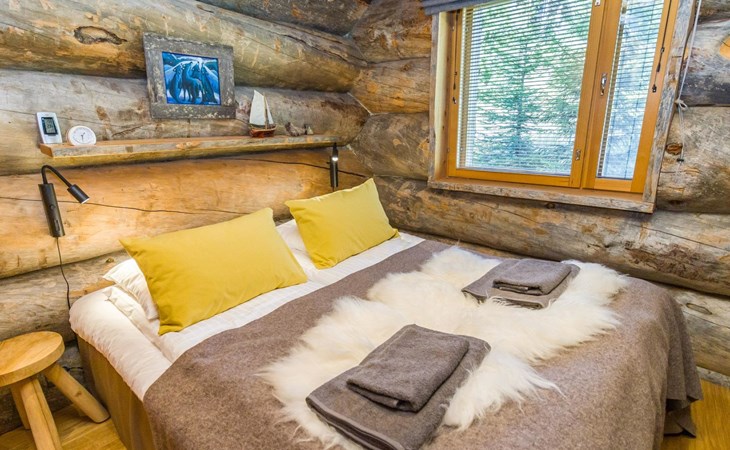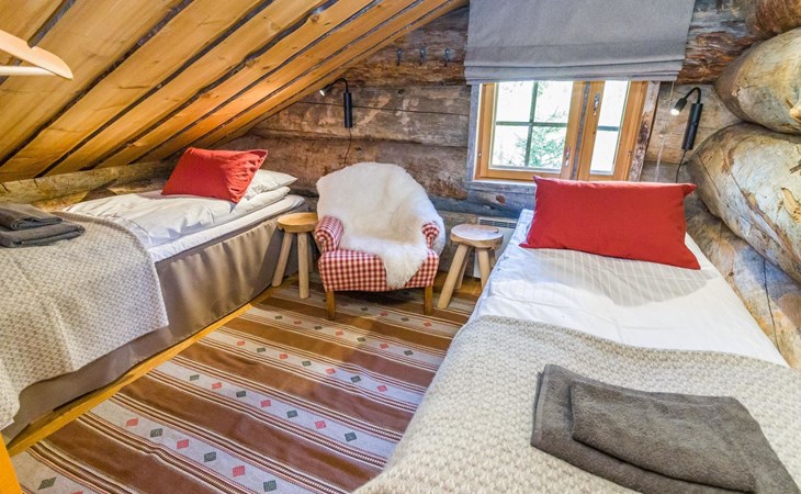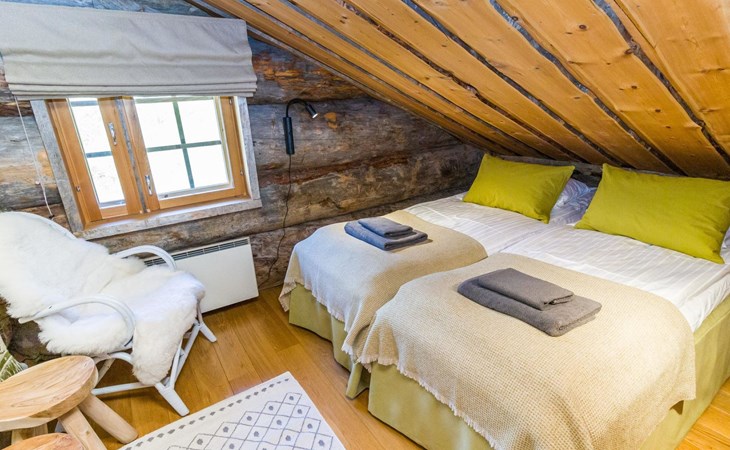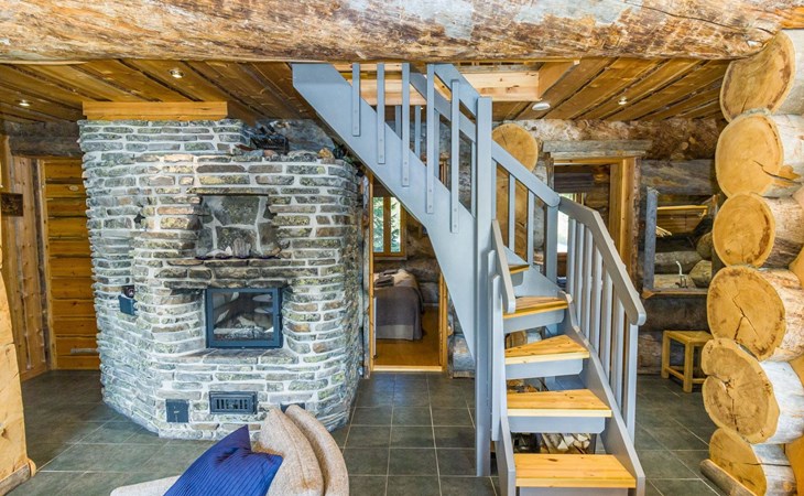Villa Saaruli provides excellent amenities for a winter holiday. The cabin's cozy interior was mostly renovated in 2023. The open space on two floors includes kitchen, dining area, and seating area around the natural stone fireplace. The cabin has four bedrooms, two with double beds and two with two single beds (located on the upper floor). Ground floor contains a sauna area and a separate WC, and there is a small WC on the upper floor as well. In a separate utility room, there's washing machine and drying cabinet. On the slope side of the cabin, there's a terrace that covers the entire length of the building. Sunlight reaches the terrace until late in the afternoon. Guests arriving at Villa Saaruli can enjoy hotel-style beds and towels. Final cleaning and electricity are included in the rent.