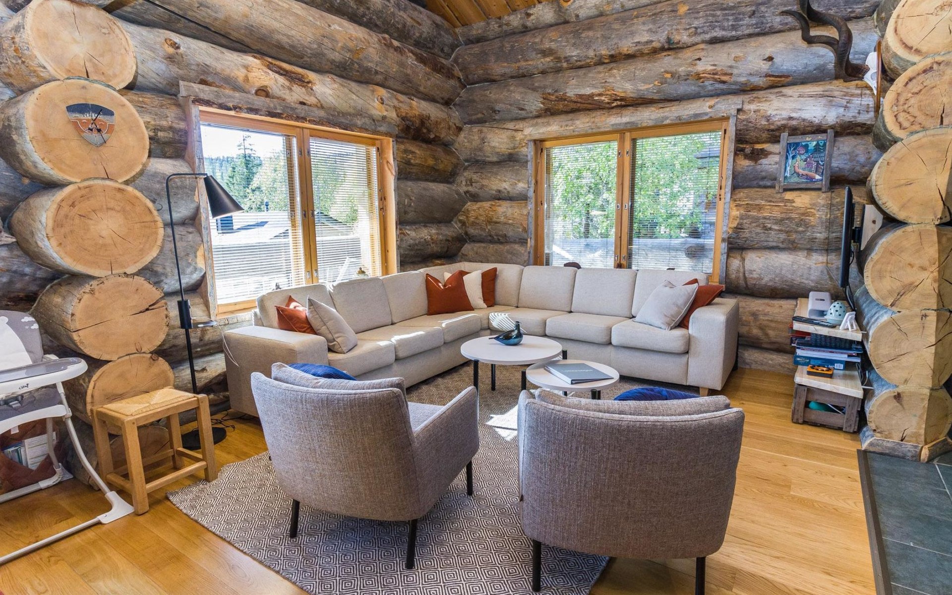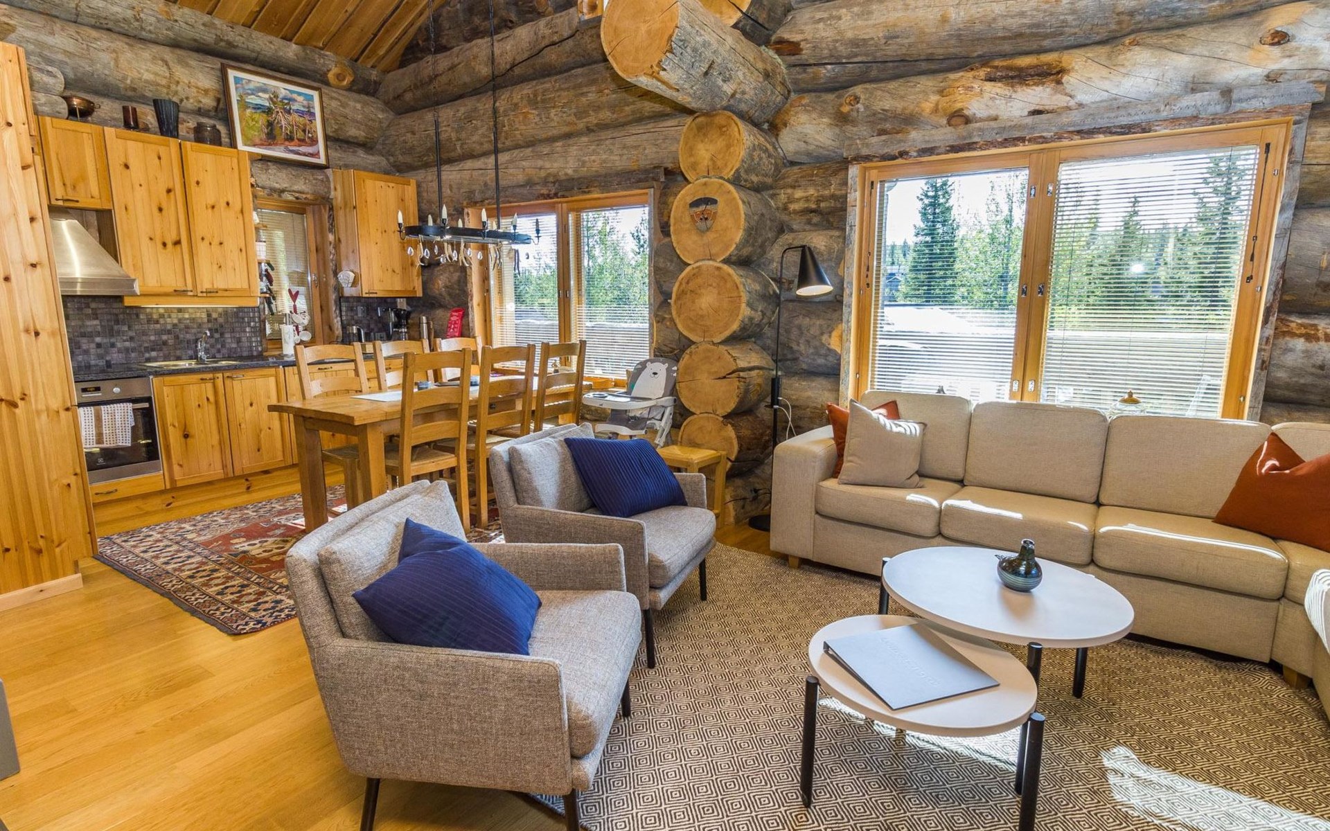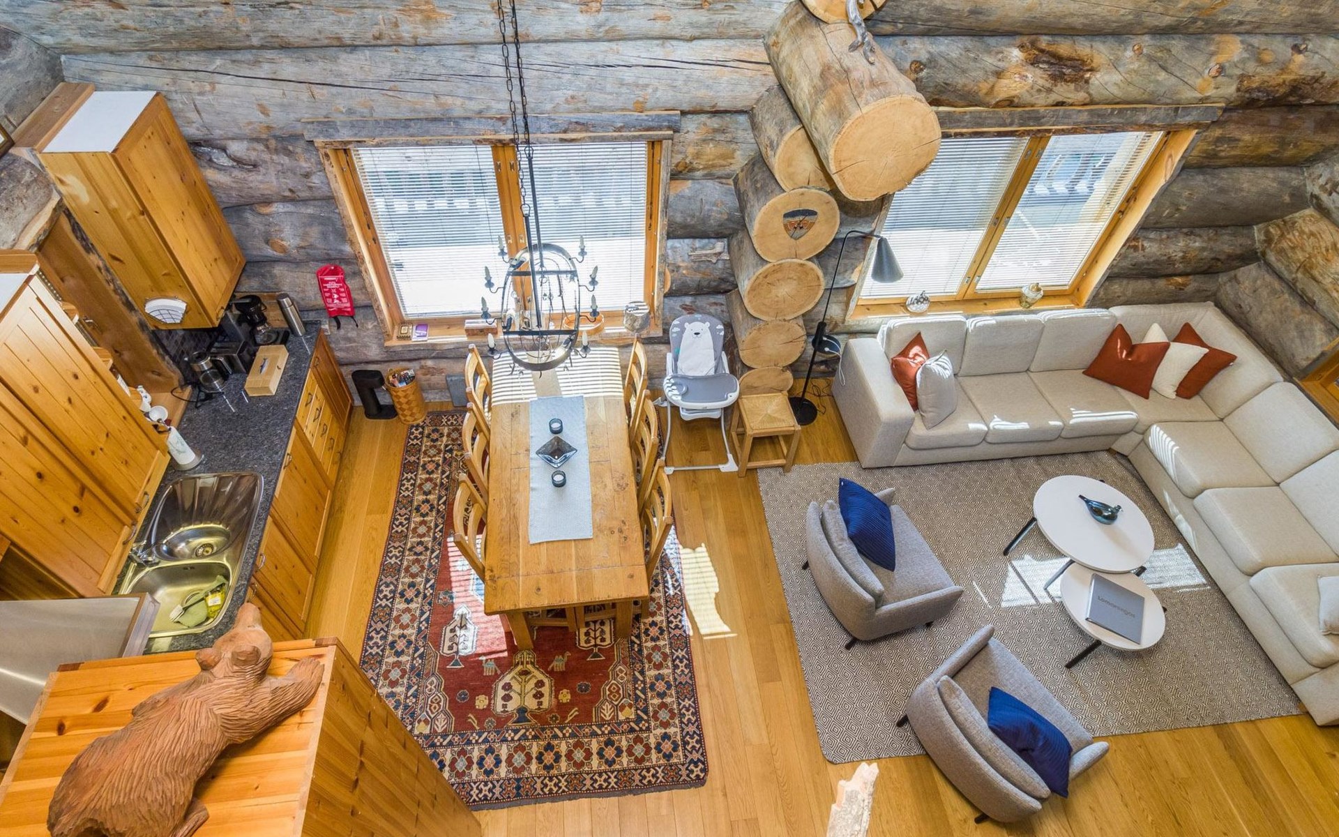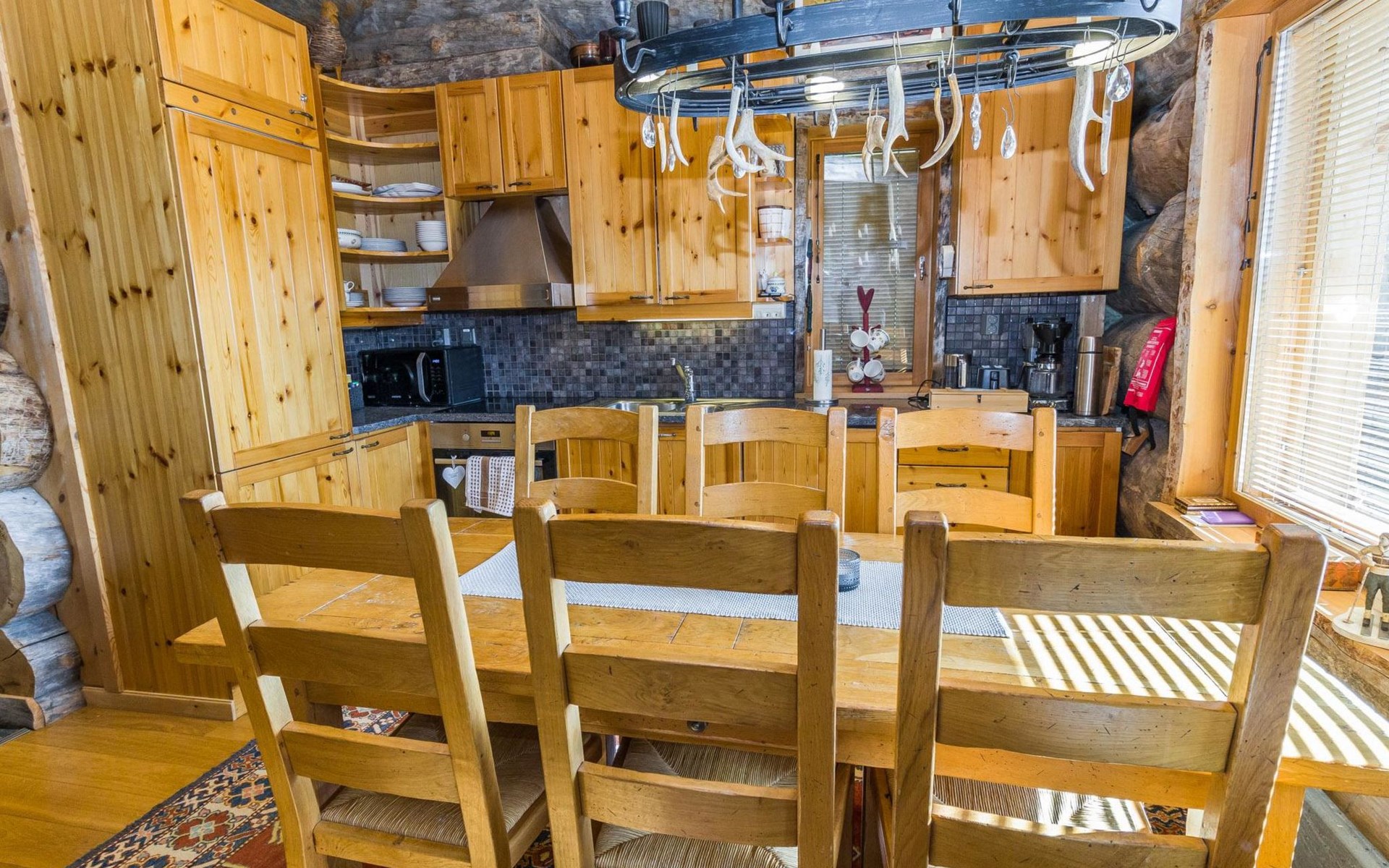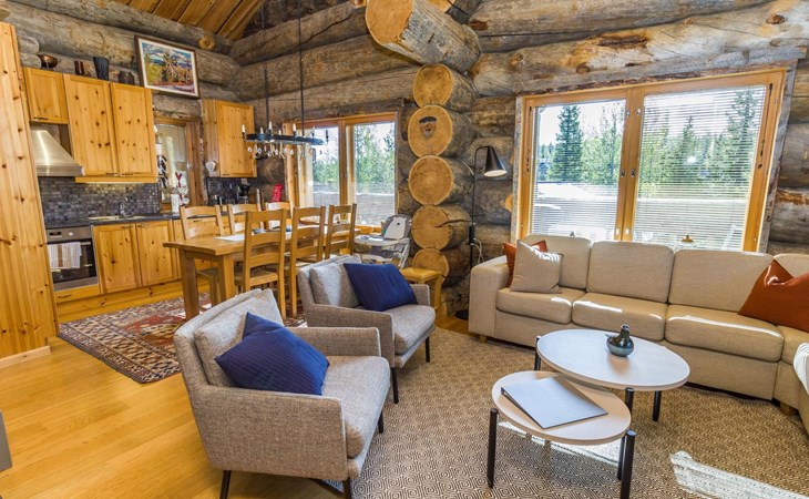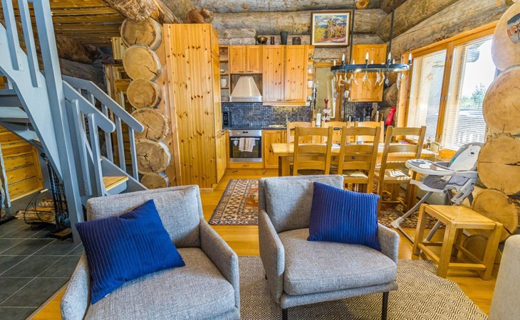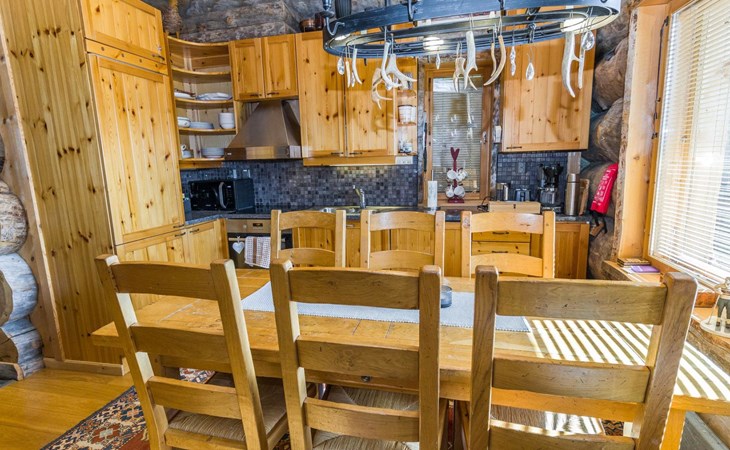 Villa Saaruli was built from massive logs in 2000. The villa itself is magnificent, as well as the location is perfect. You can easily access the ski lifts, ski and snowmobile trails right from your own yard, making it an excellent choice for travelers without a car. The nearest ski lifts (Vuosseli Express and Kulmahissi) are within 100 m walking distance, as well as a year-round operating gondola lift that takes you over the fell to Ruka village. Several high-quality restaurants and a small K-market are also within walking distance.