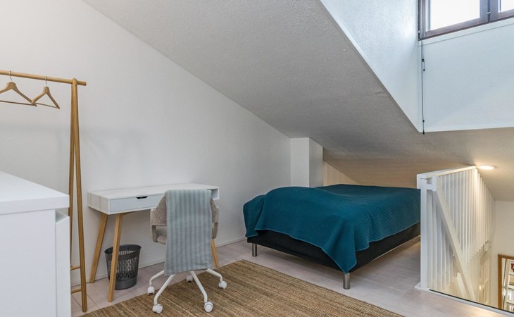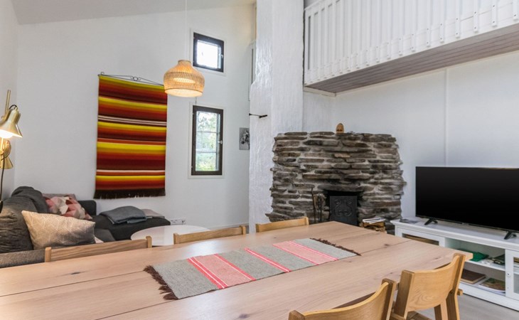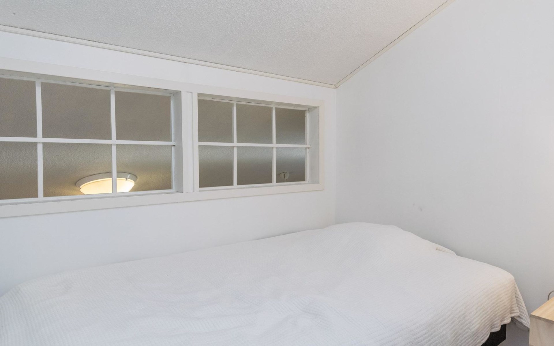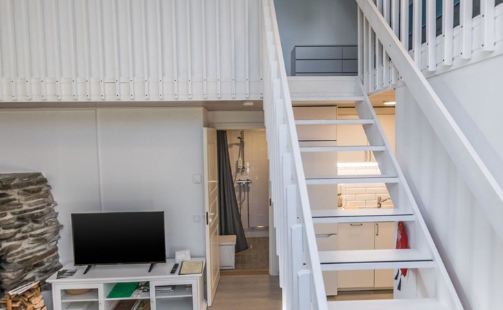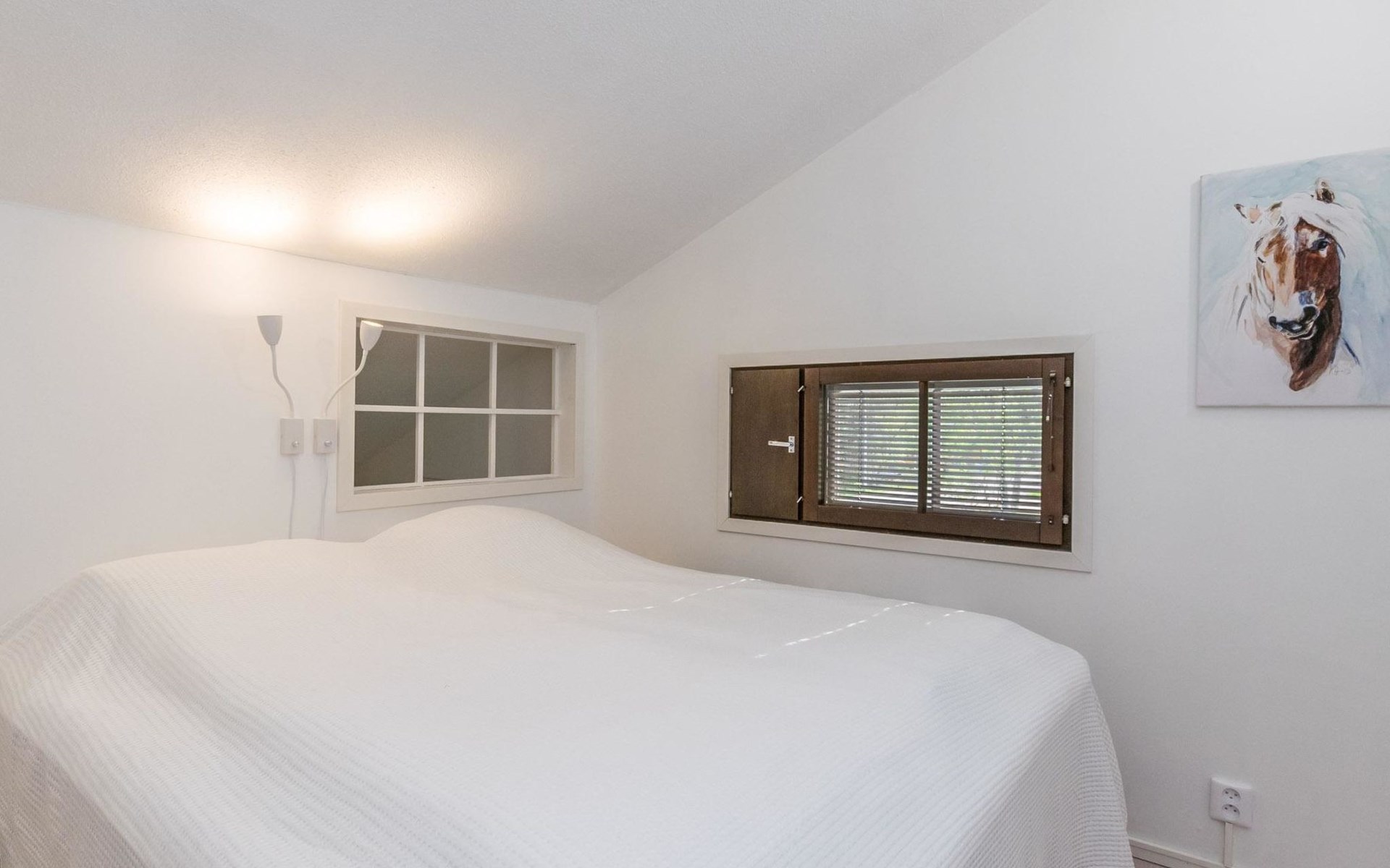 The bedroom on the ground floor has two beds. One upstairs bedroom has a 160 cm wide double bed and the other bedroom has a 120 cm wide bed. Both bedrooms have an open window without glass to the downstairs living room. In the open loft there is additional sleeping space for a 120 cm wide bed.