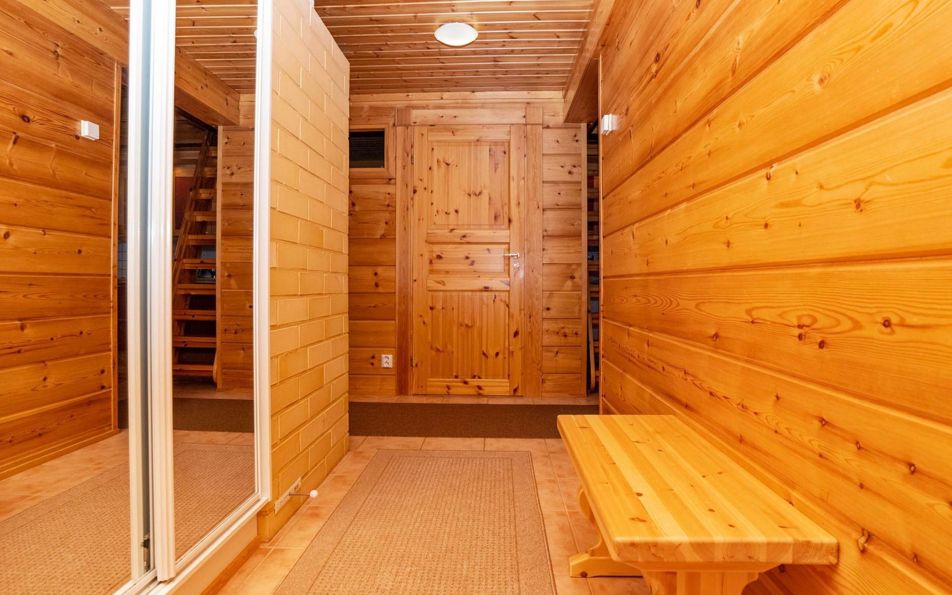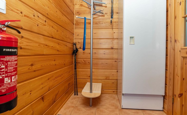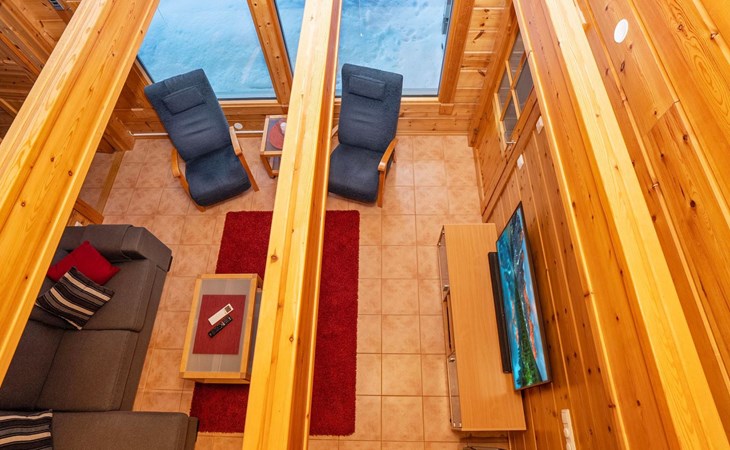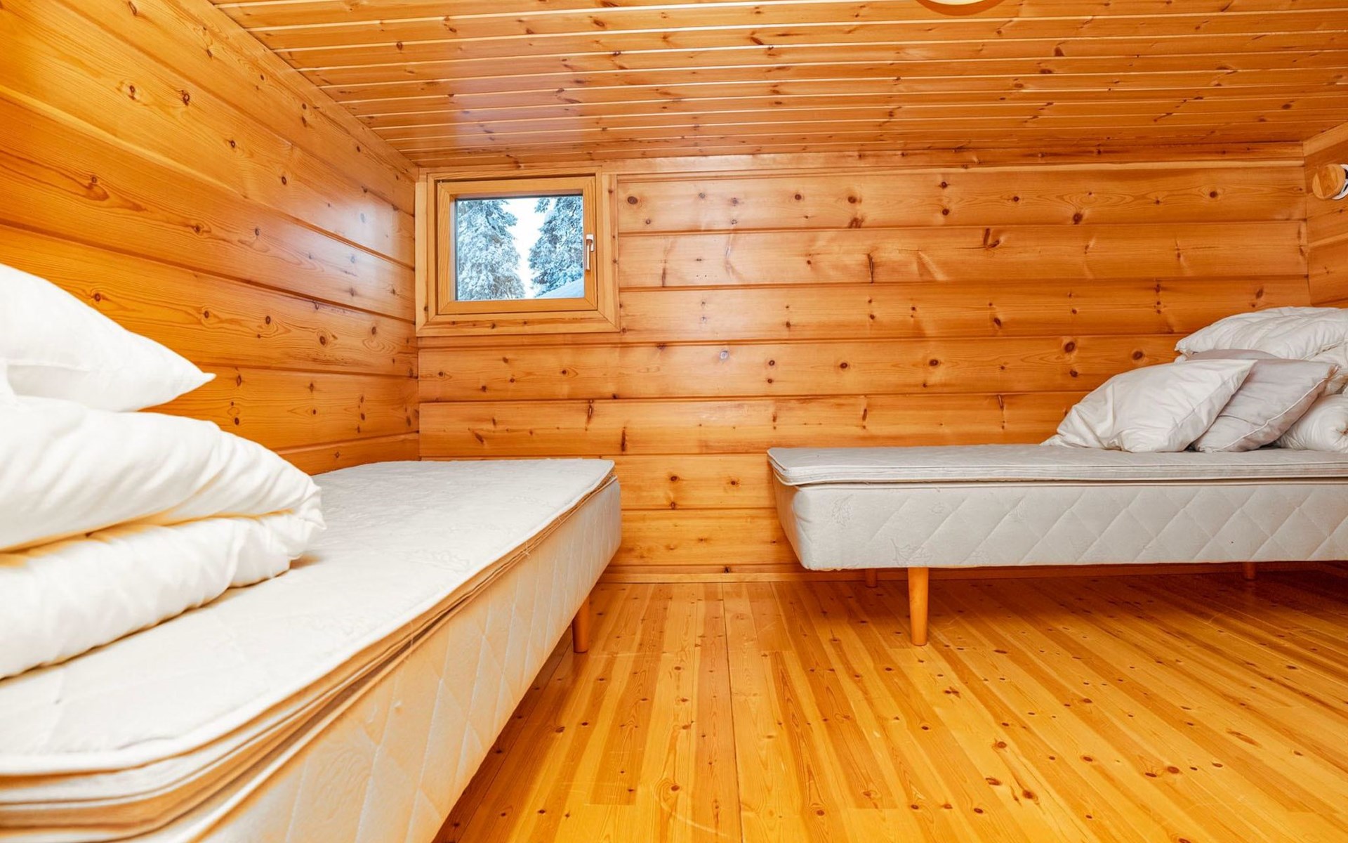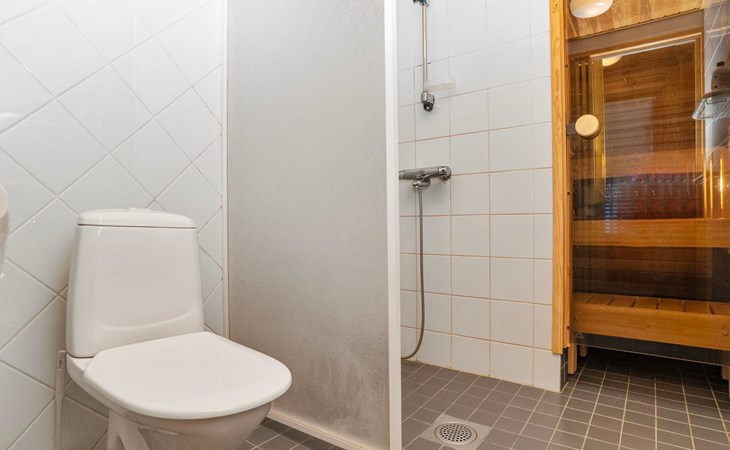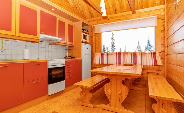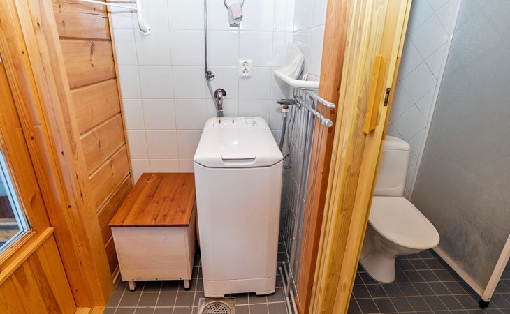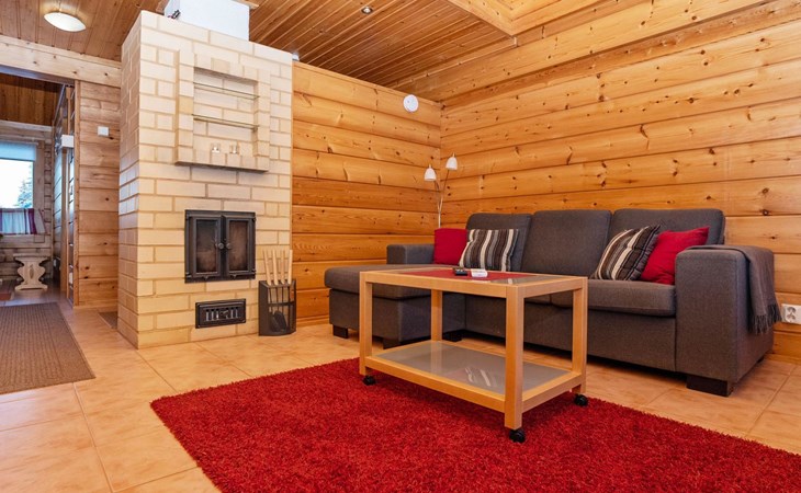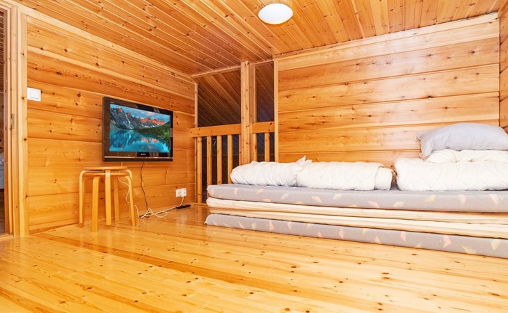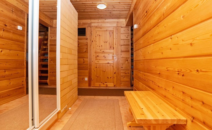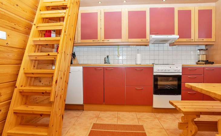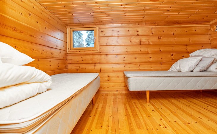 High level apartment in log-built semi-detached house, built in 2005. Bedroom 1: double bunk bed (width 140 cm), bedroom 2: 2 beds (can not be separated), bedroom in loft: 2 beds, loft (room heigth less than 2 m), steep stairs to the loft, living room: convertible sofa, combined kitchen/living room, electric sauna.