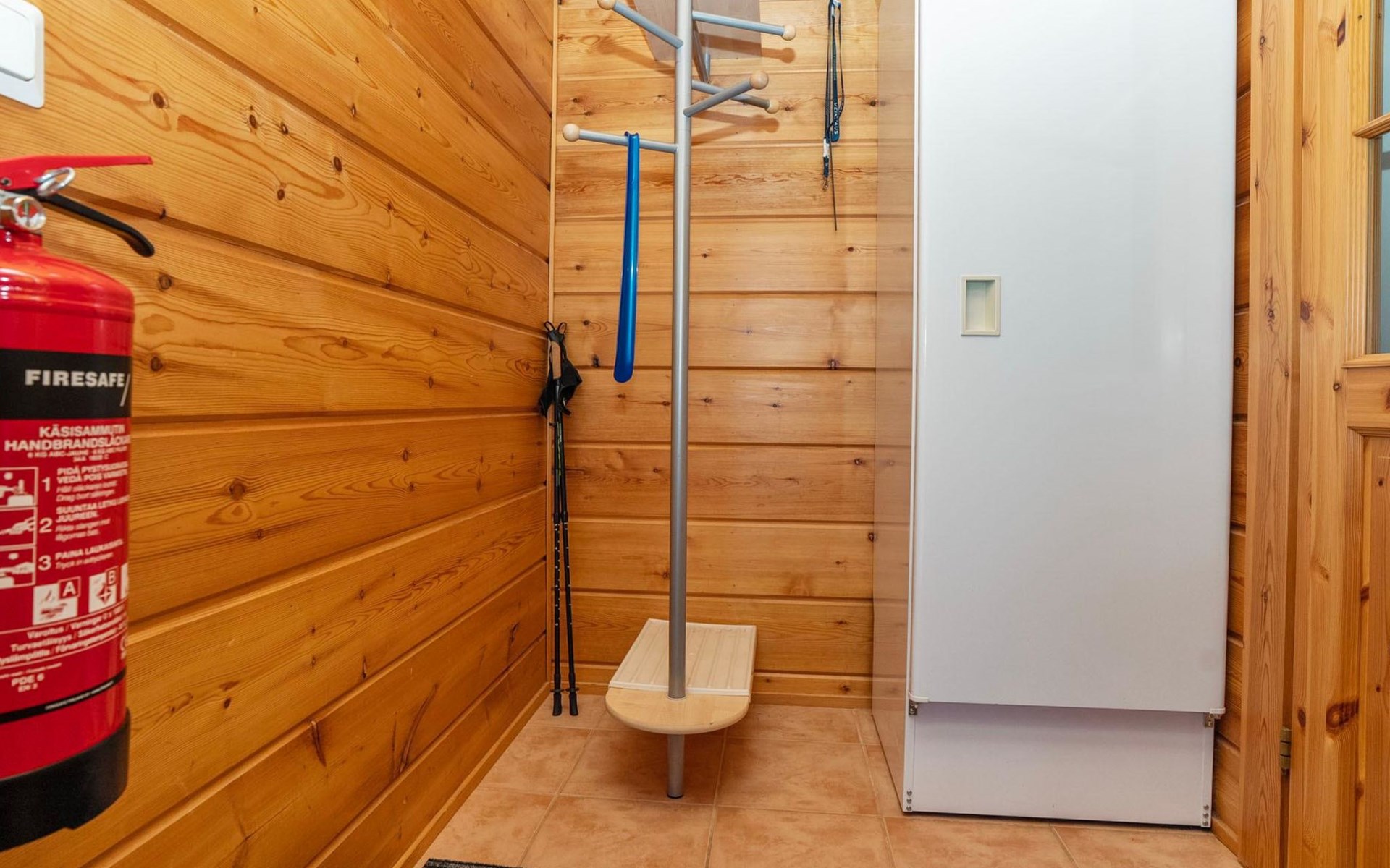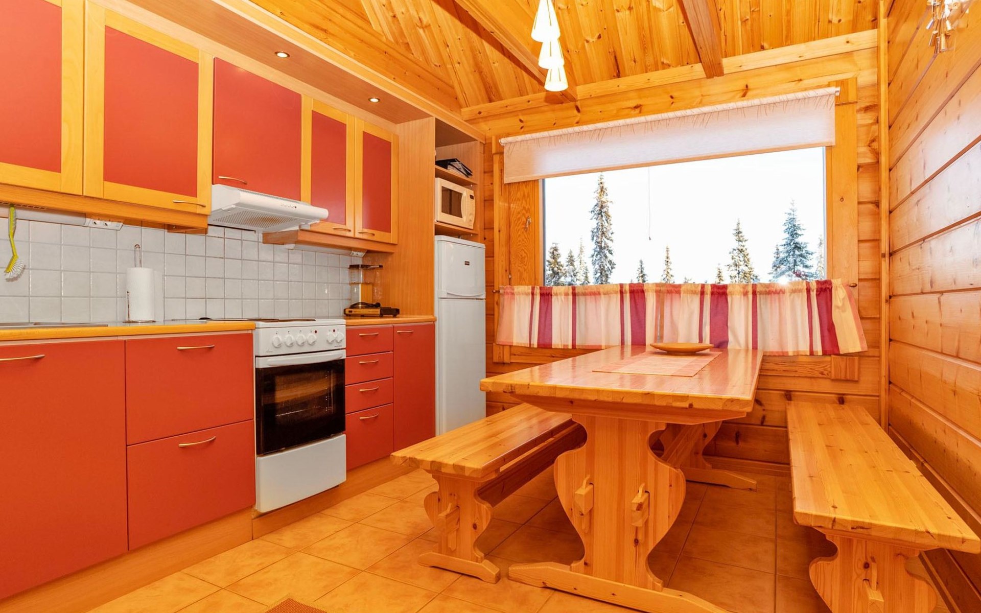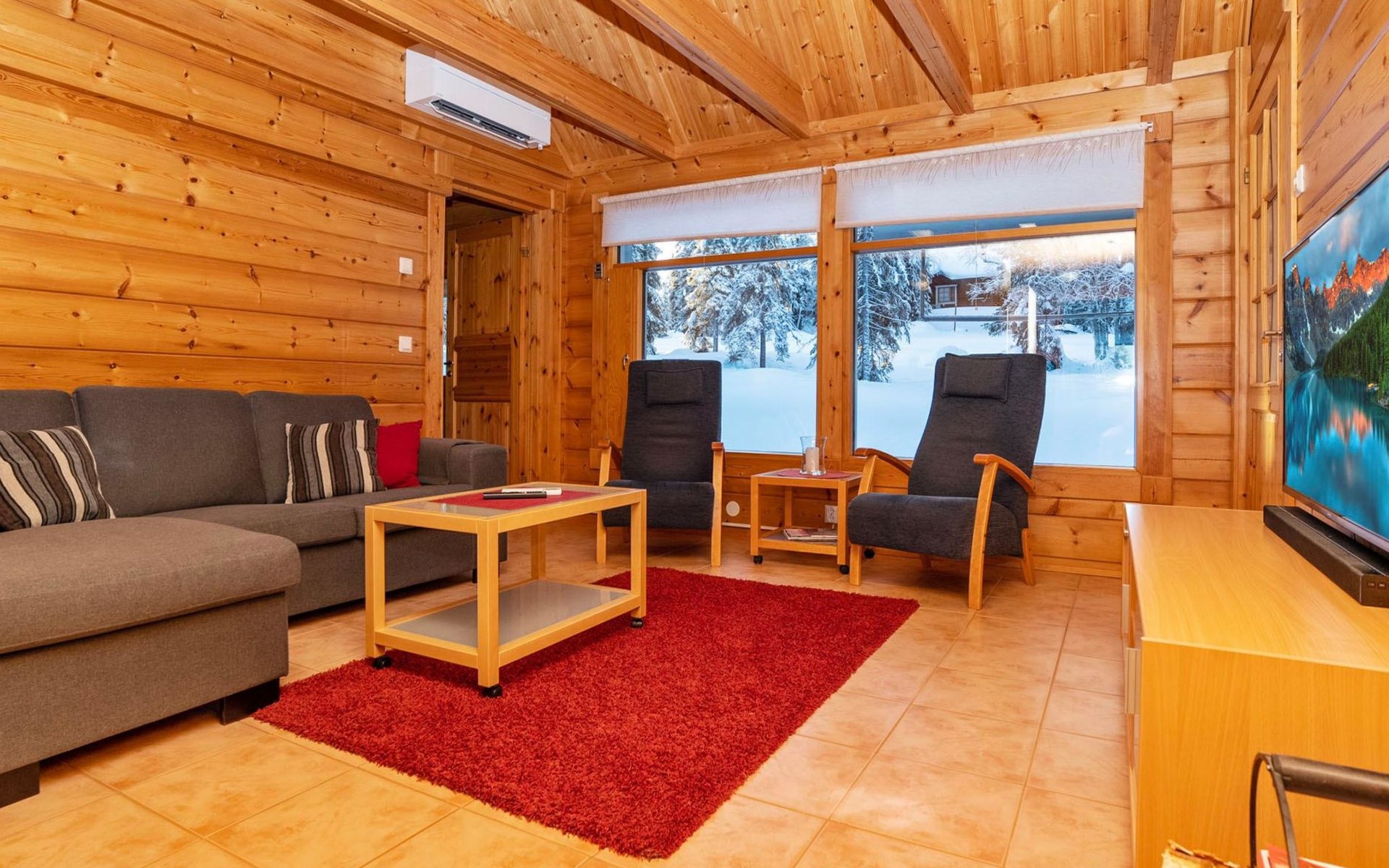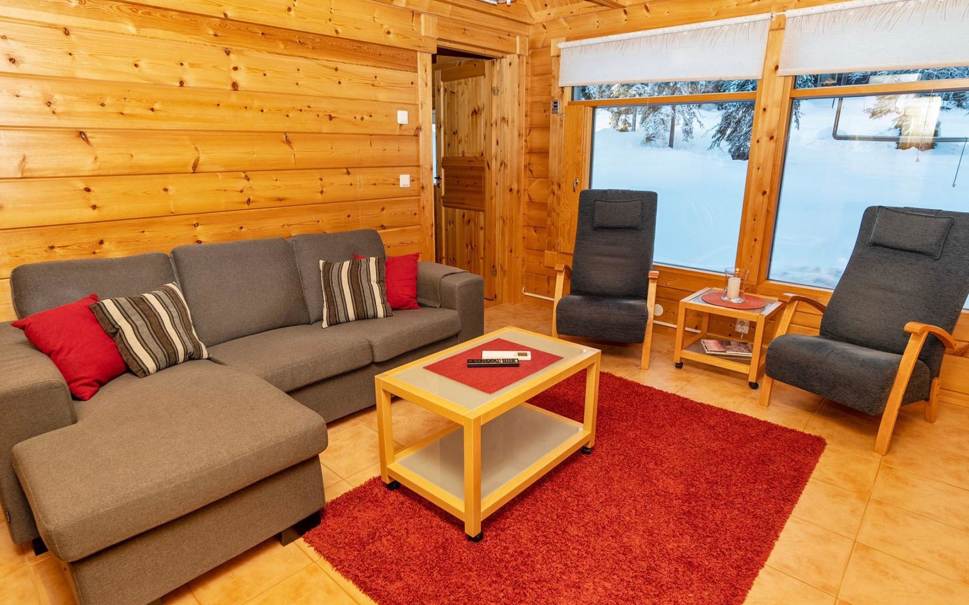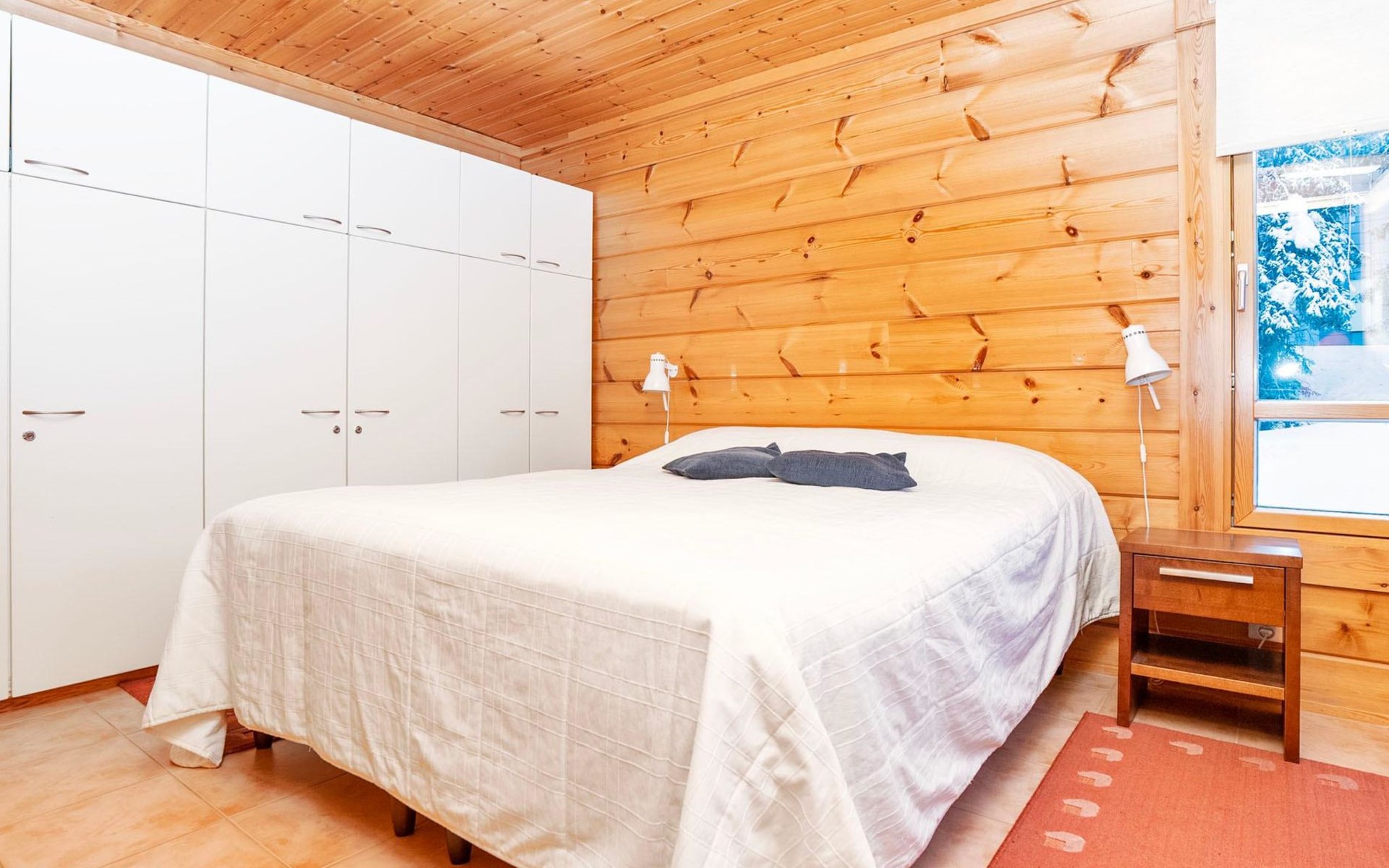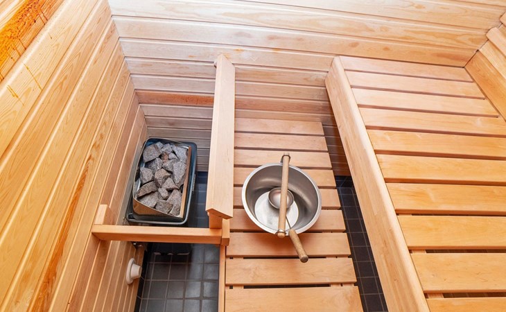 High level apartment in log-built semi-detached house, built in 2005. Bedroom 1: double bunk bed (width 140 cm), bedroom 2: 2 beds (can not be separated), bedroom in loft: 2 beds, loft (room heigth less than 2 m), steep stairs to the loft, living room: convertible sofa, combined kitchen/living room, electric sauna.