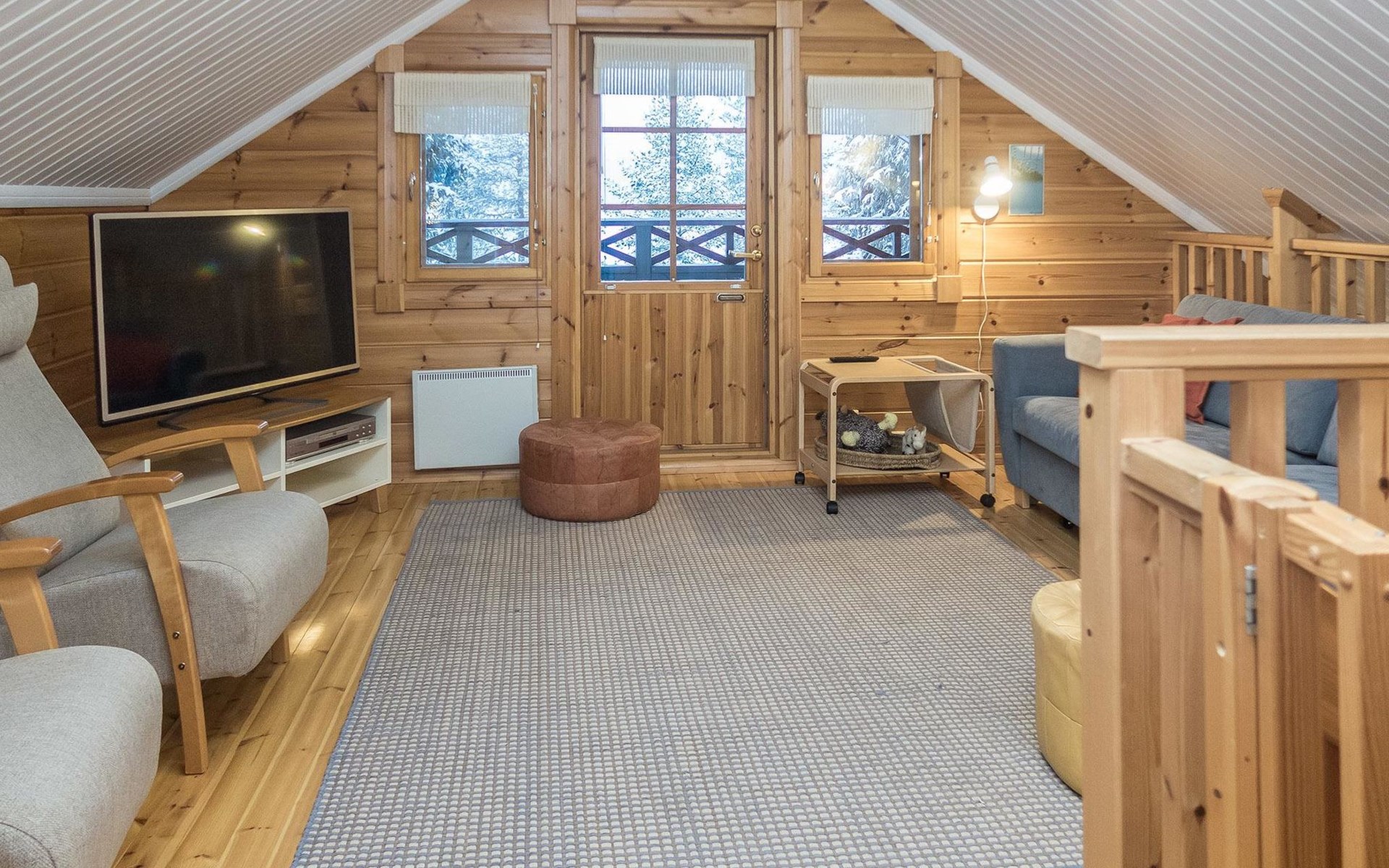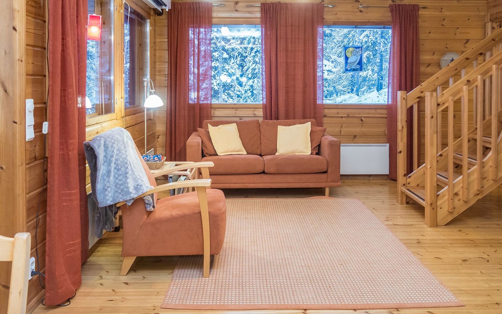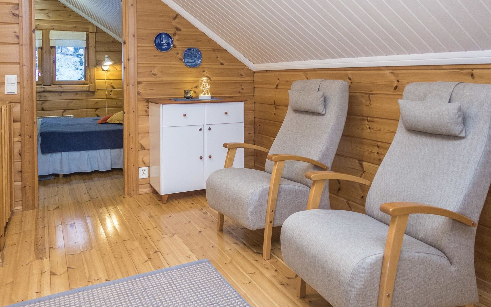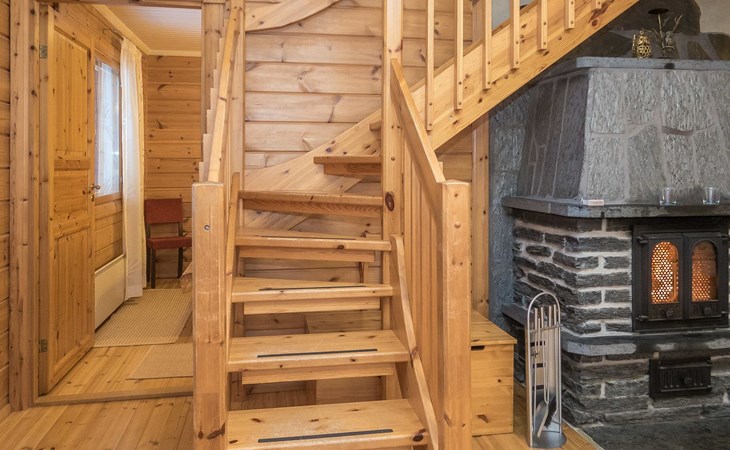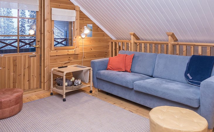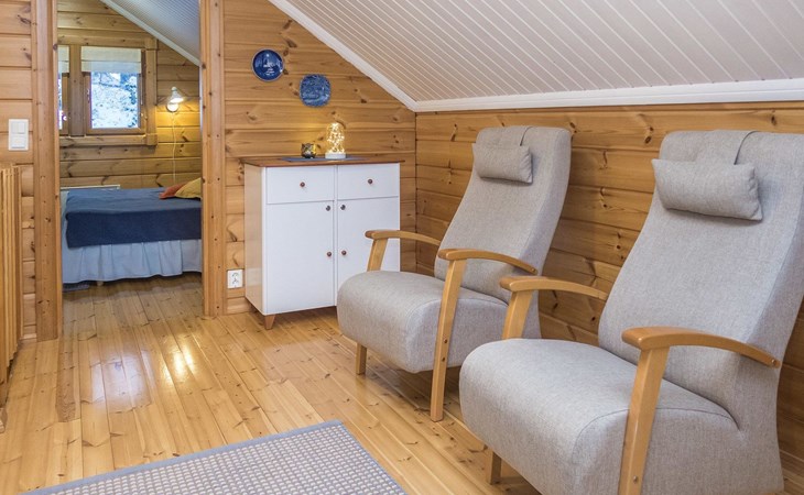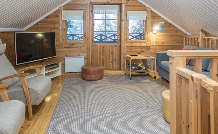 Log chalet 2004, living room/kitchen, bedroom double bed, utilities room/ dressing room, washroom, sauna (elec. stove), open porch, upstairs bedroom 2 beds (á 80 cm wide), recreation loft convertible sofa/ bed for two and balcony.