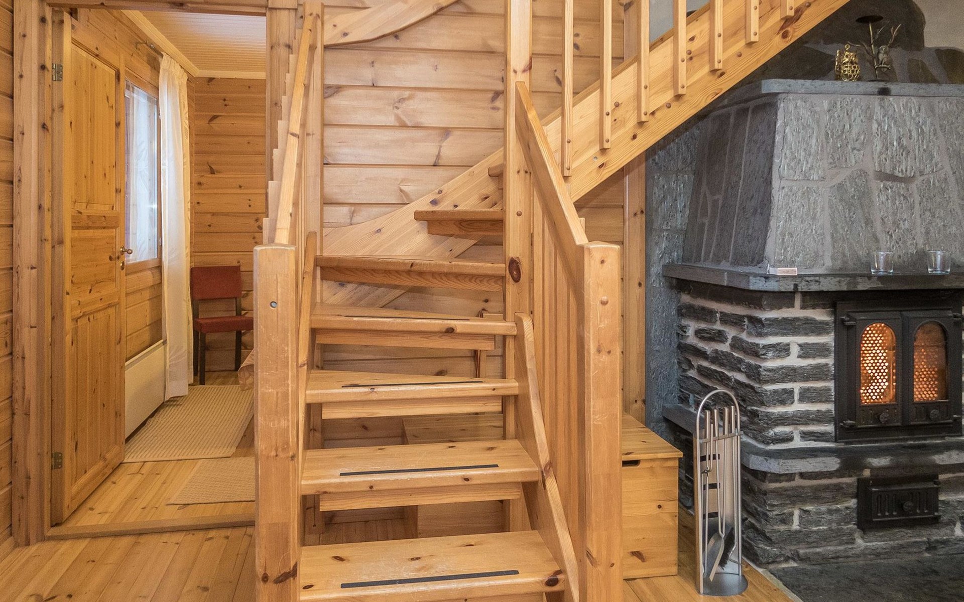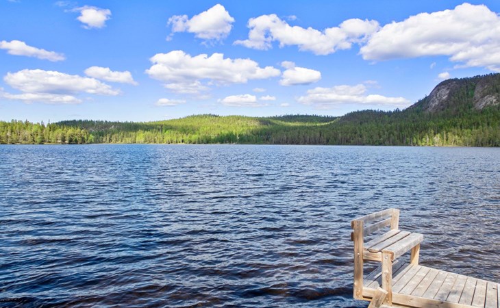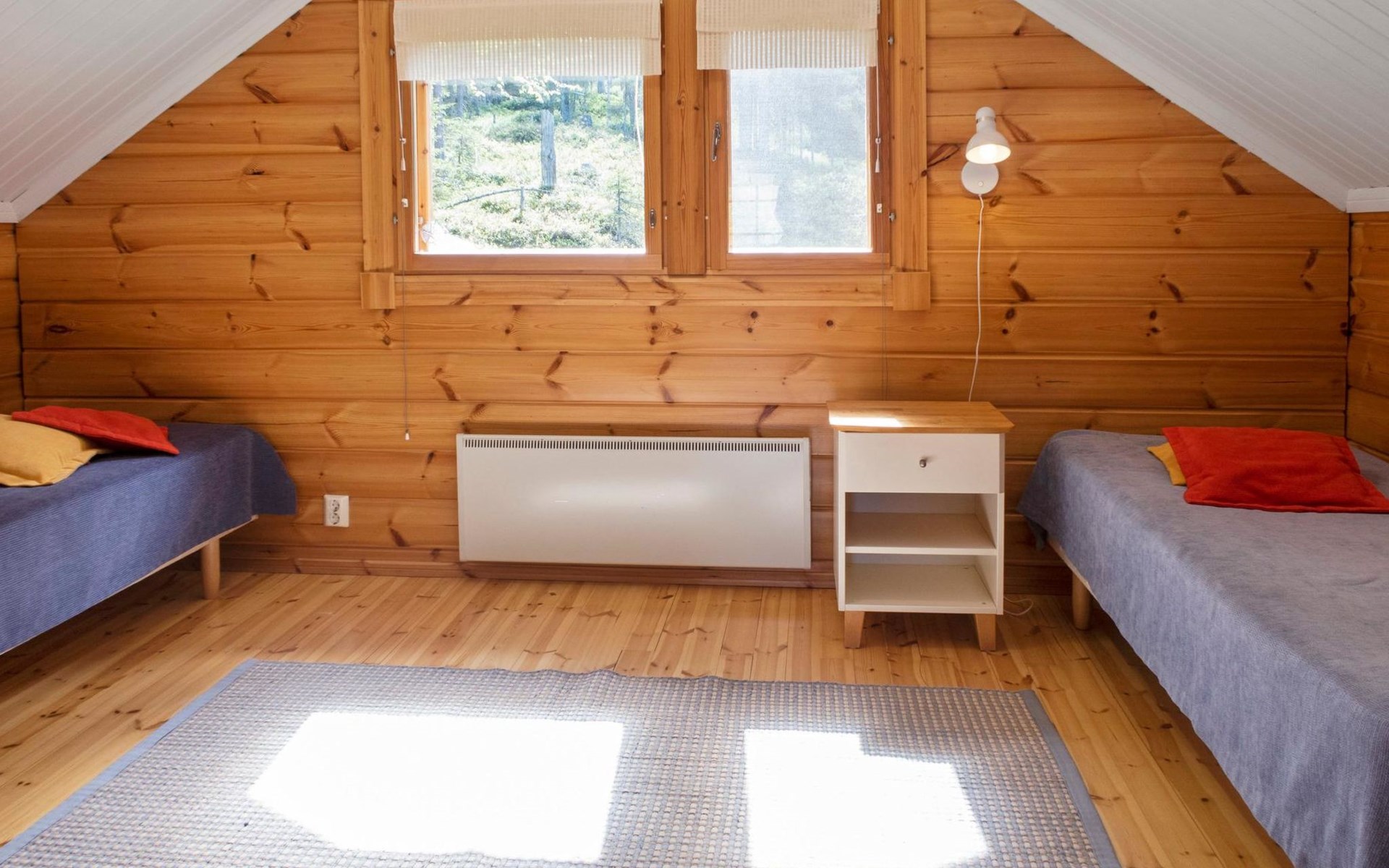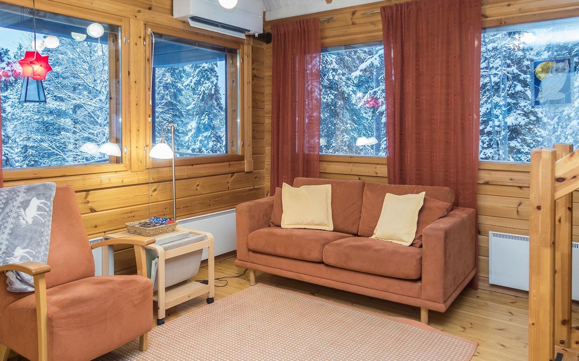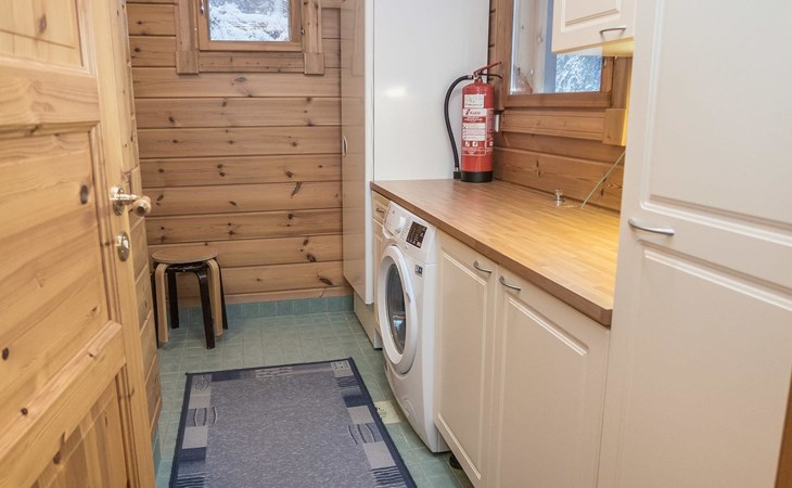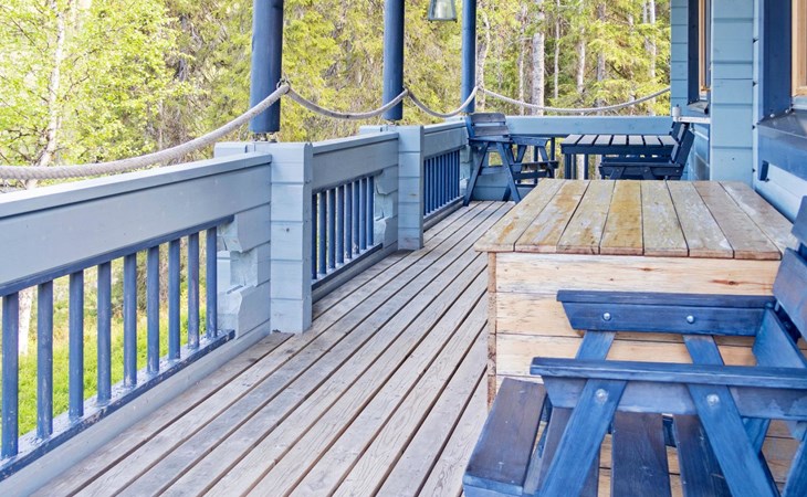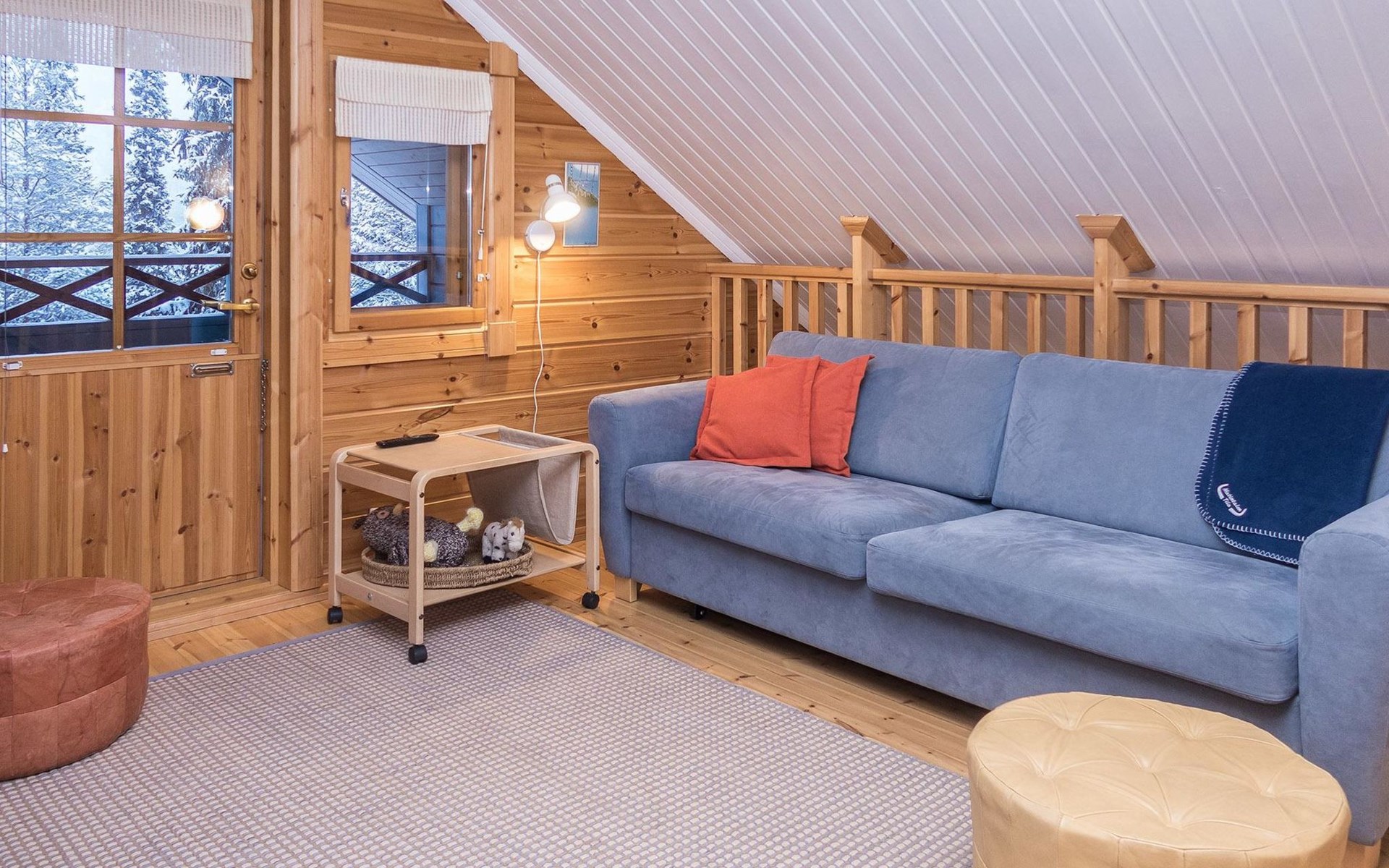 Log chalet 2004, living room/kitchen, bedroom double bed, utilities room/ dressing room, washroom, sauna (elec. stove), open porch, upstairs bedroom 2 beds (á 80 cm wide), recreation loft convertible sofa/ bed for two and balcony.