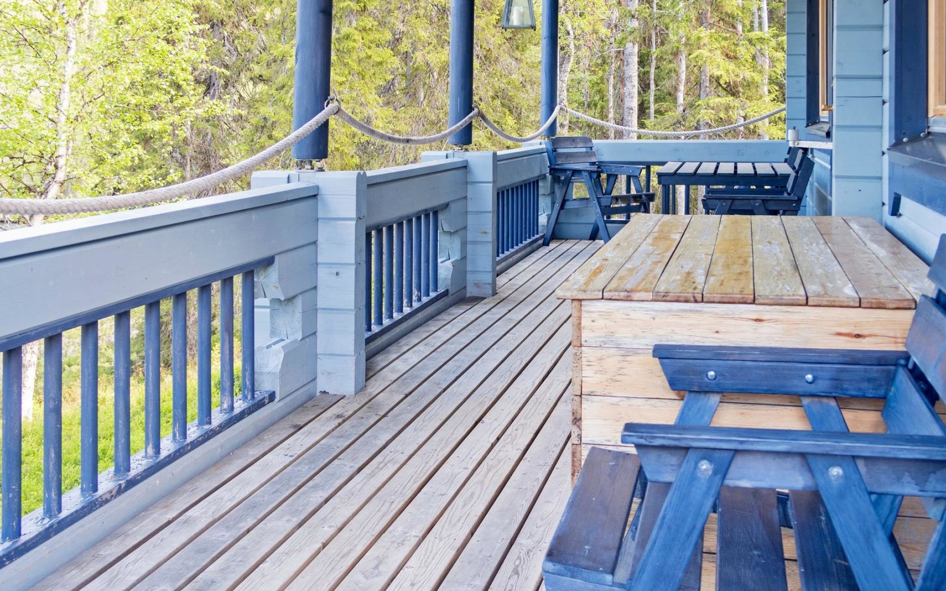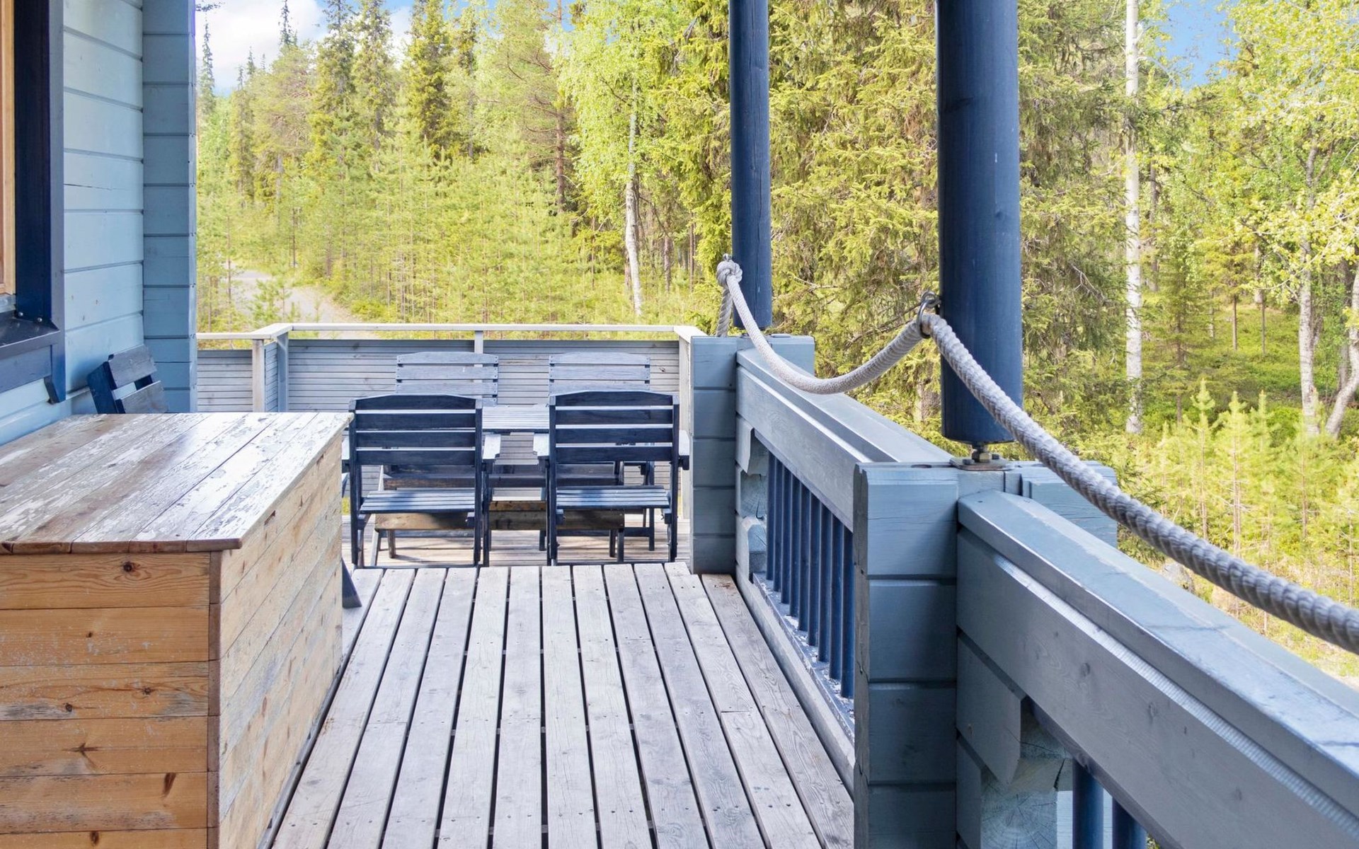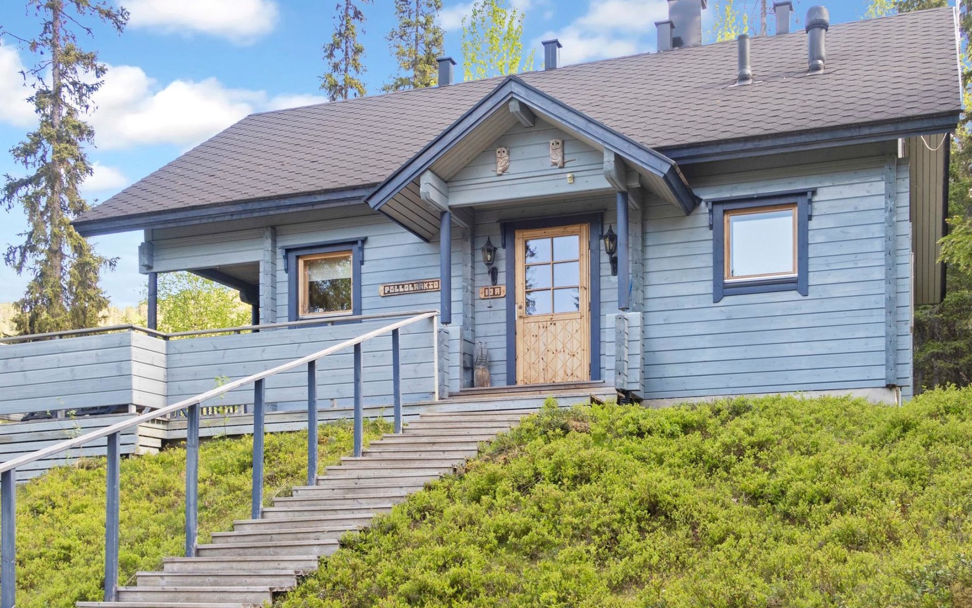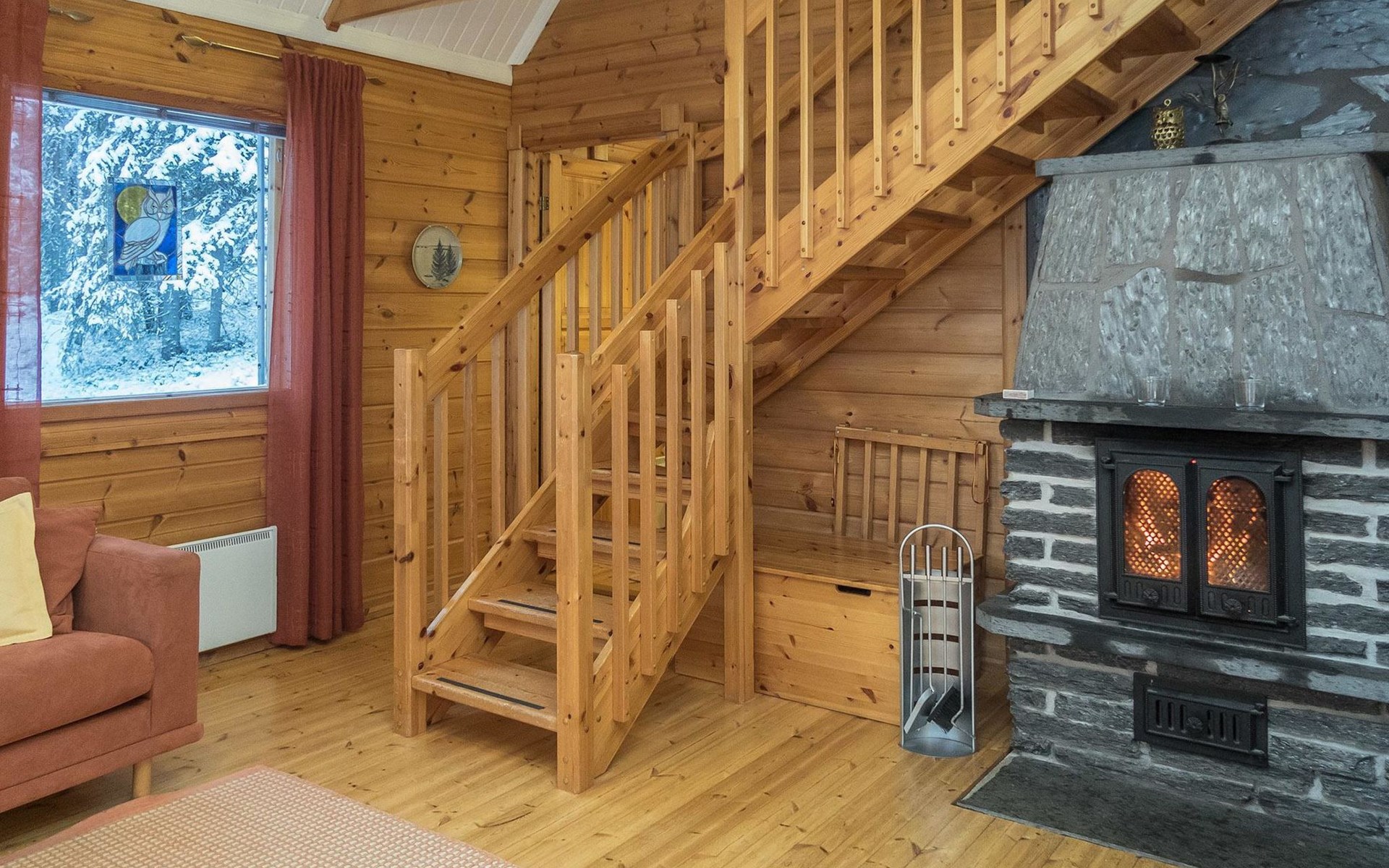 Log chalet 2004, living room/kitchen, bedroom double bed, utilities room/ dressing room, washroom, sauna (elec. stove), open porch, upstairs bedroom 2 beds (á 80 cm wide), recreation loft convertible sofa/ bed for two and balcony.