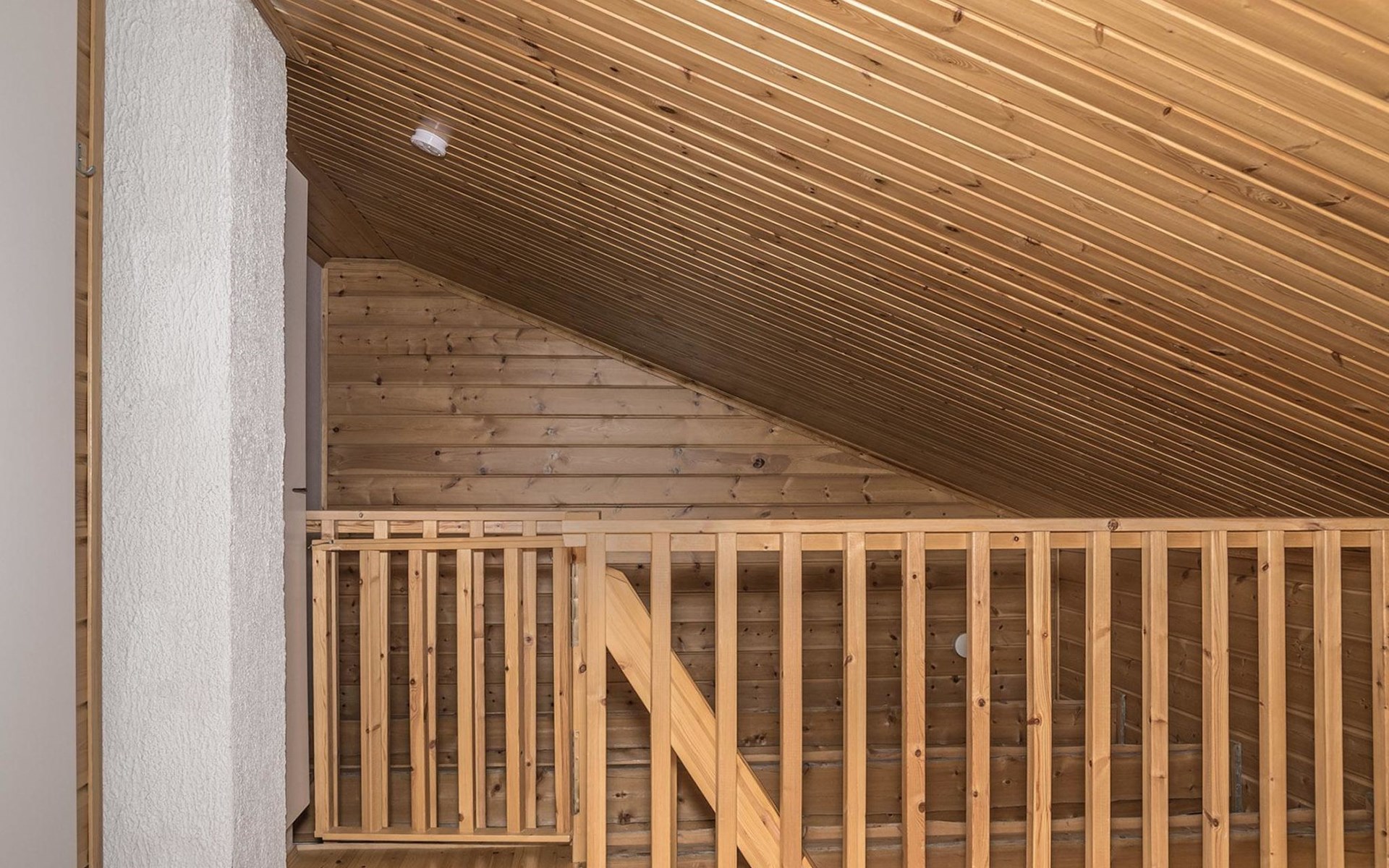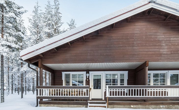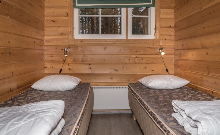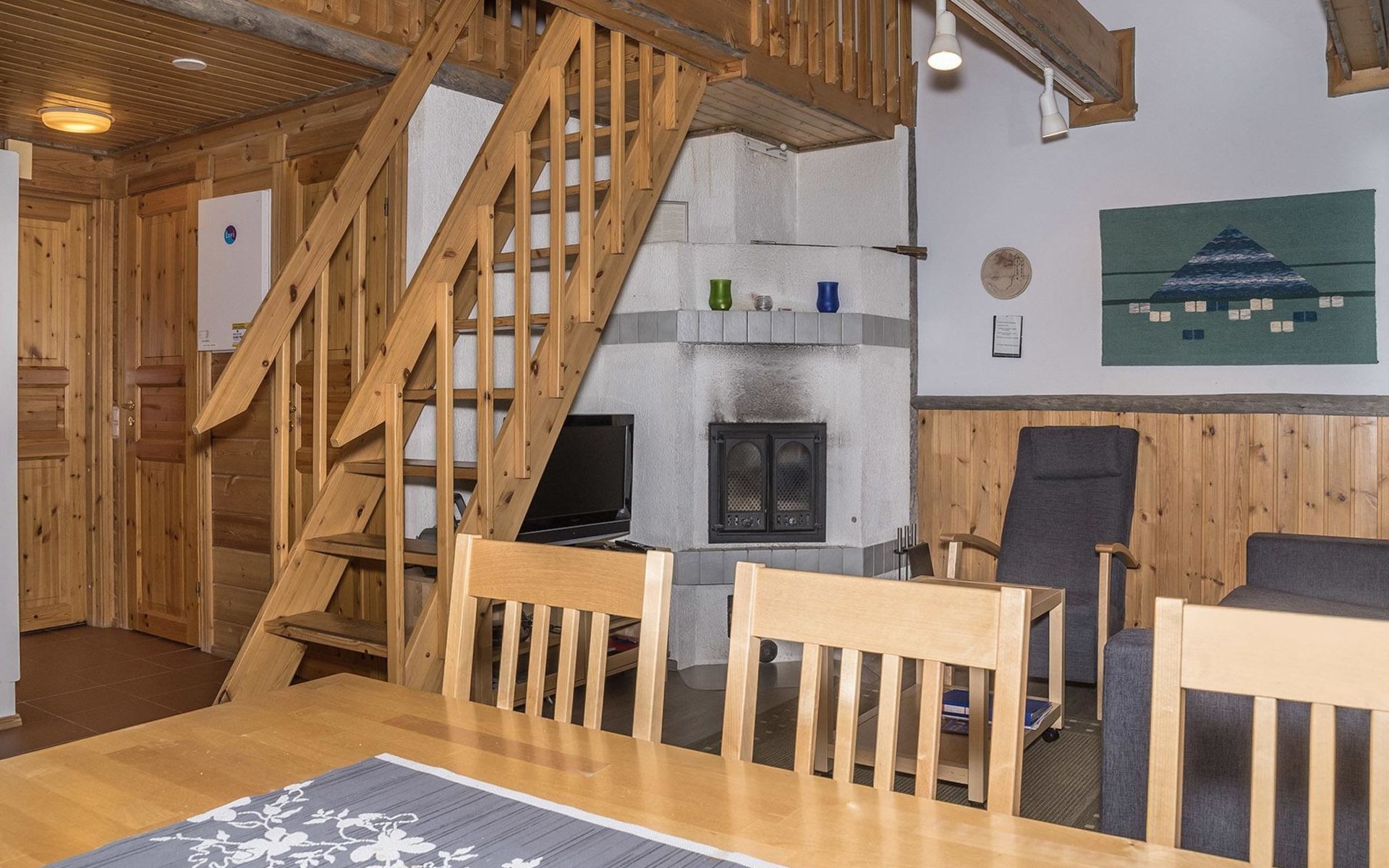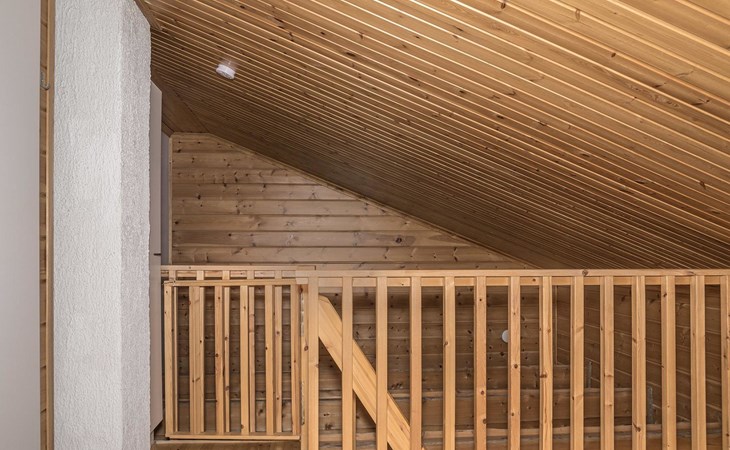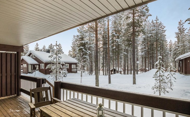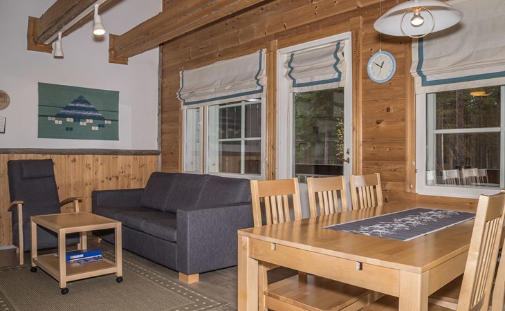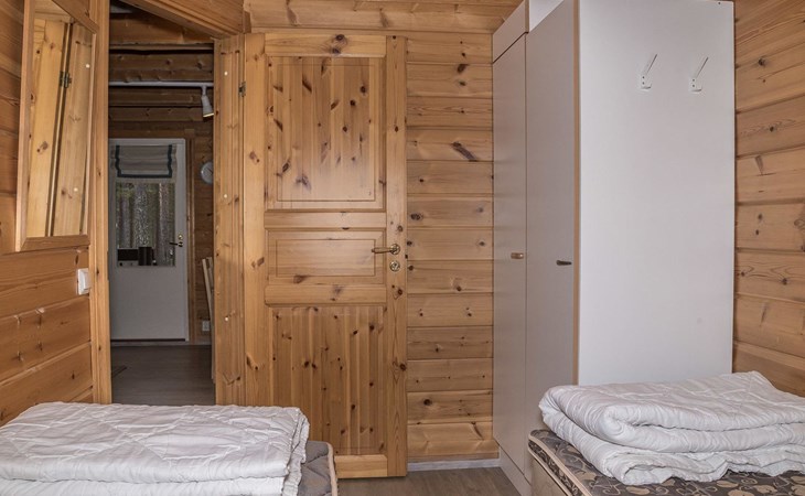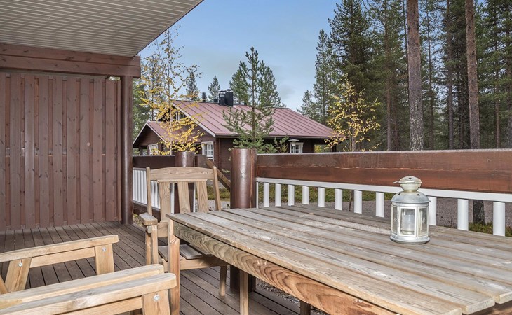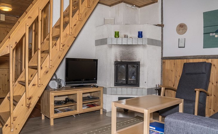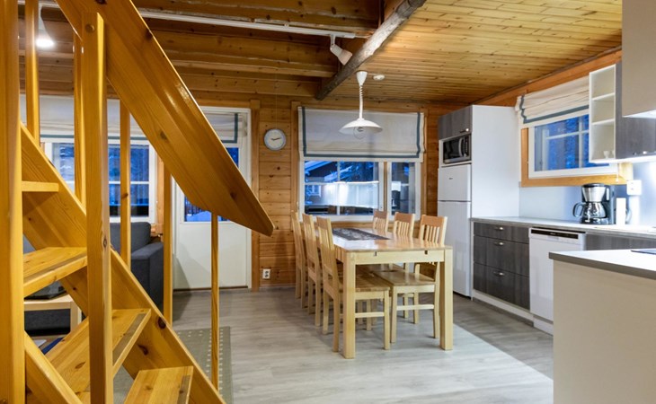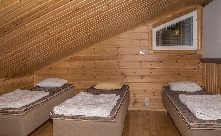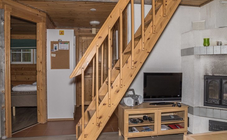 The apartment was renovated in summer 2019. It has a new spacious kitchen, living room, renovated bathroom, sauna and a separate toilet. It has one bedroom downstairs with two separate beds. In addition there are a kitchen, living area, sauna, bathroom and a separate toilet. The open lay-out balcony has three separate beds.