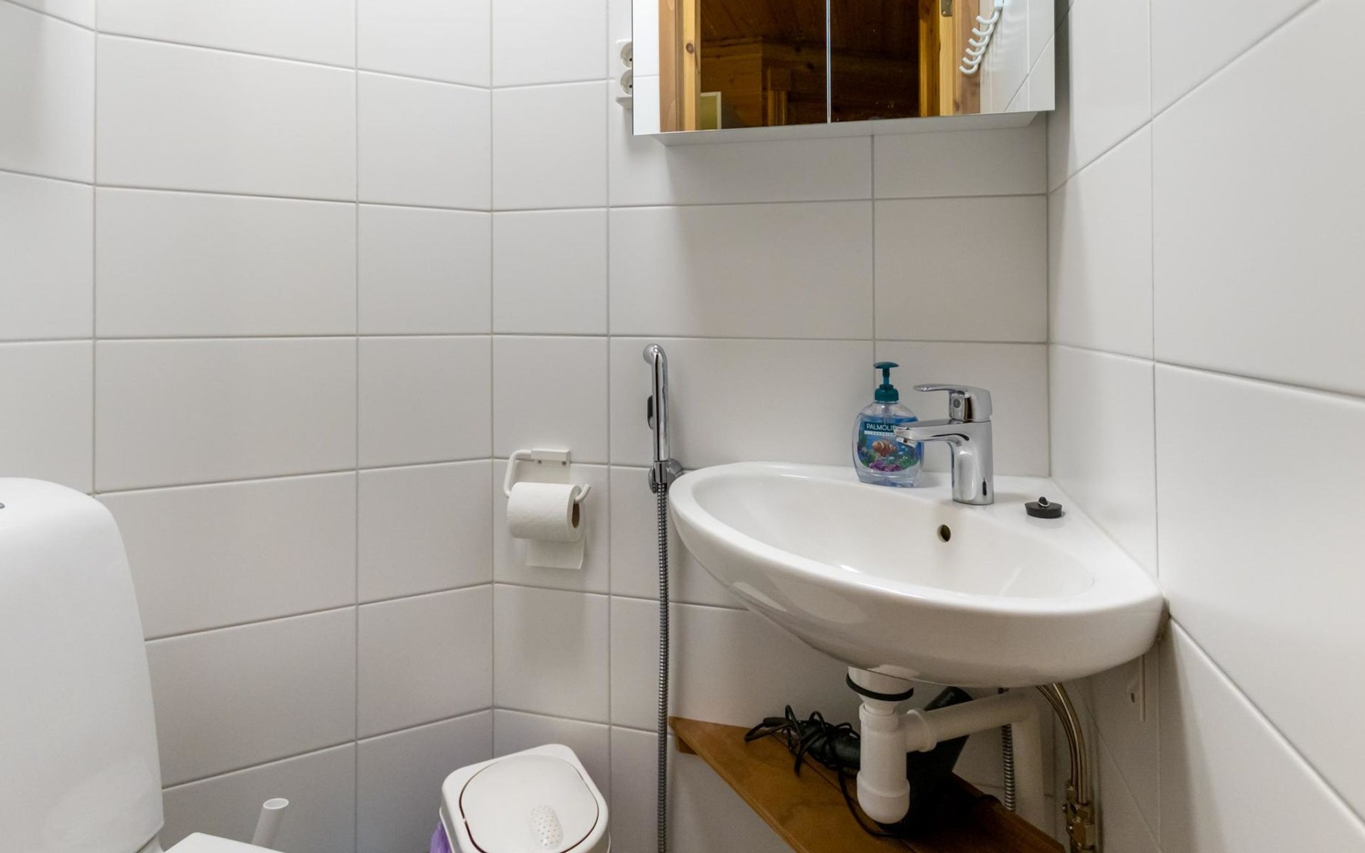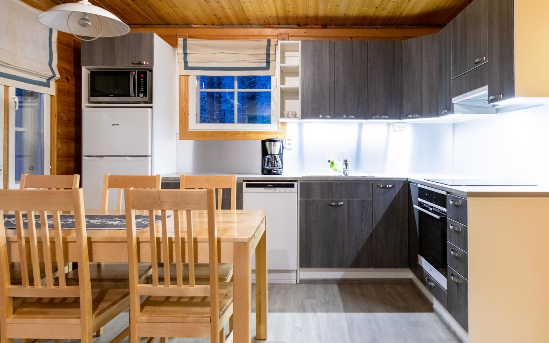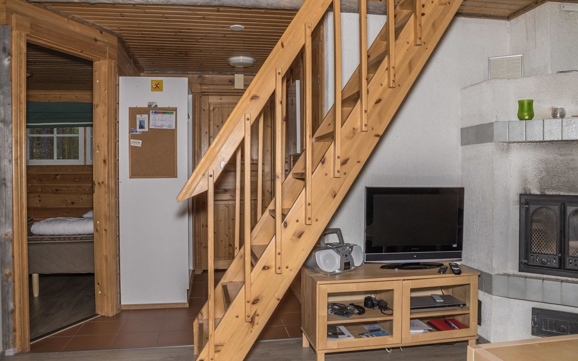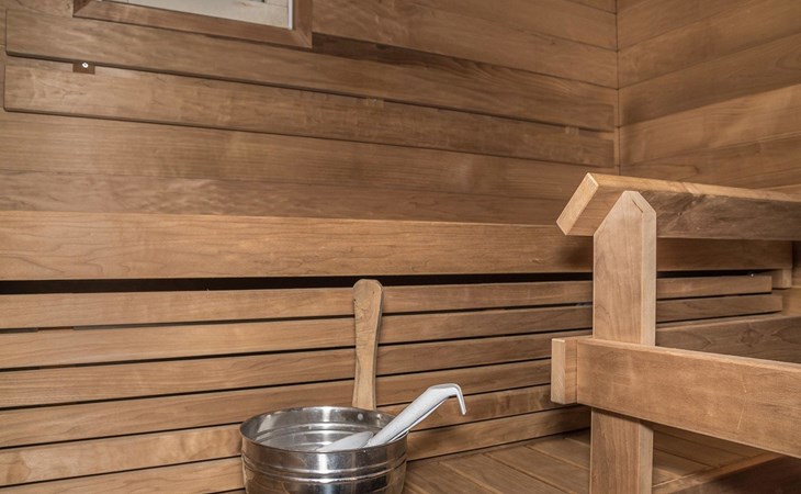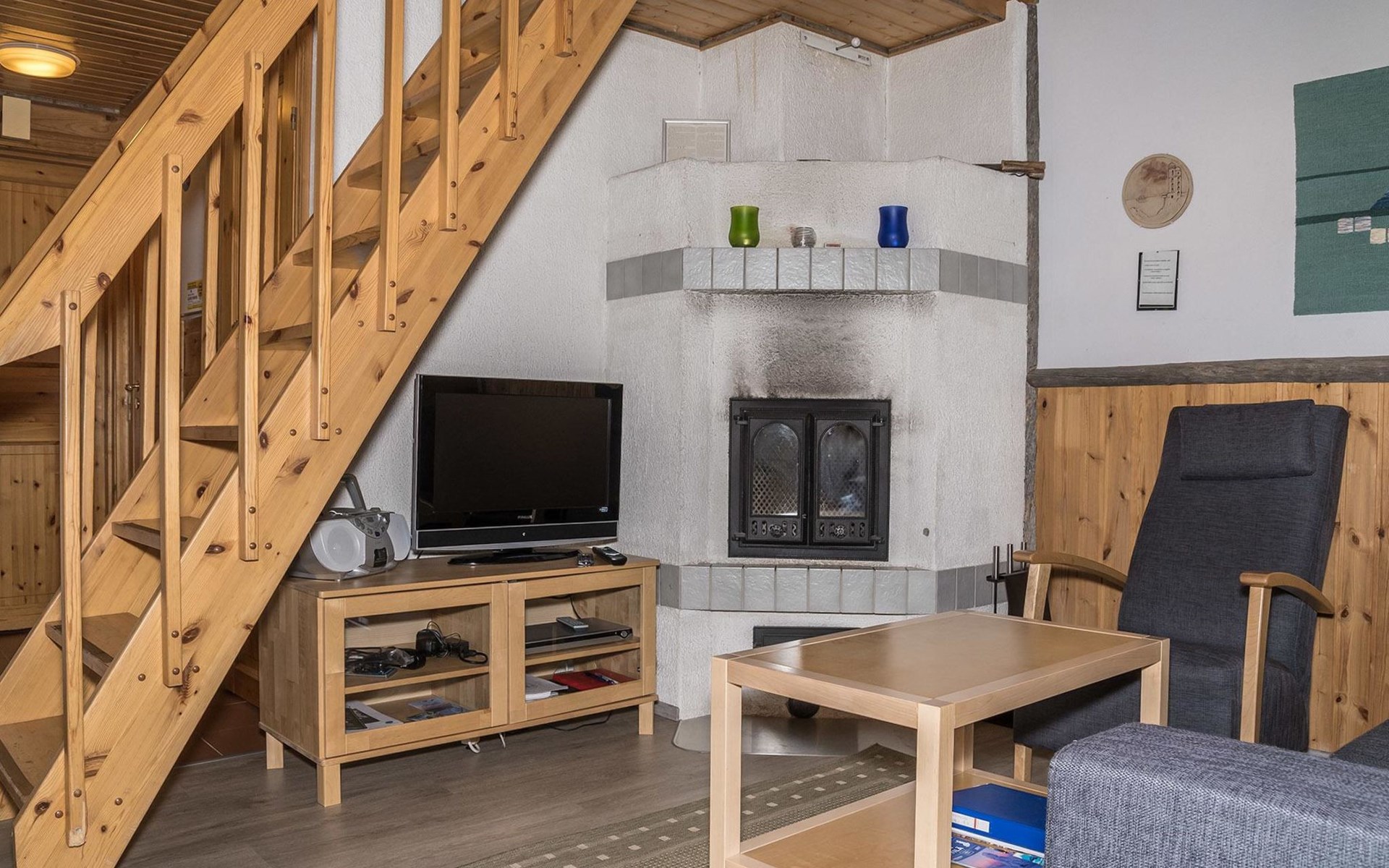 The apartment was renovated in summer 2019. It has a new spacious kitchen, living room, renovated bathroom, sauna and a separate toilet. It has one bedroom downstairs with two separate beds. In addition there are a kitchen, living area, sauna, bathroom and a separate toilet. The open lay-out balcony has three separate beds.