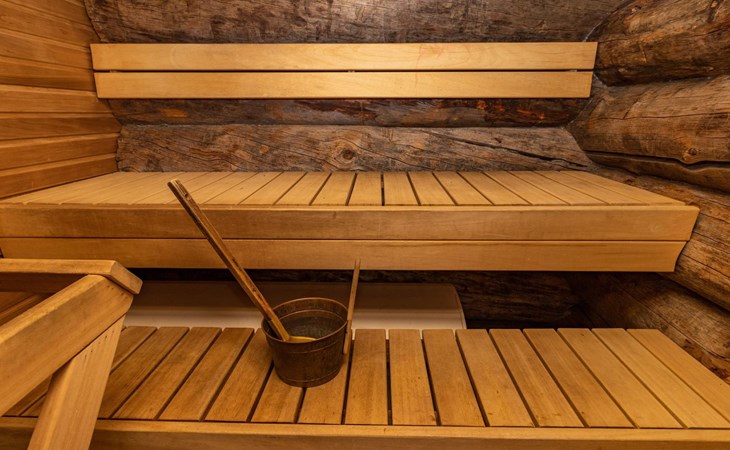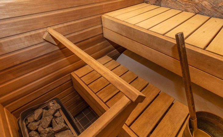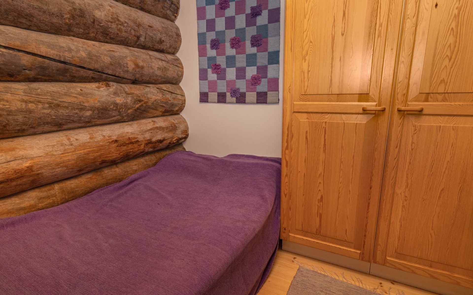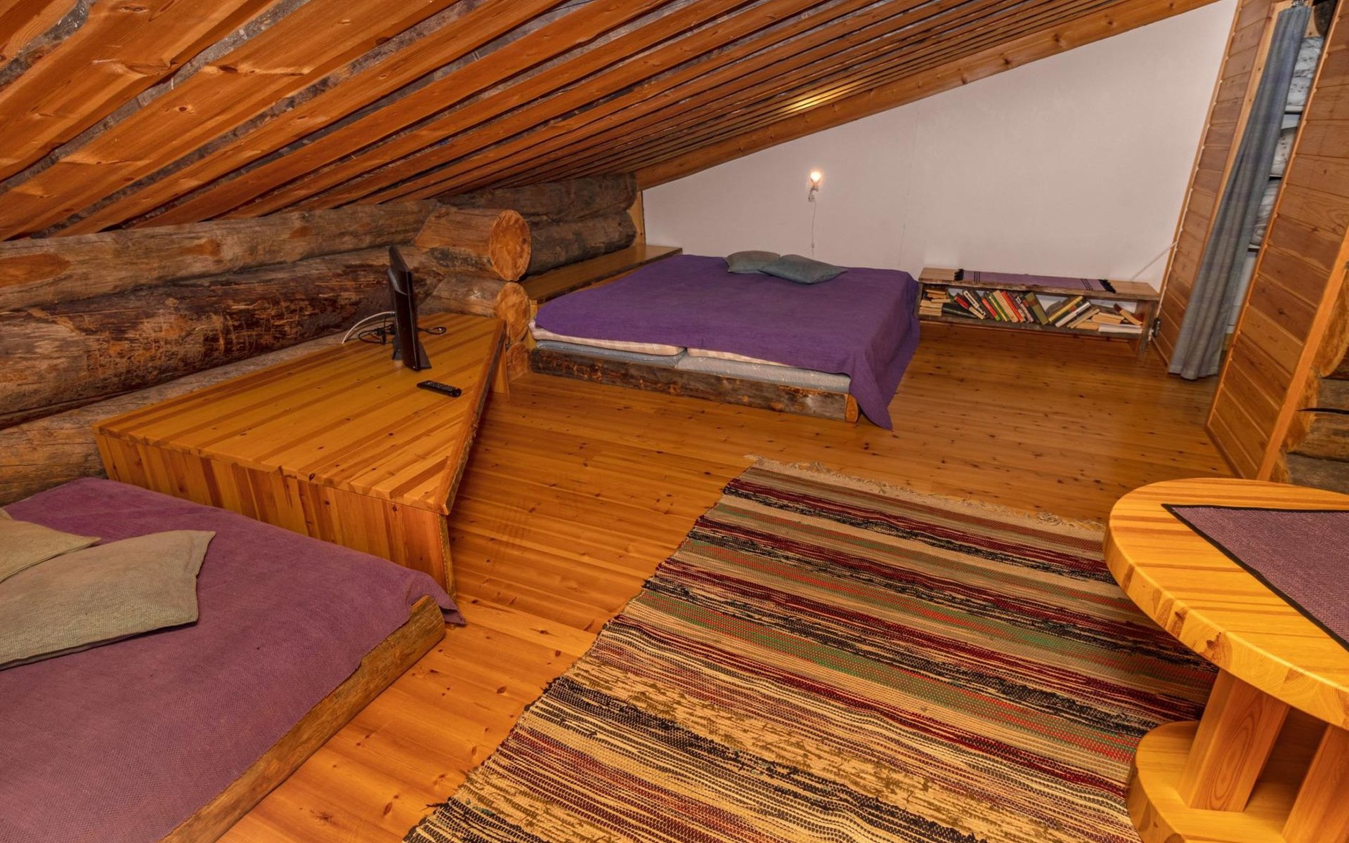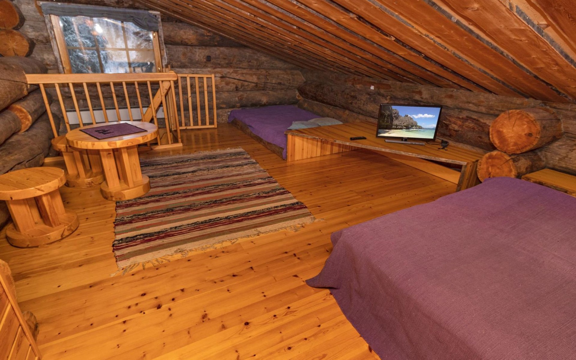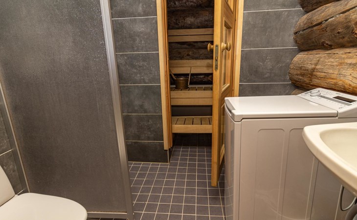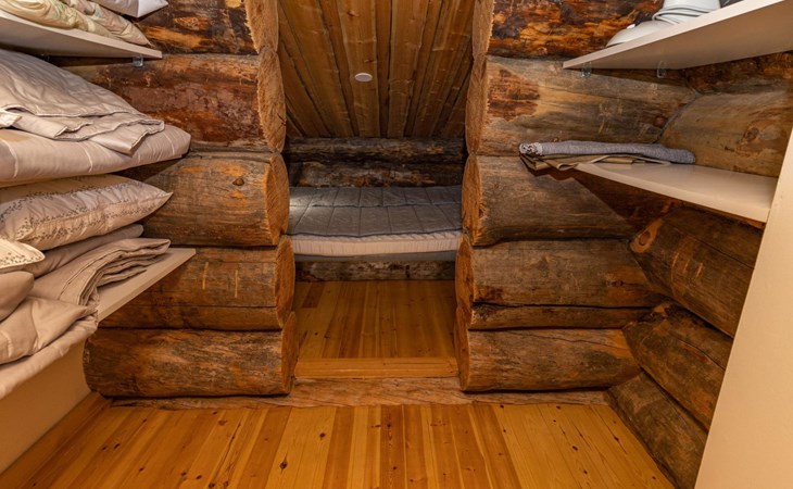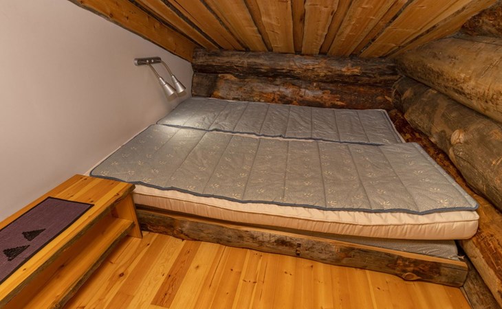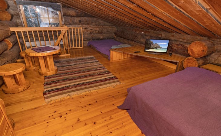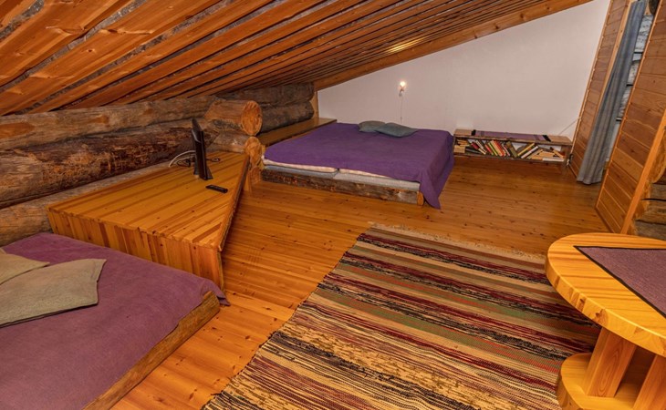 The accommodation includes a sleeping alcove (no door) on the ground floor with a 120 cm wide bed. On the upper floor, there is a sleeping area for two and an open loft with three single beds, providing accommodation for a total of six people. Additionally, the cabin features a living room/kitchen and a comfortable electric sauna for relaxation.