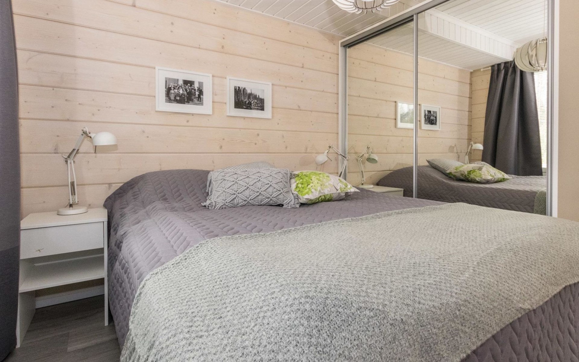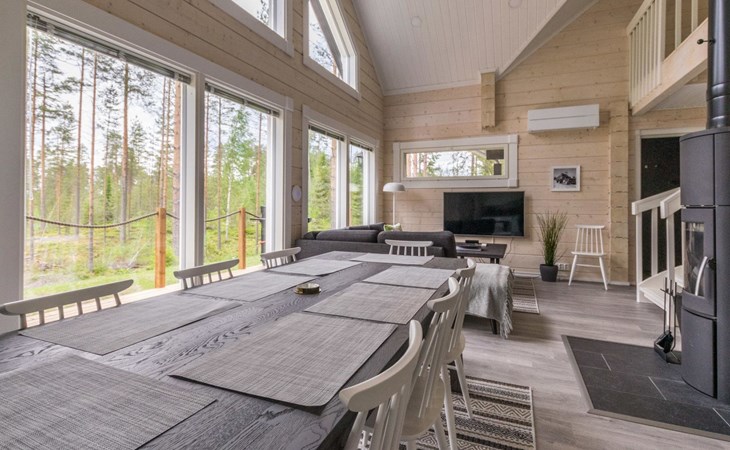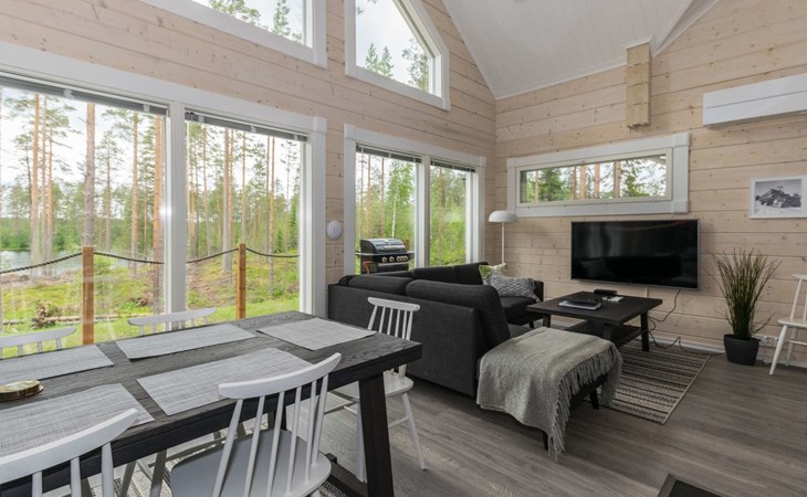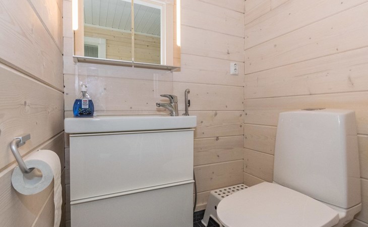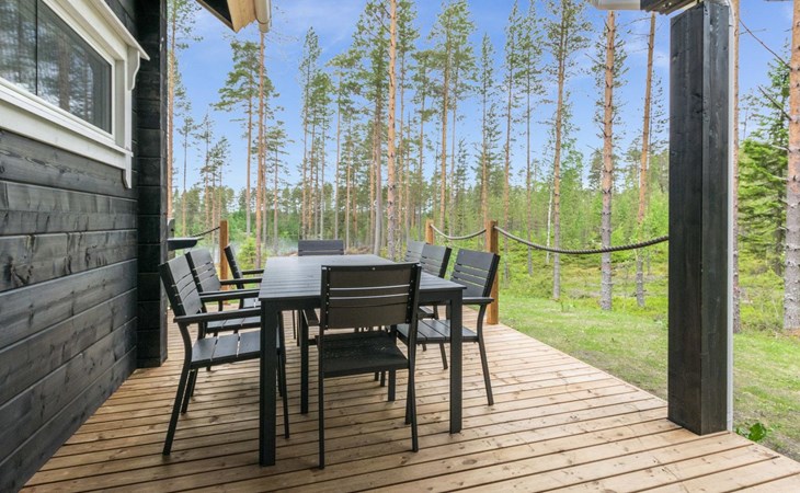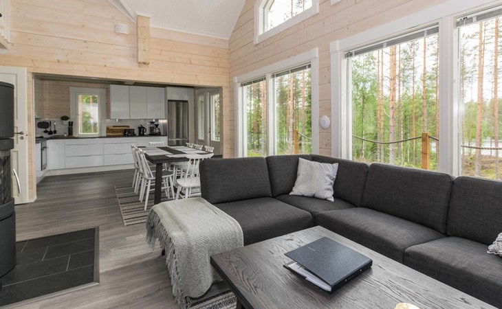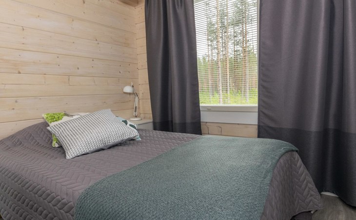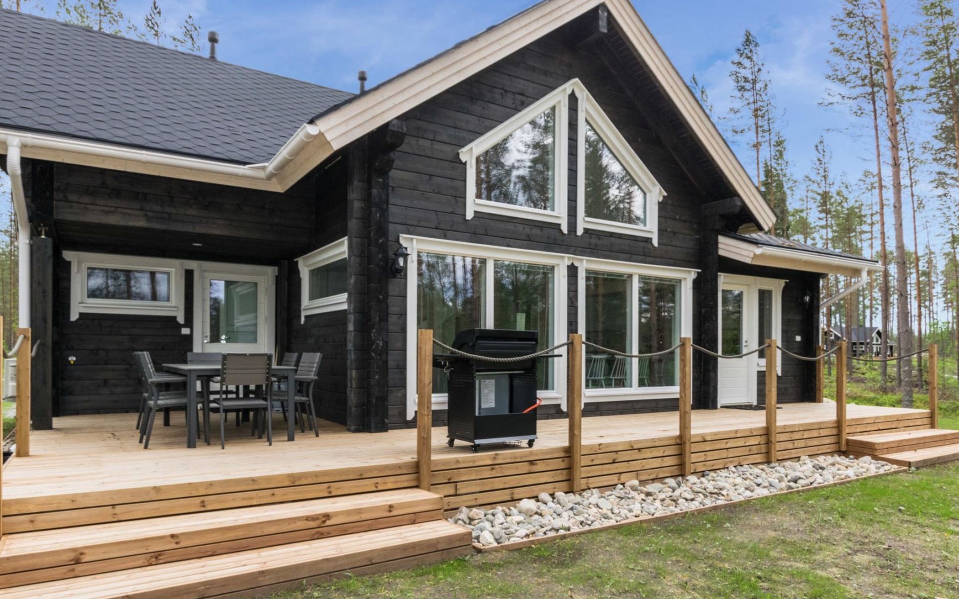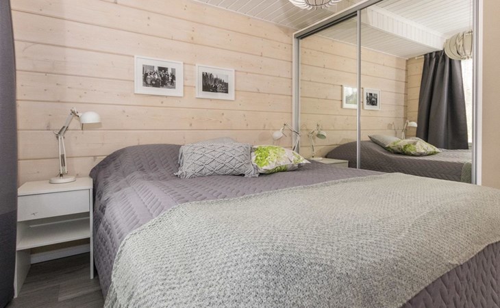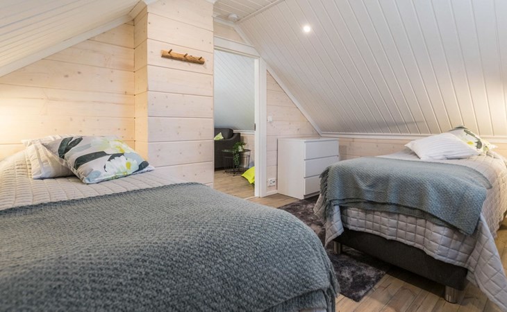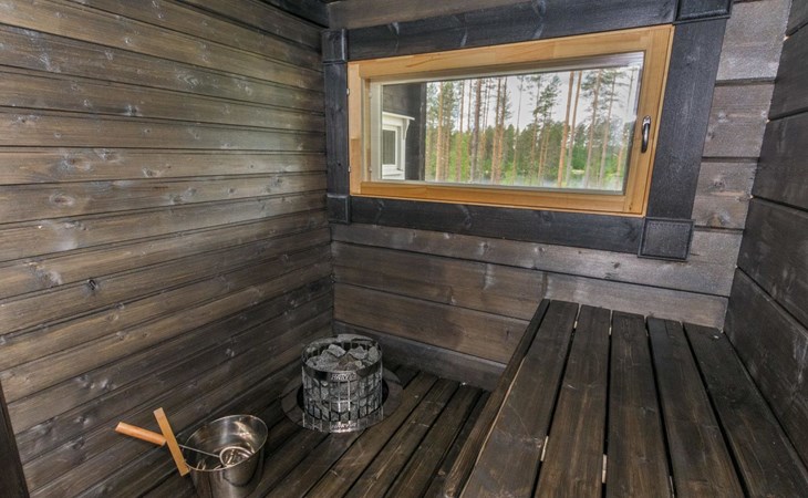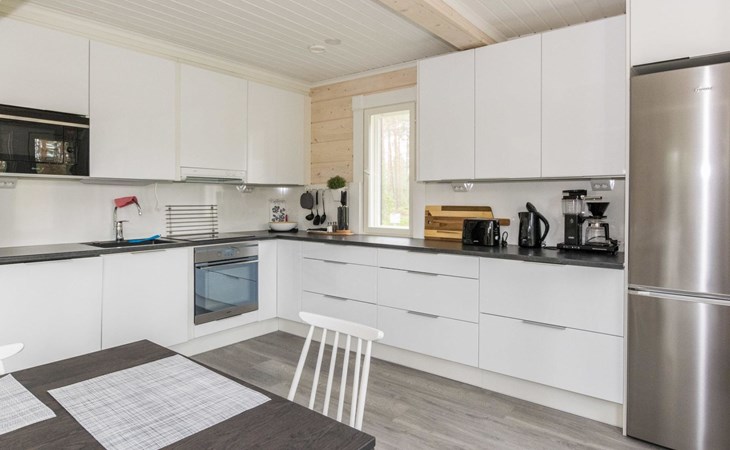 Log cabin 2019, bedroom 1: two 80 x 200 cm beds, bedroom 2: 120 x 200 cm bed, bedroom 3: two 80 x 200 cm beds, bedroom 4: two 80 x 200 cm beds, sofa bed (140 x 190 cm spare bed) in the lobby on the upper floor. Living room with wood-burning stove, dining group which can be extended (for 10 people group), well-equipped kitchen corner, sauna (electric sauna stove), washroom, terrace with gas grill and garden furniture.