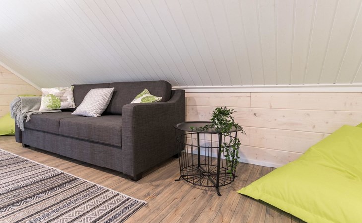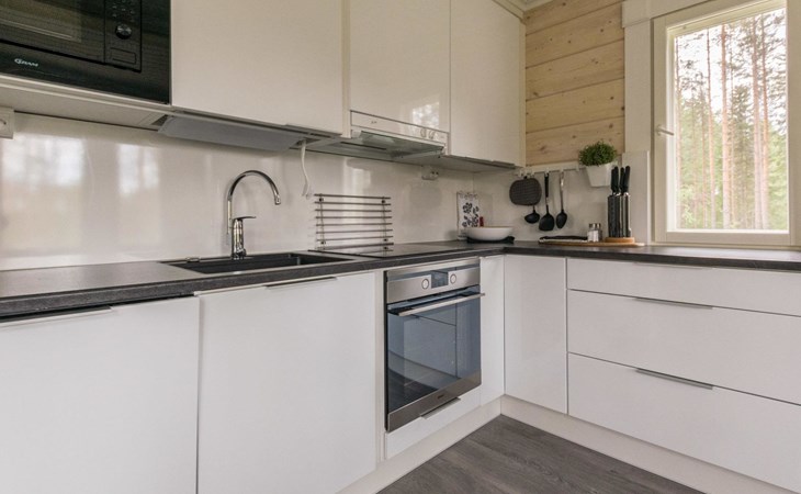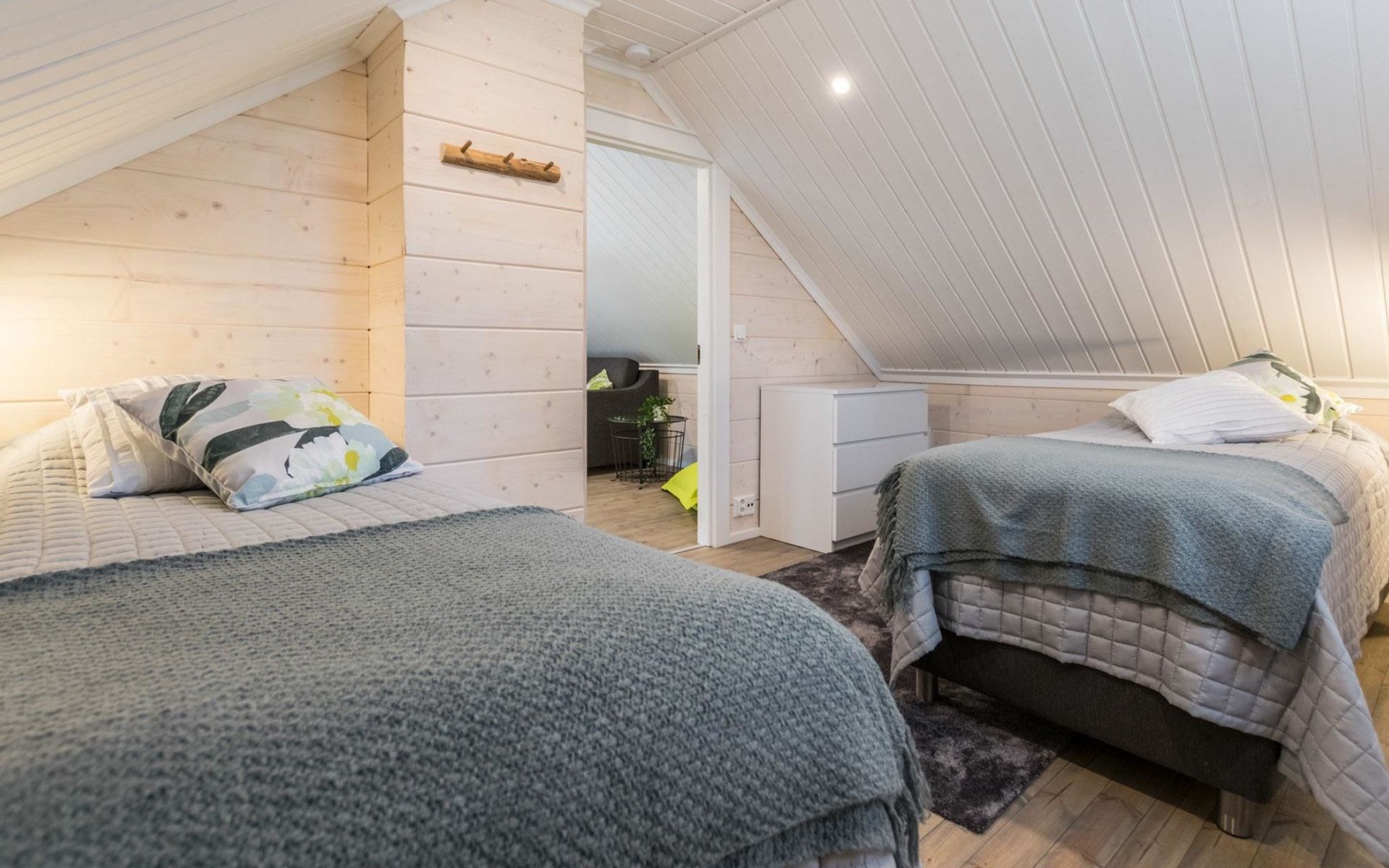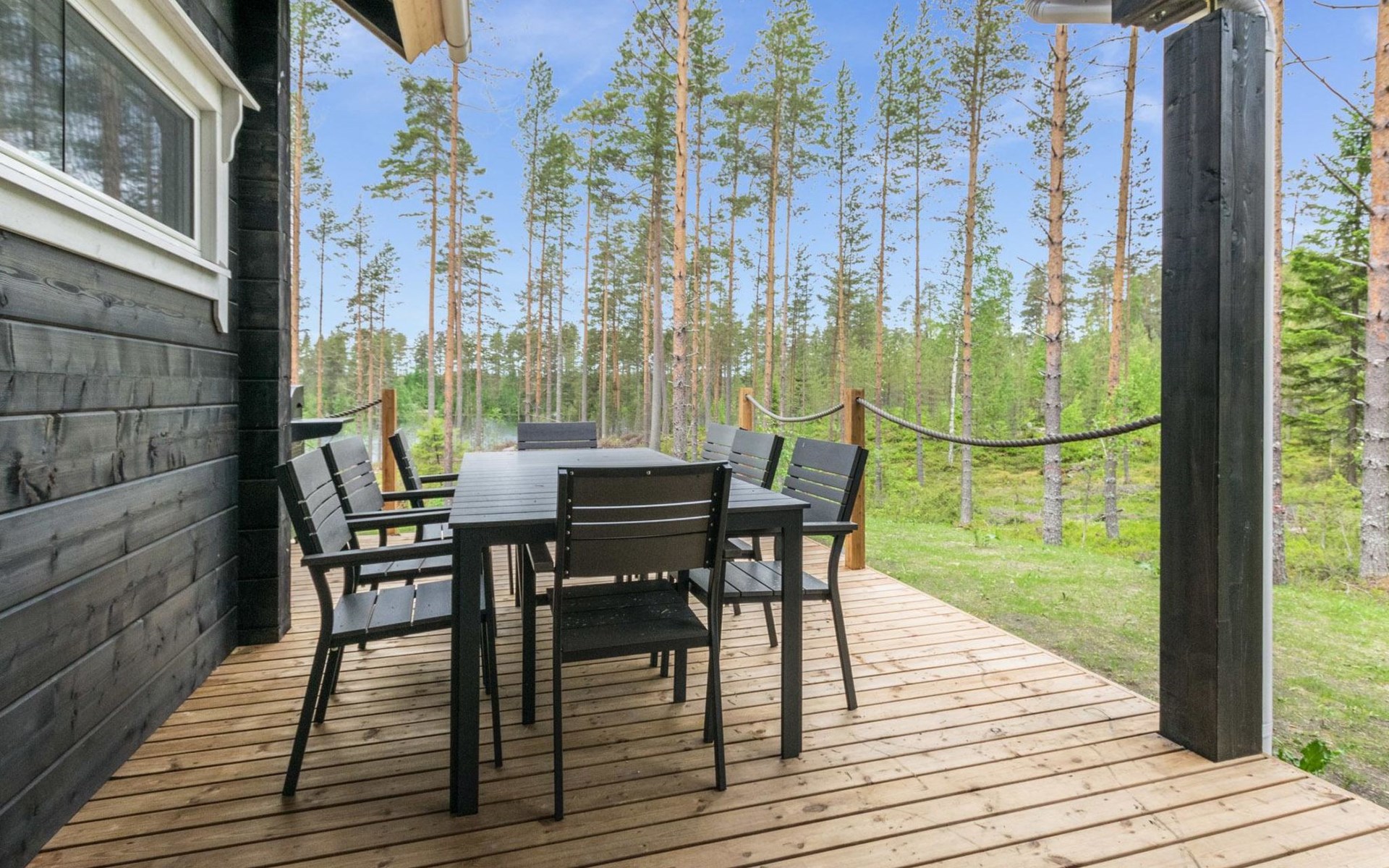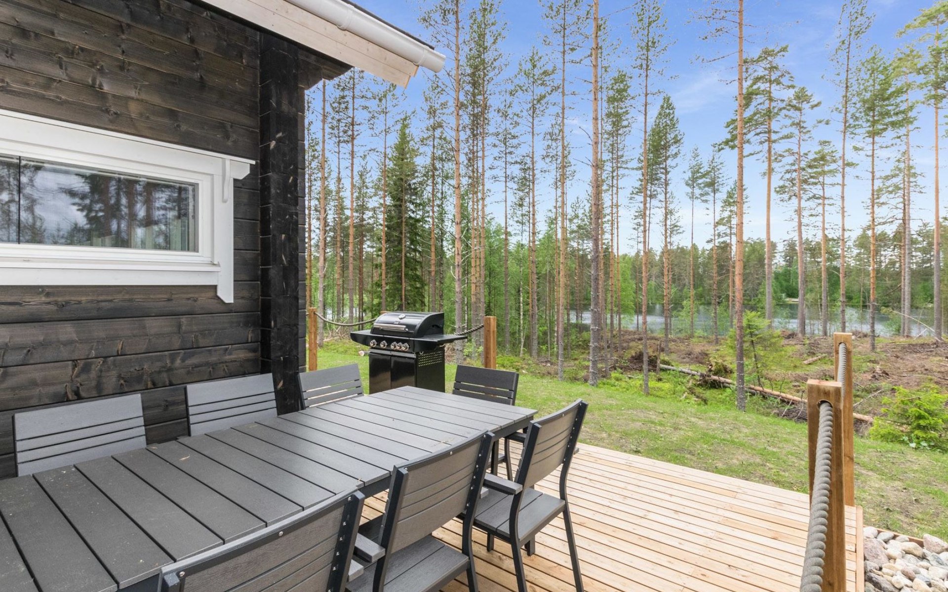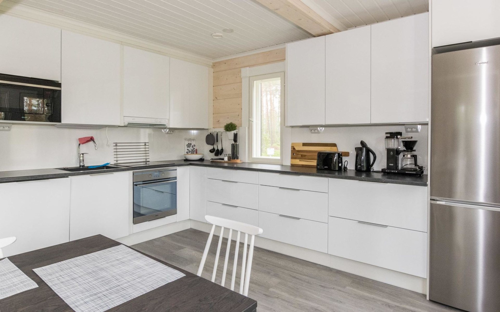 Log cabin 2019, bedroom 1: two 80 x 200 cm beds, bedroom 2: 120 x 200 cm bed, bedroom 3: two 80 x 200 cm beds, bedroom 4: two 80 x 200 cm beds, sofa bed (140 x 190 cm spare bed) in the lobby on the upper floor. Living room with wood-burning stove, dining group which can be extended (for 10 people group), well-equipped kitchen corner, sauna (electric sauna stove), washroom, terrace with gas grill and garden furniture.