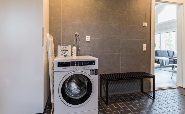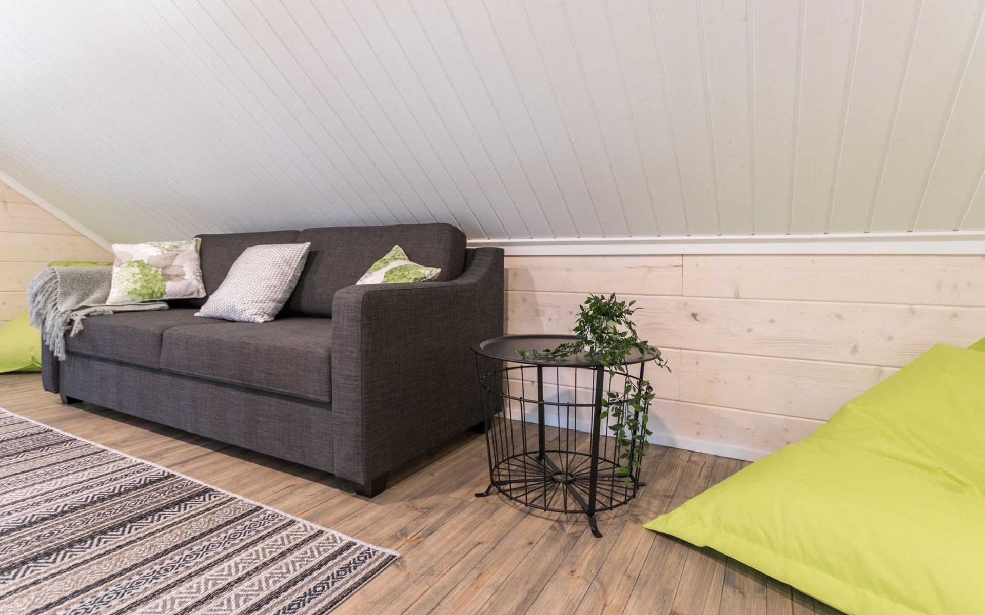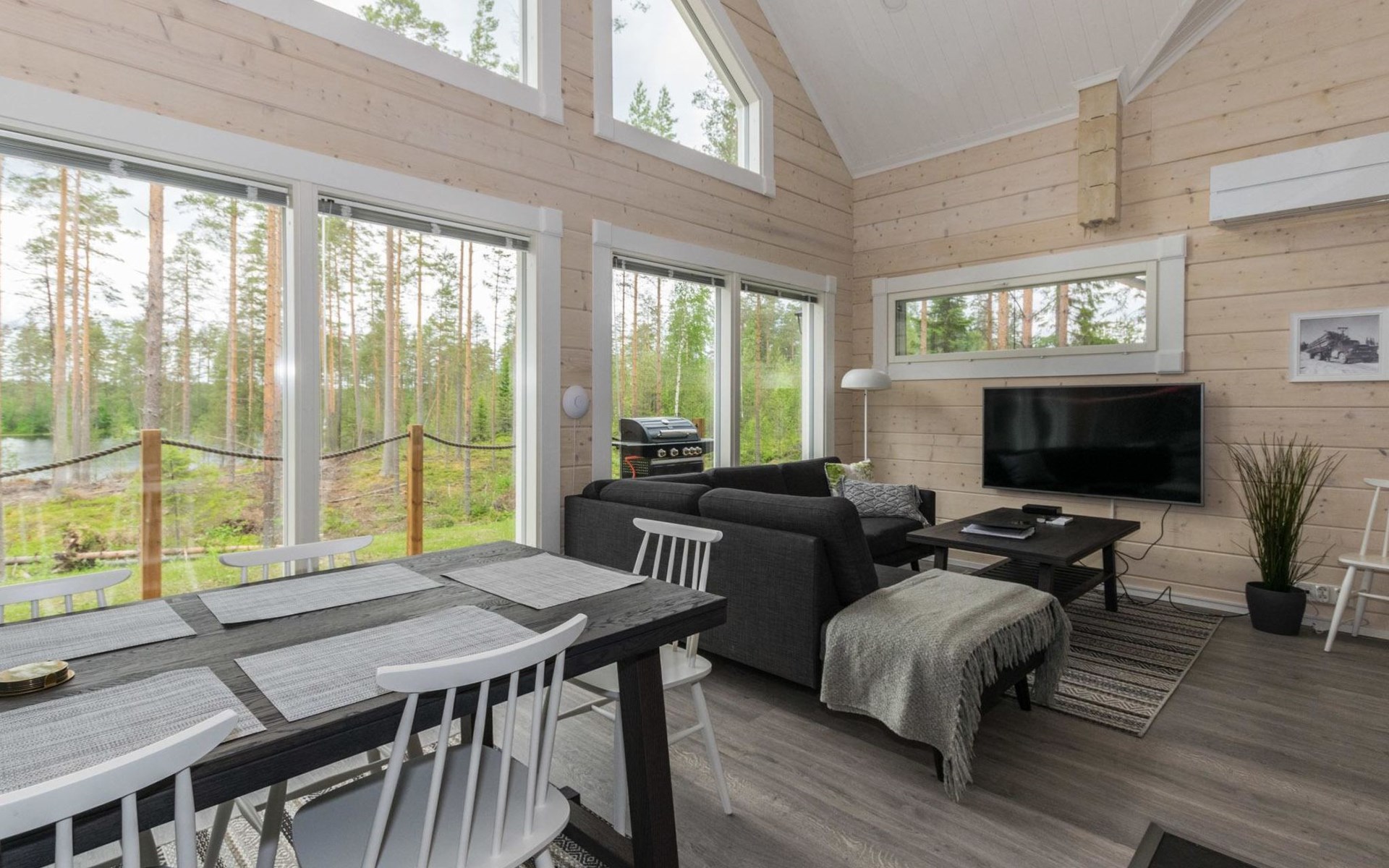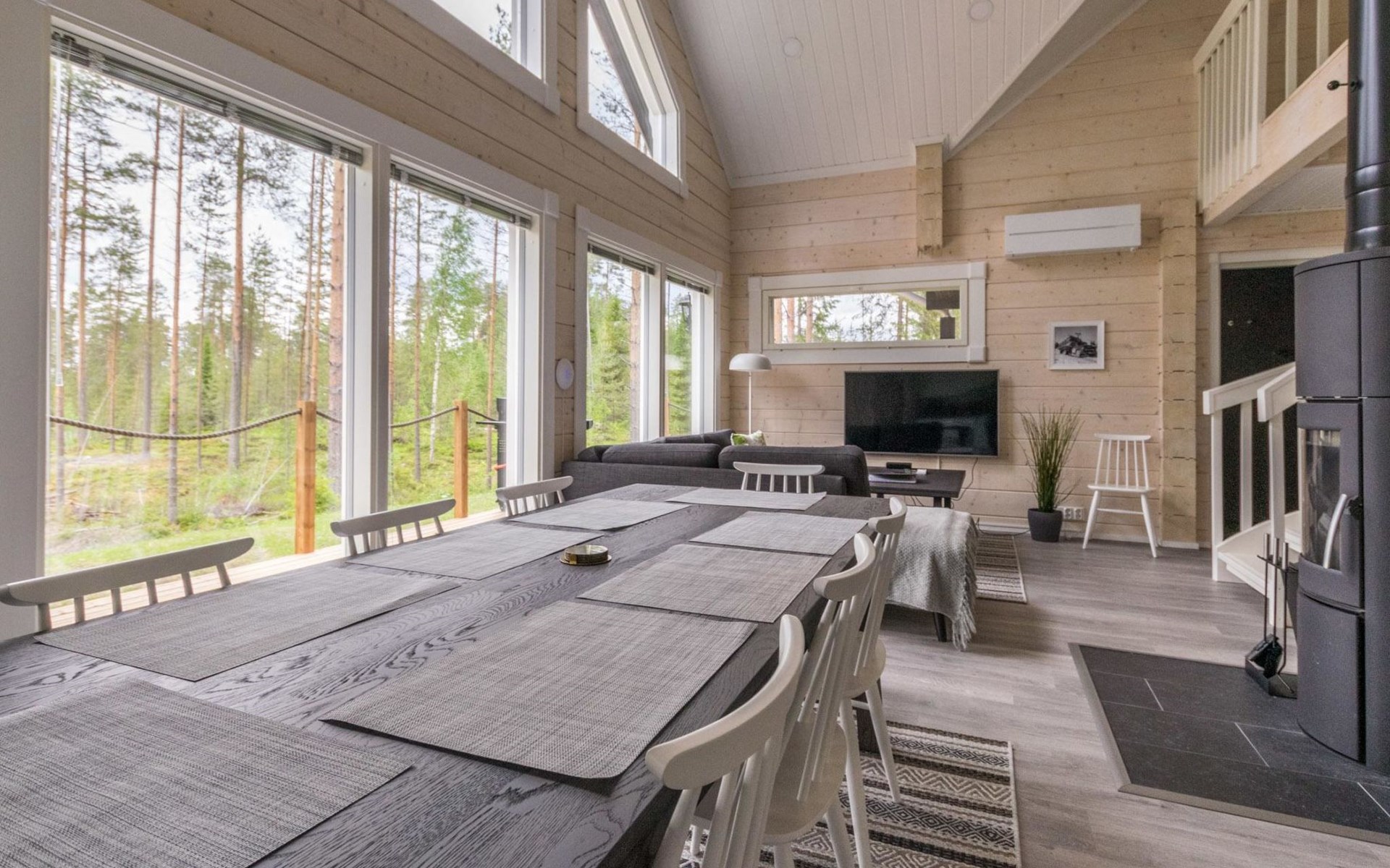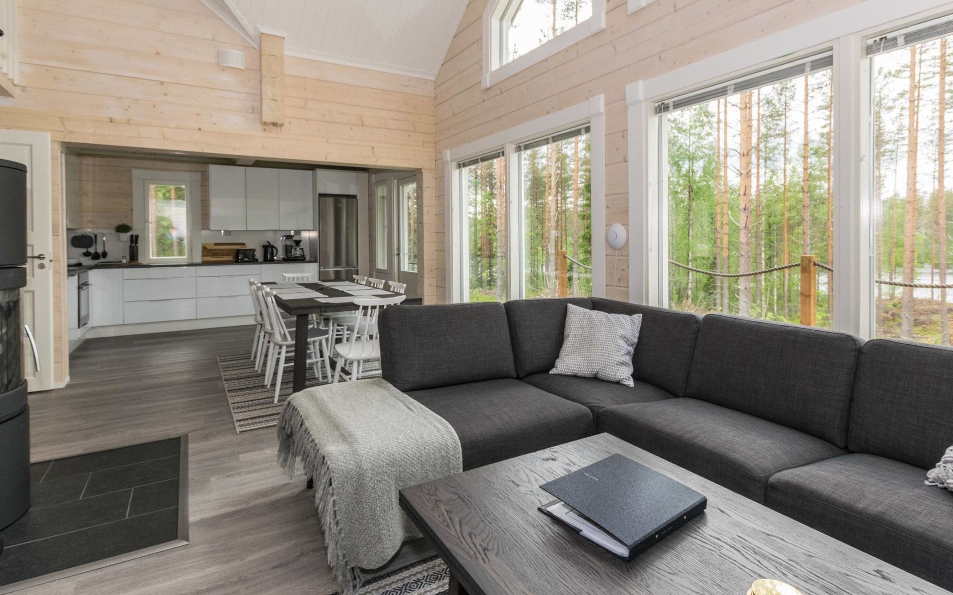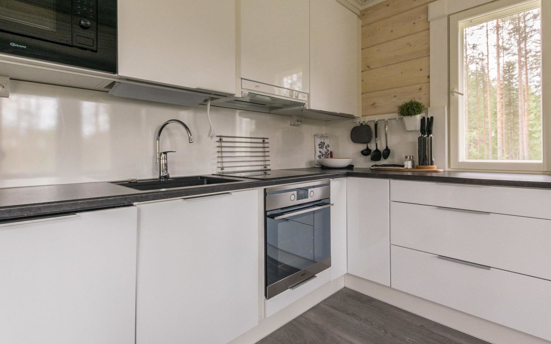 Log cabin 2019, bedroom 1: two 80 x 200 cm beds, bedroom 2: 120 x 200 cm bed, bedroom 3: two 80 x 200 cm beds, bedroom 4: two 80 x 200 cm beds, sofa bed (140 x 190 cm spare bed) in the lobby on the upper floor. Living room with wood-burning stove, dining group which can be extended (for 10 people group), well-equipped kitchen corner, sauna (electric sauna stove), washroom, terrace with gas grill and garden furniture.