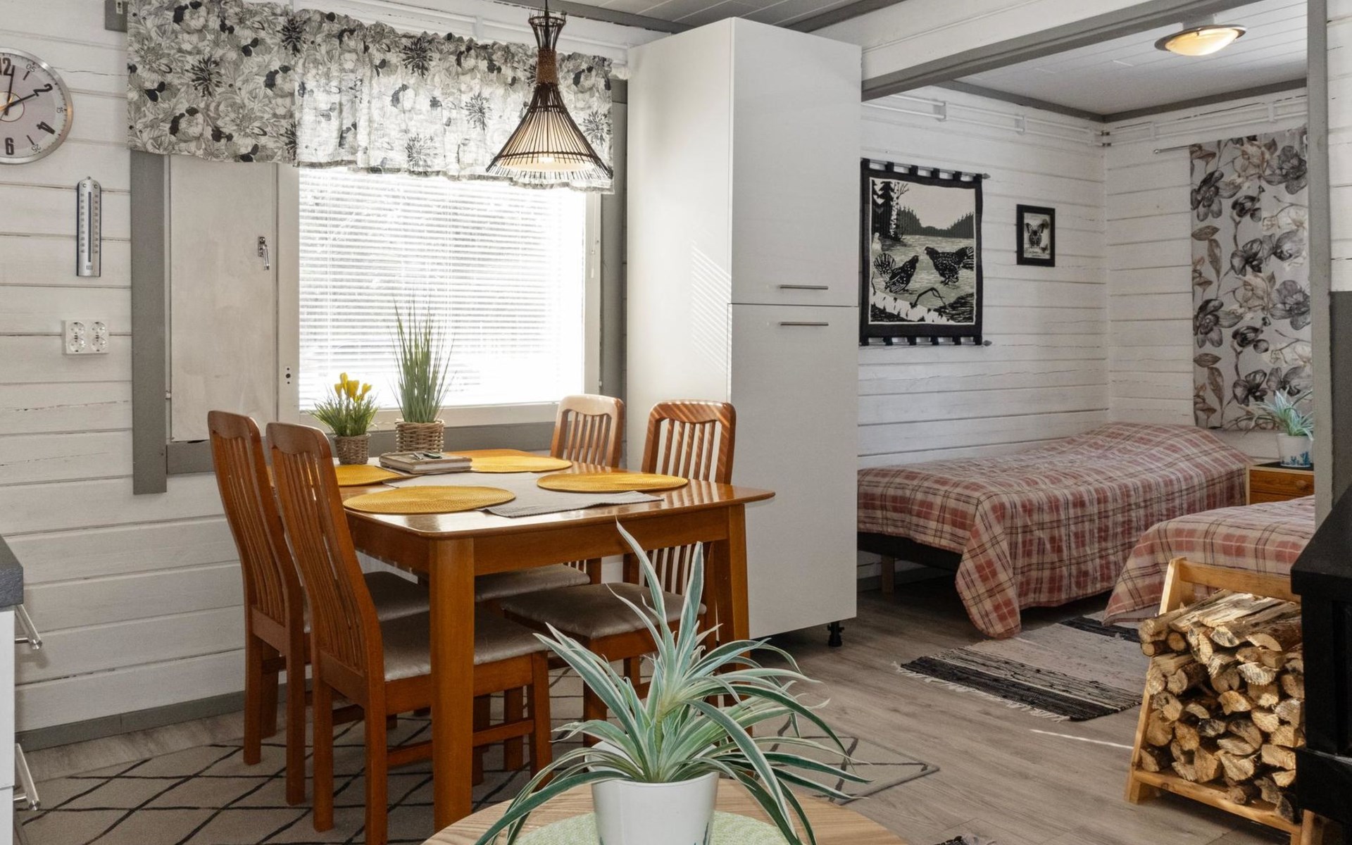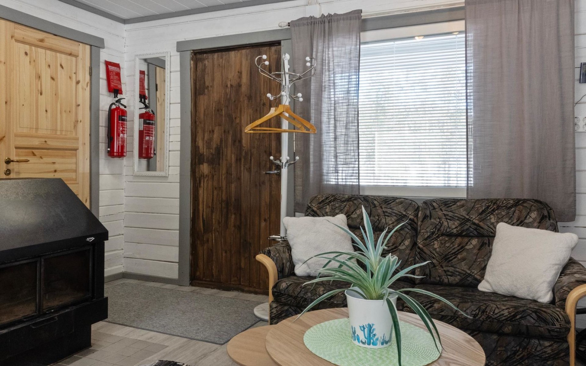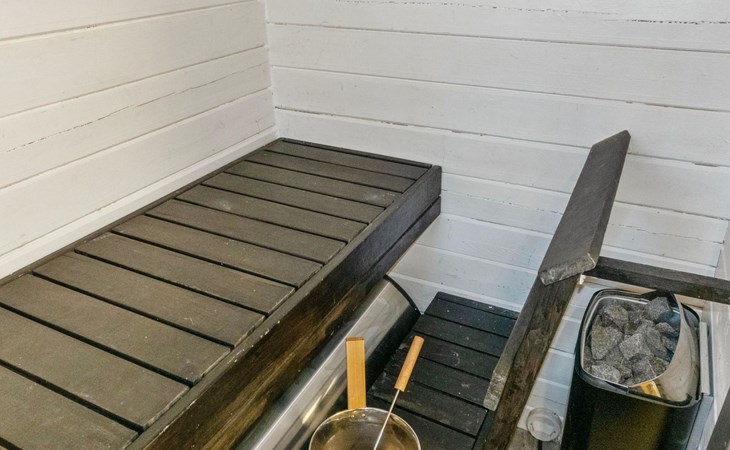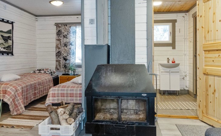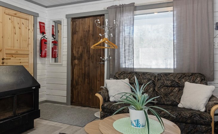 Log cabin, built in 2022. Sofa bed in the kitchen/living room, 2 beds in the alcove (no door, curtain, etc.), sauna, washroom/WC and small covered terrace.