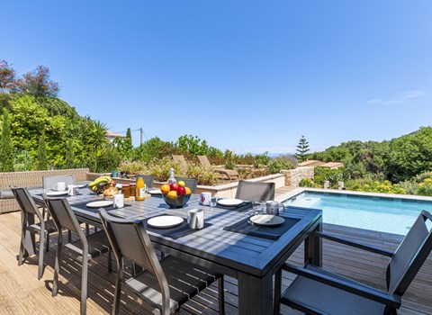 Openslaande deuren leiden vanuit de ruime woonkamer met aangrenzende moderne keuken naar een groot terras. In het souterrain is er een mooie zitkamer, een volledig uitgeruste keuken, die goed toegankelijk is vanuit het zwembad. Het hoogtepunt van deze verdieping is de panoramische kamer met prachtig uitzicht over de hele baai. Vanaf hier heeft u direct toegang tot het prachtige zwembad met een diepte van bijna 2m. waarbij zwemplezier voor de kinderen is gegarandeerd. Bij het zwembad vindt u verder ligstoelen, parasols en toegang tot de lager gelegen tuin. Op dit niveau bevindt zich naast het zwembad ook een volledig uitgeruste keuken en twee drank(wijn)koelkasten.