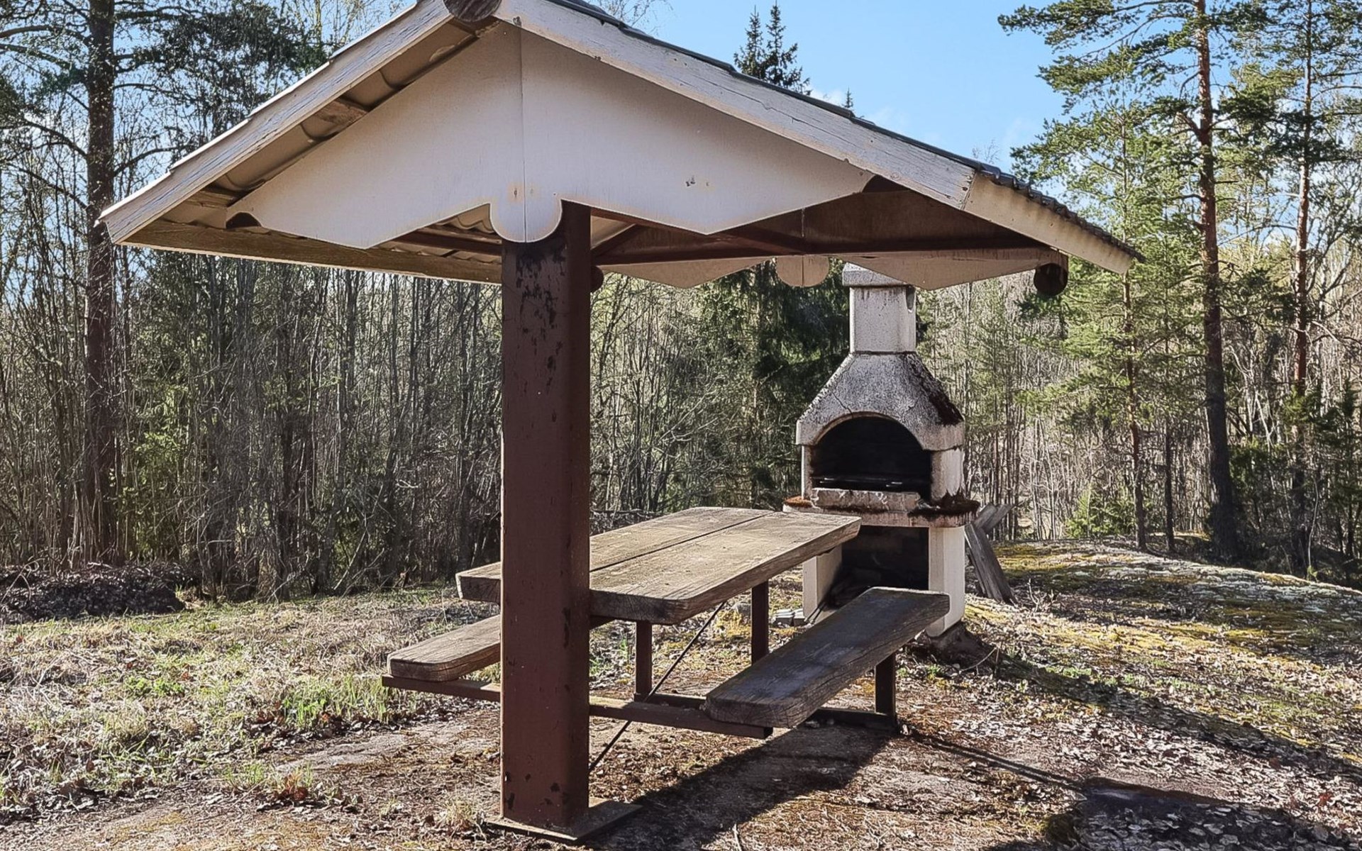 Fixed grill in the yard. In the grill hut, there is a table and seats for six.