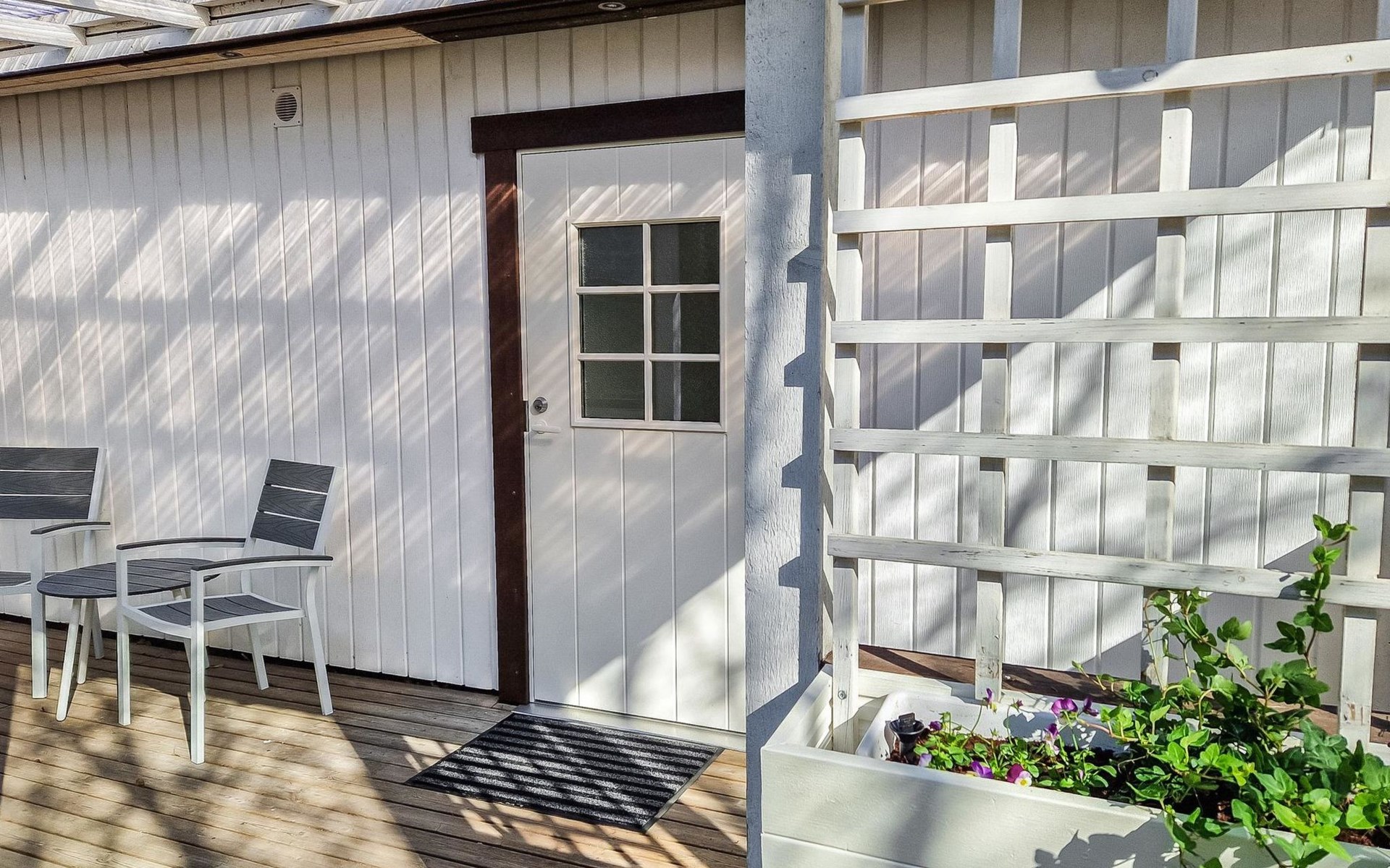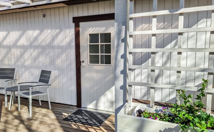 Covered terrace where you can enjoy, for example, your morning coffee comfortably. The plot is flat and grassy. A fenced yard where a dog can be kept free under supervision or on a leash.