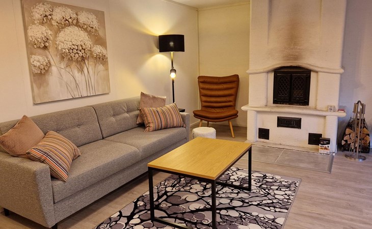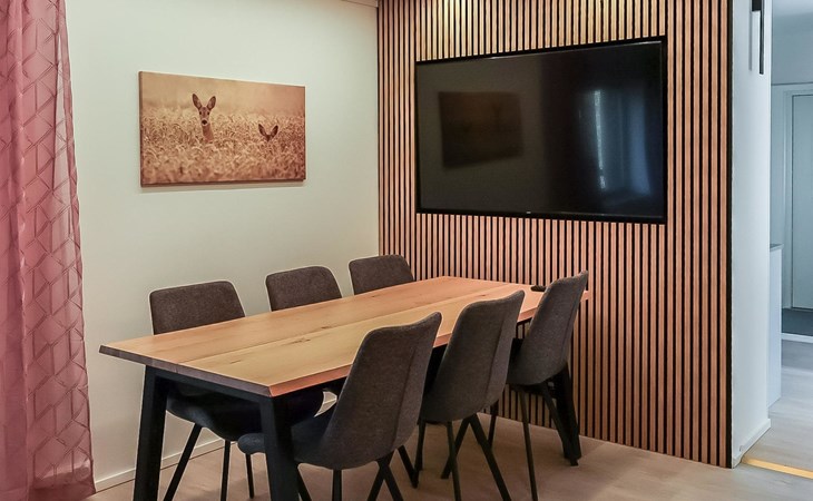The living room features a heat-storing fireplace and a long table for eight people. The TV is placed on the wall above the table so it can be used for meetings.