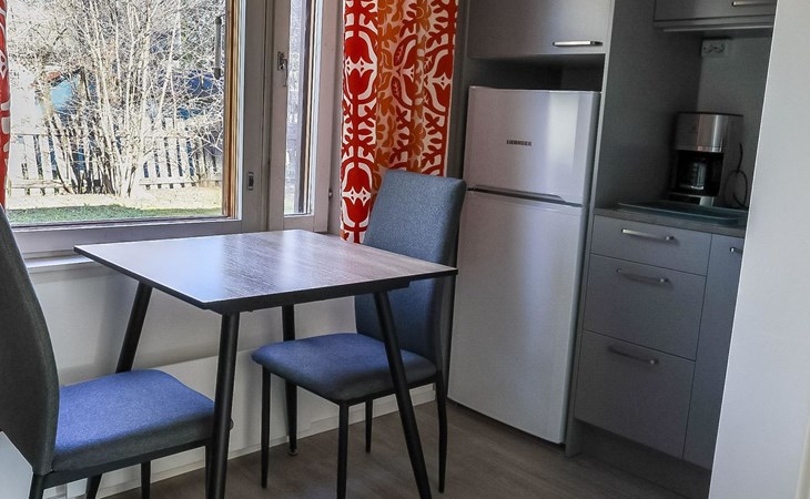 The kitchen is well-equipped, and the bedroom has a 160 cm wide double bed.
