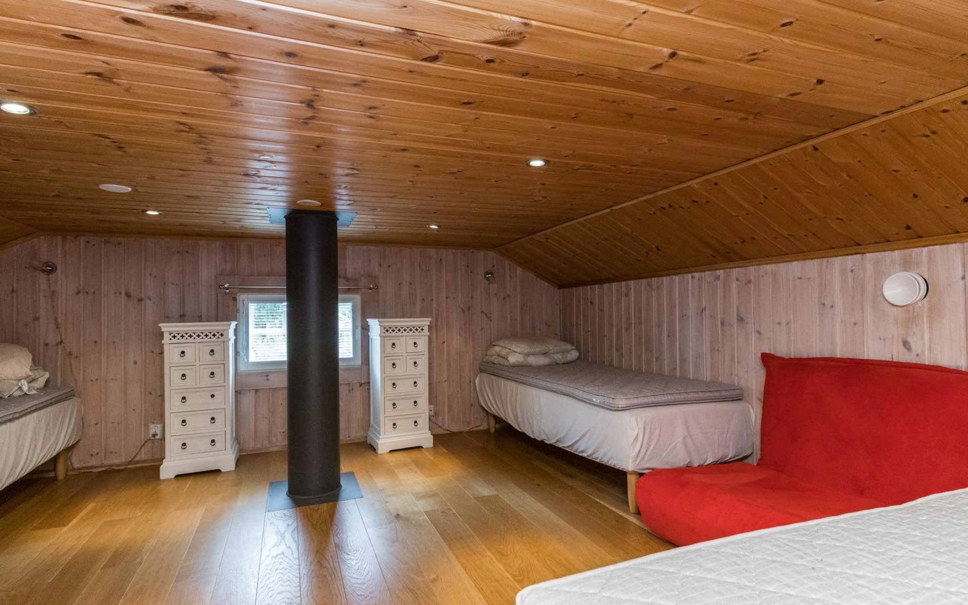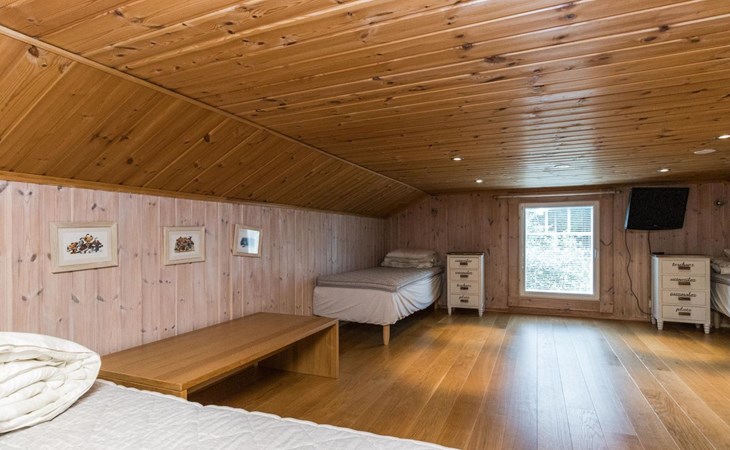 The upper floor has a low but spacious loft with three beds at each end (a total of 6 beds, size 80 x 200 cm each). Please note that the villa is rented for a maximum of 8 people.