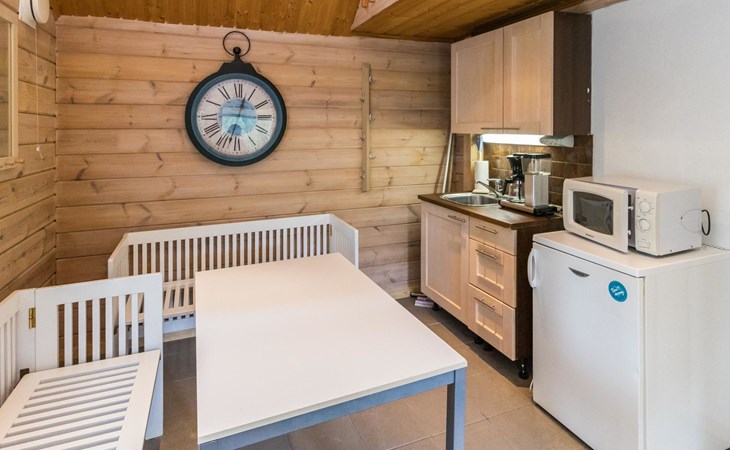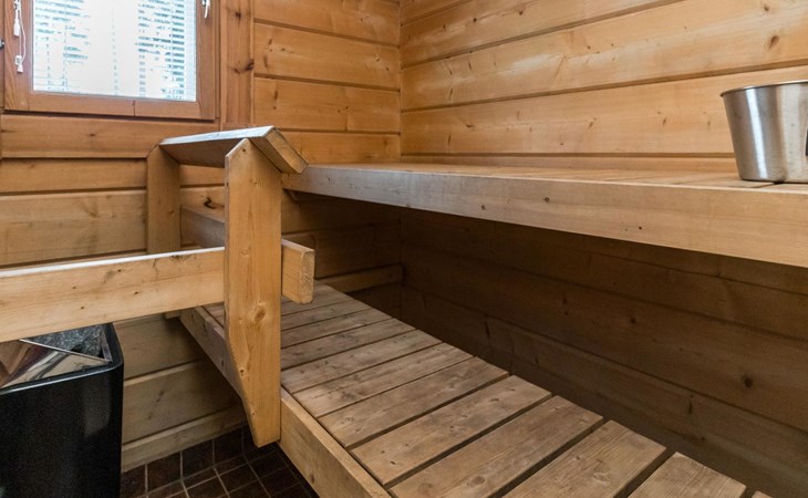 On the ground floor of the main building, there is a large living room/kitchen area with a high ceiling. The kitchen is well-equipped, and there is plenty of space for a larger group to dine together. Two bedrooms, each with two beds (size 80 x 200 cm). In addition, there is an electric sauna and a bathroom with WC.