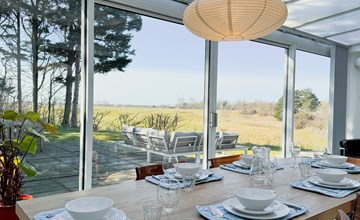 De woonkamer loopt naadloos over in de open keuken en eetruimte, waar een grote eettafel staat die plaats biedt aan zes personen.