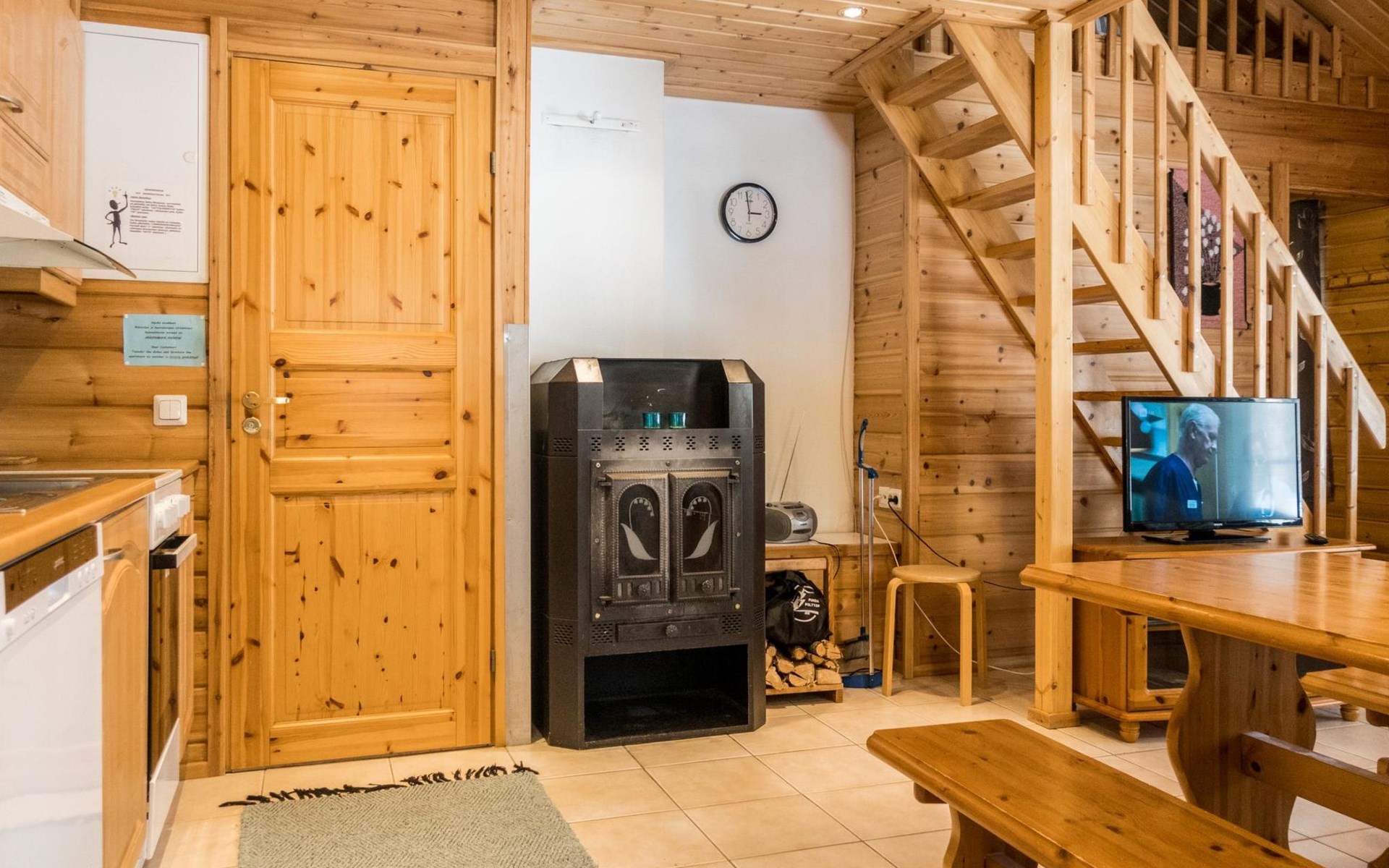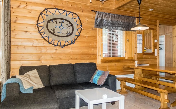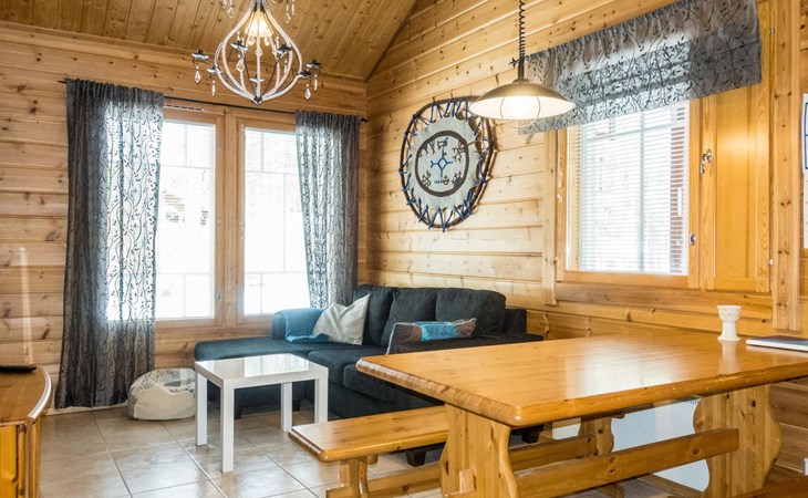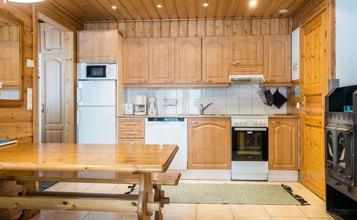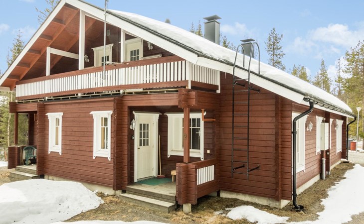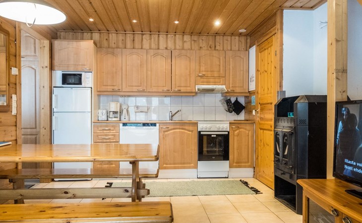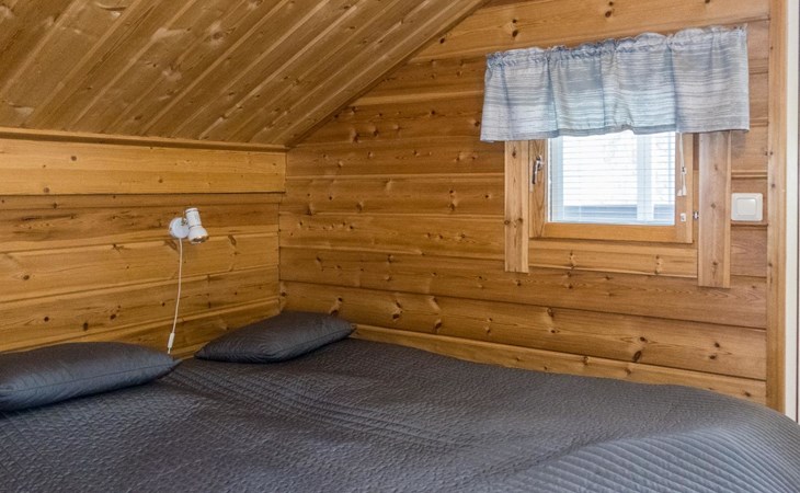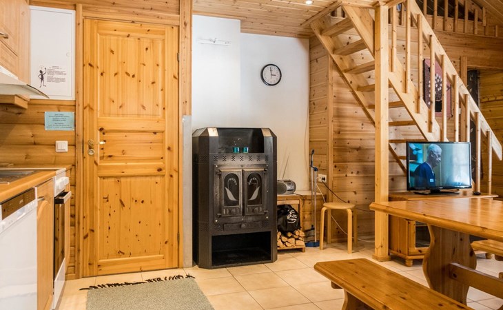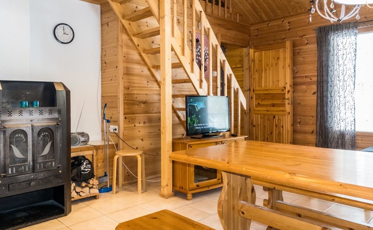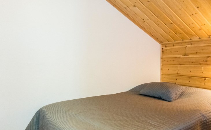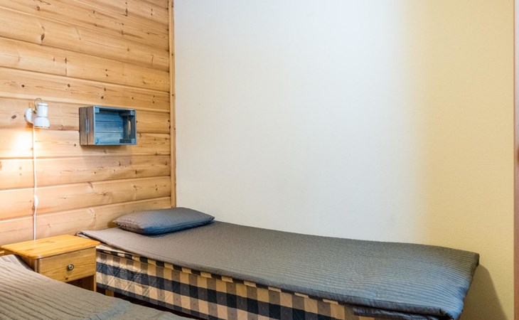 Two storey apartment; on the ground floor kitchen-living room with sofa bed, bedroom with 2 single beds, sauna (electric stove), shower room / wc. Upstairs bedroom with 2 single beds, one bedroom with one bed (width 120 cm) - Note! This bedroom doesn't have a door at all, a loft with 2 mattresses, balcony.