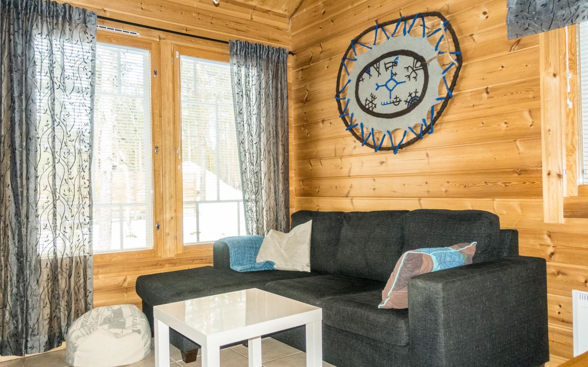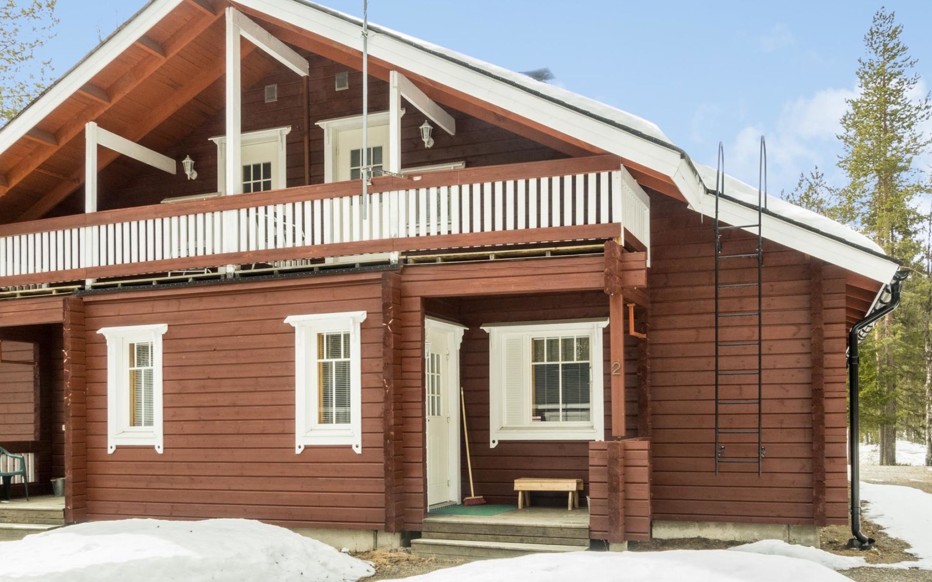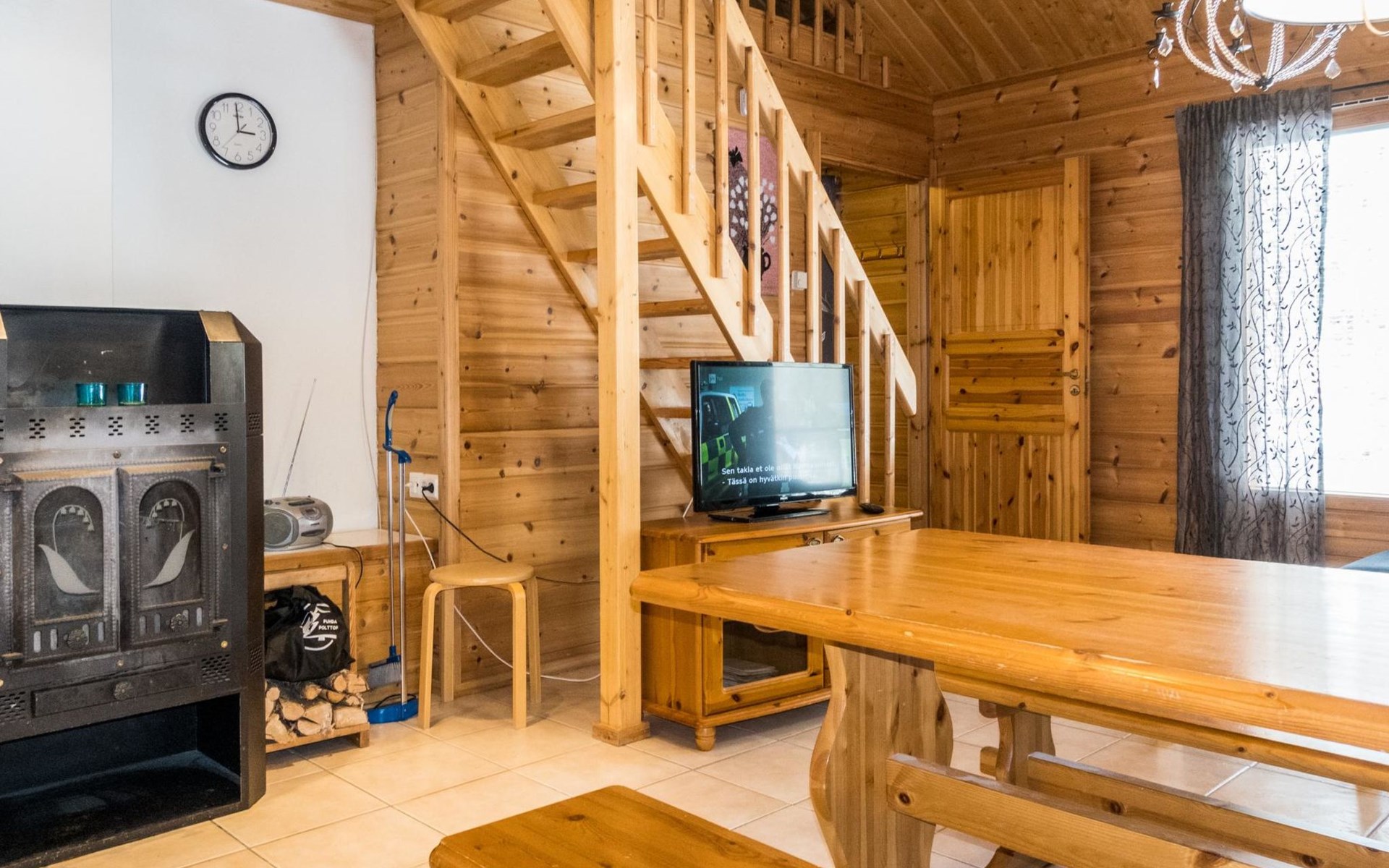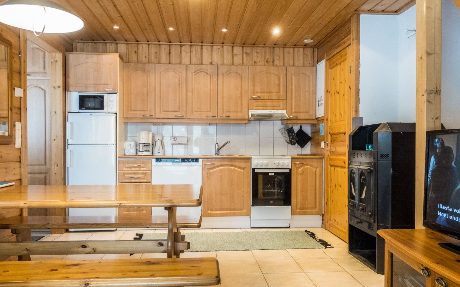 Two storey apartment; on the ground floor kitchen-living room with sofa bed, bedroom with 2 single beds, sauna (electric stove), shower room / wc. Upstairs bedroom with 2 single beds, one bedroom with one bed (width 120 cm) - Note! This bedroom doesn't have a door at all, a loft with 2 mattresses, balcony.