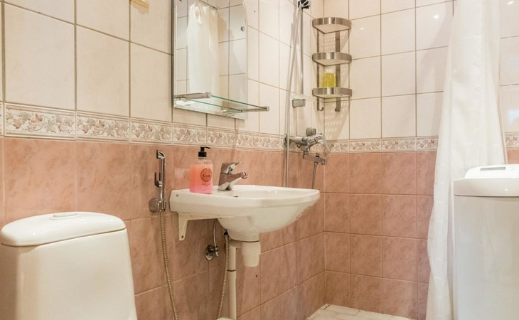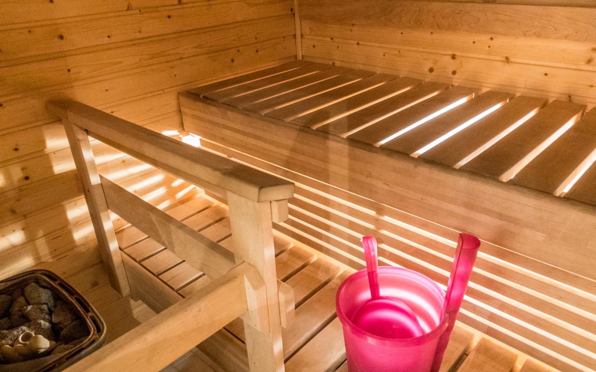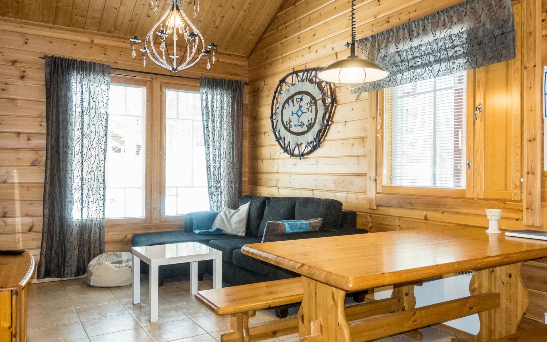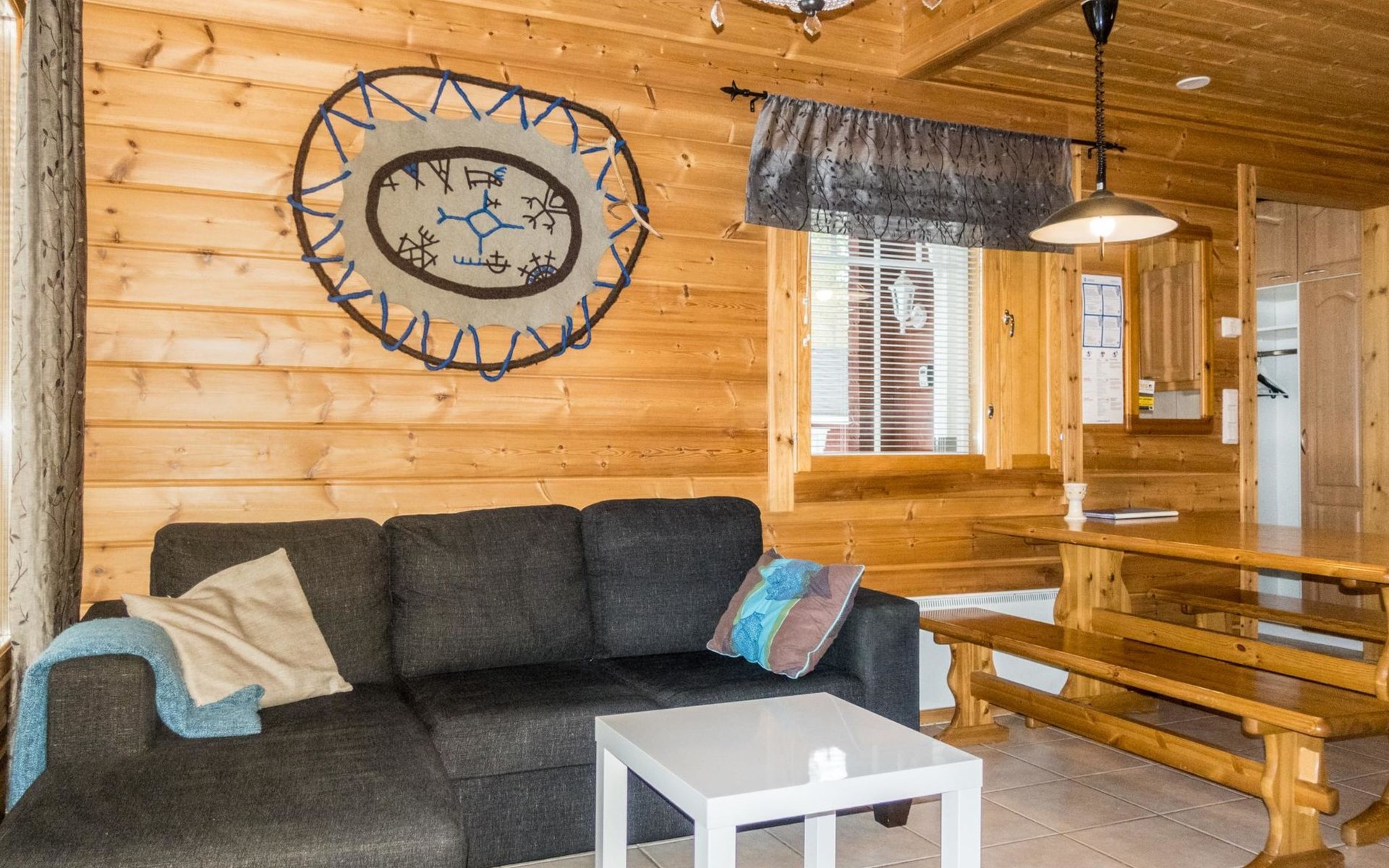 Two storey apartment; on the ground floor kitchen-living room with sofa bed, bedroom with 2 single beds, sauna (electric stove), shower room / wc. Upstairs bedroom with 2 single beds, one bedroom with one bed (width 120 cm) - Note! This bedroom doesn't have a door at all, a loft with 2 mattresses, balcony.