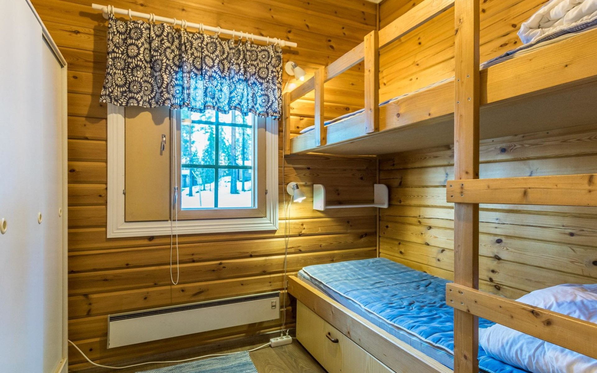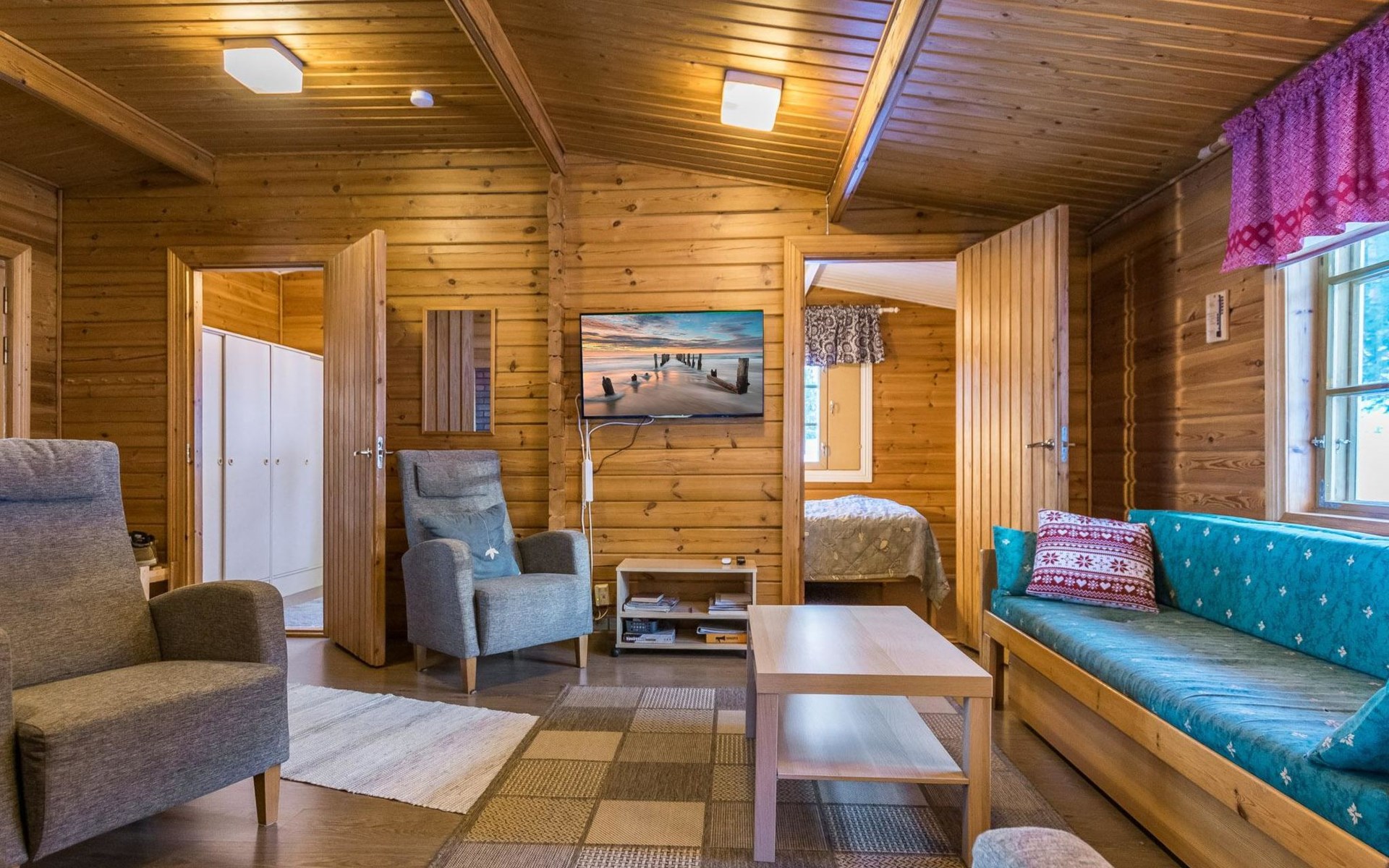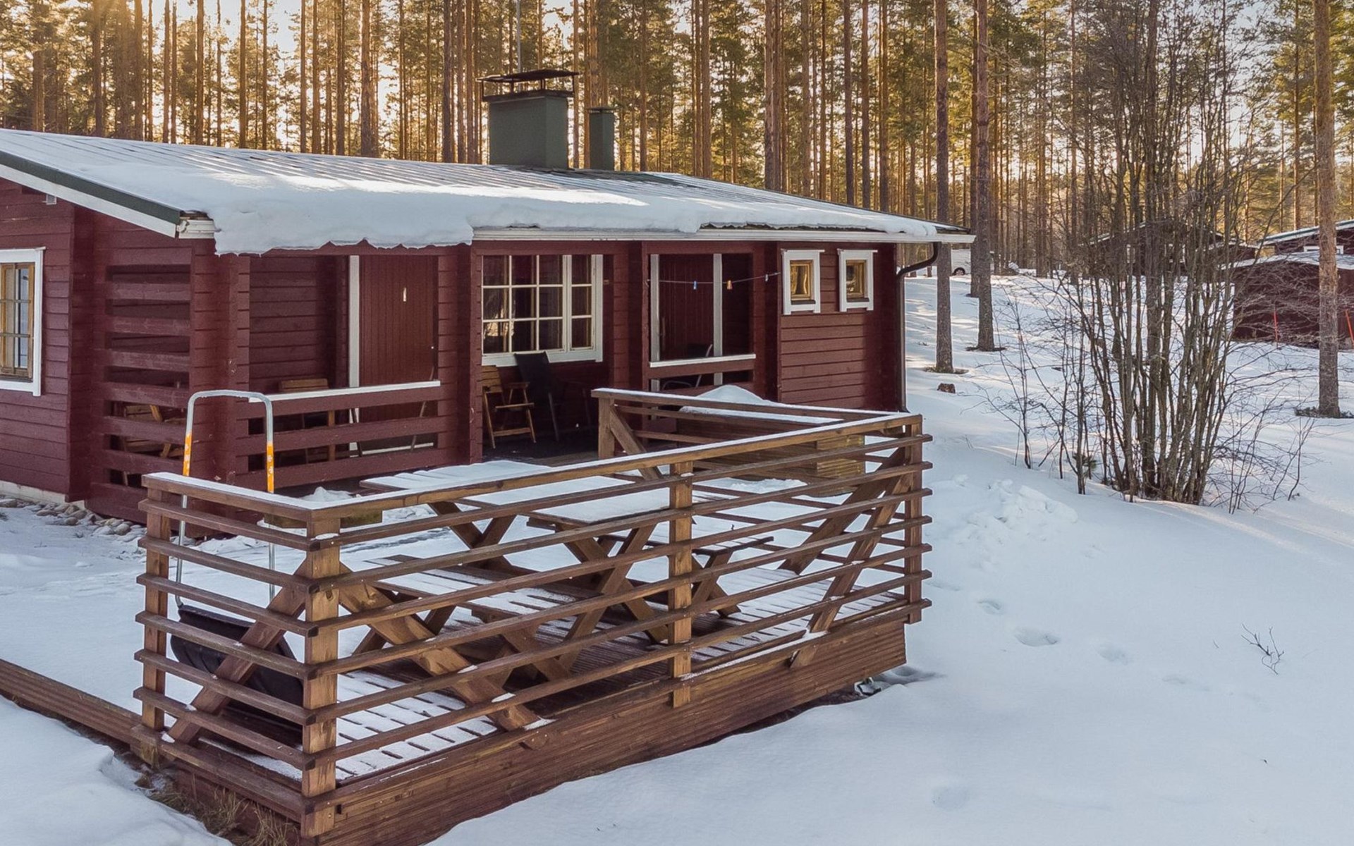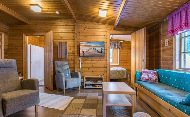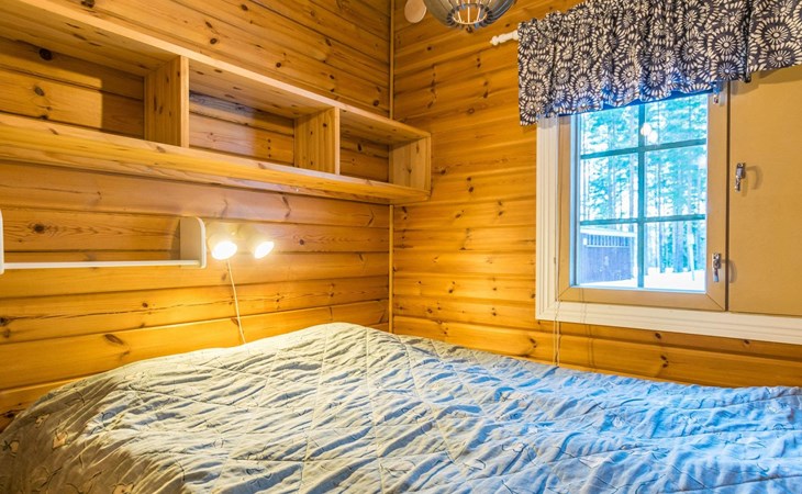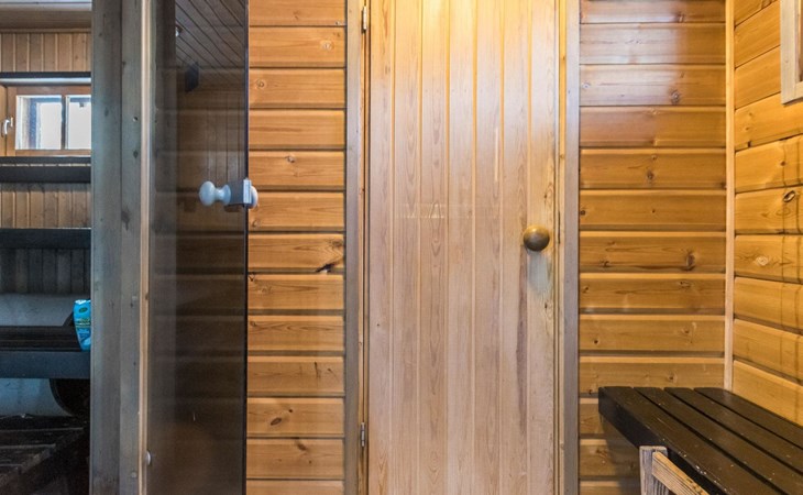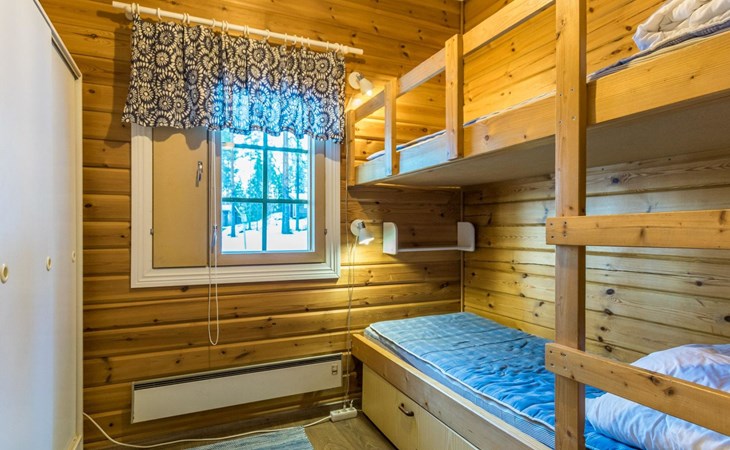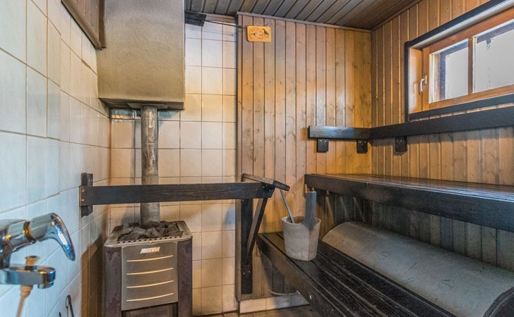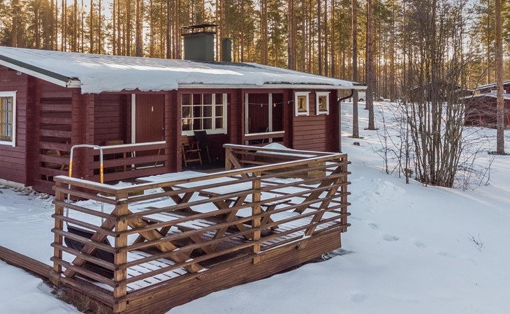 Log cabin 1991, kitchen, living room with 2 extra beds, bedroom with double bed , bedroom with bunk bed, dressing room, sauna and WC (entrance through veranda), open veranda.