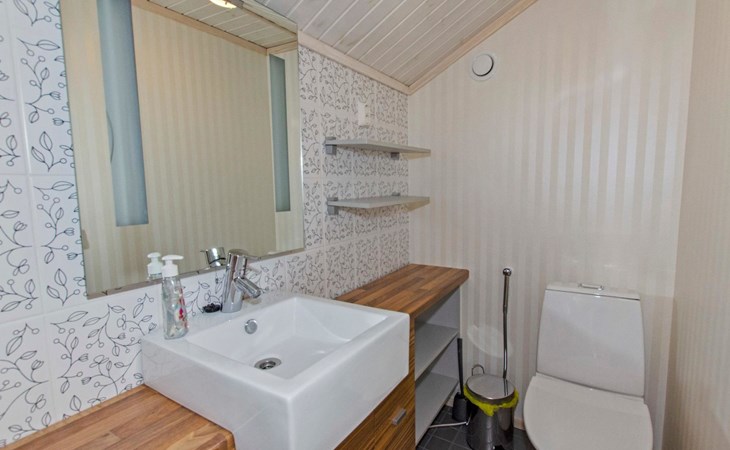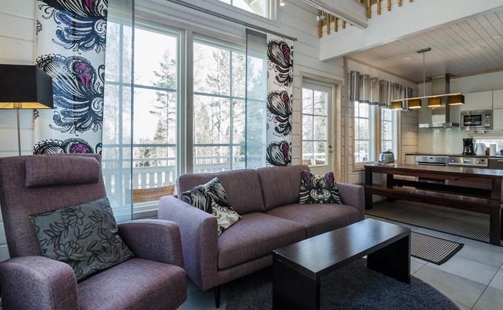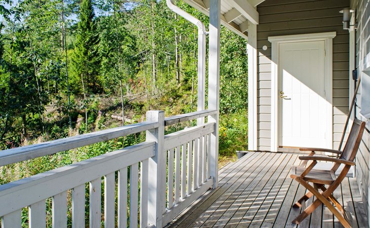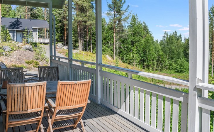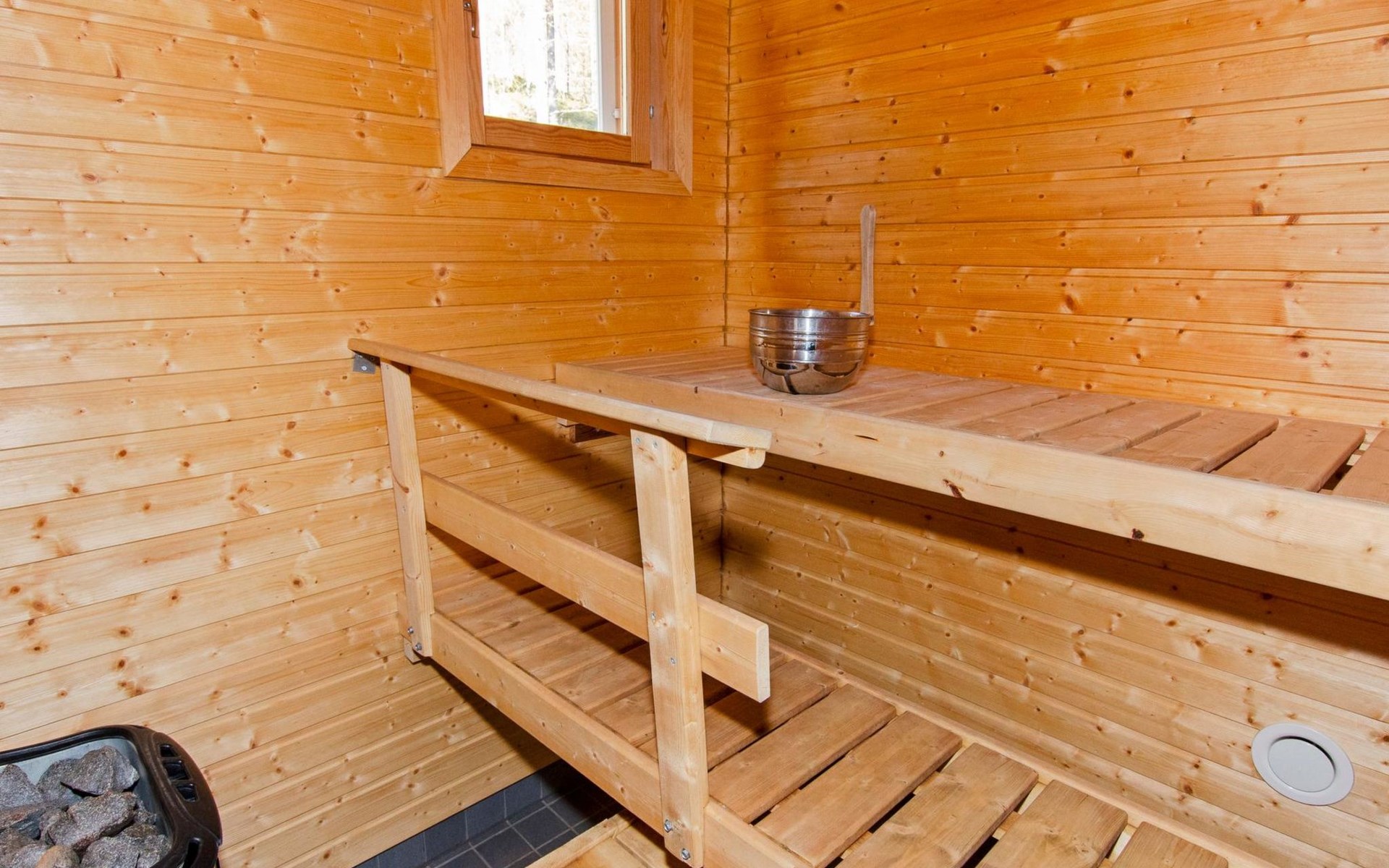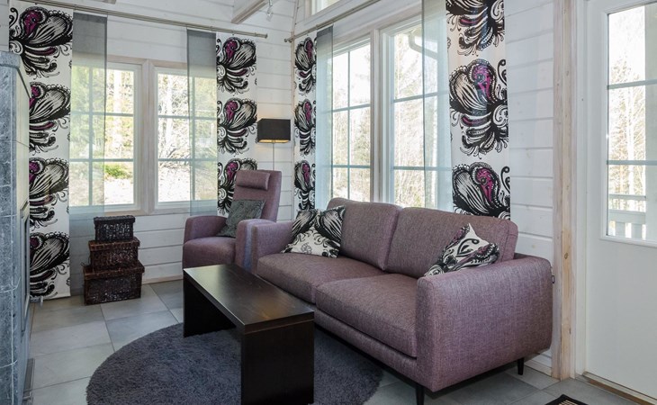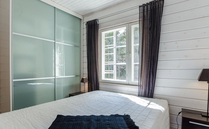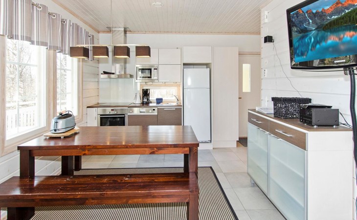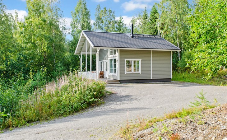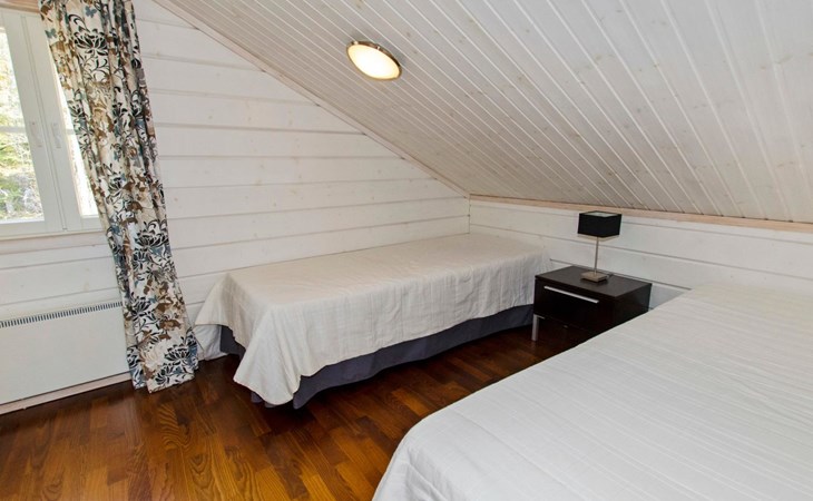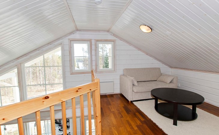 Wood cottage 2008, kitchen-living room, 1 bed room down stairs with double bed and one bed room upstairs with 2 beds, sleeping gallery with sofa bed, washroom, sauna (elec. stove), terrace.