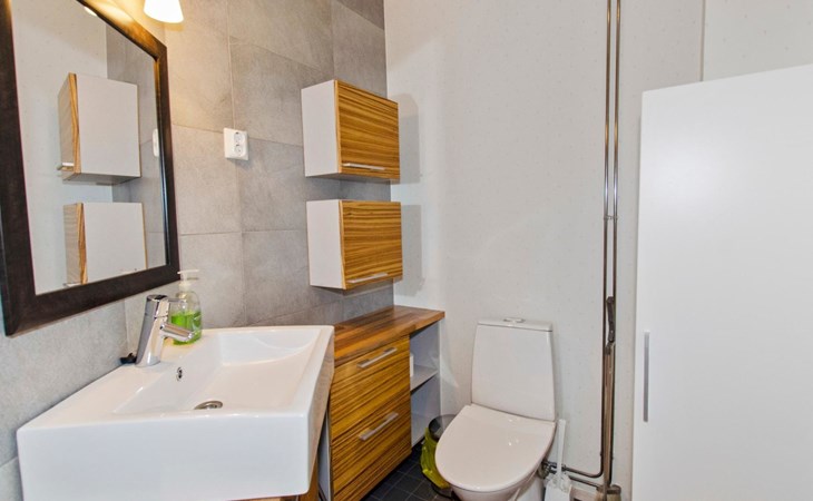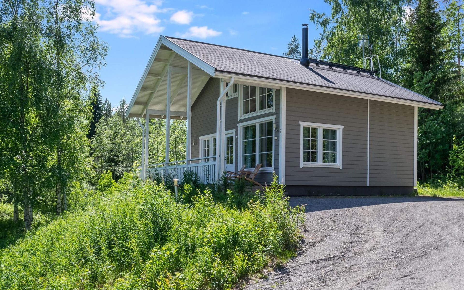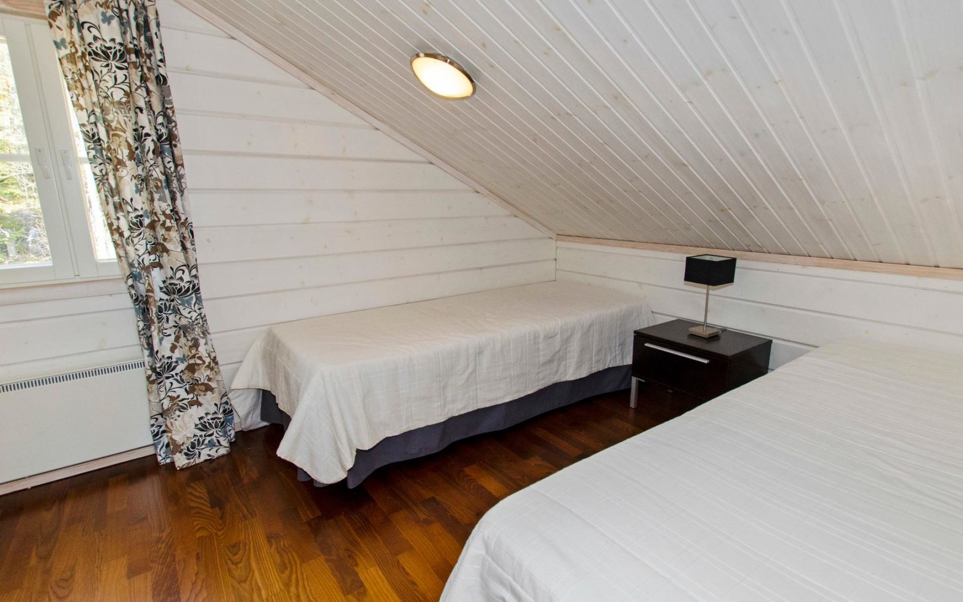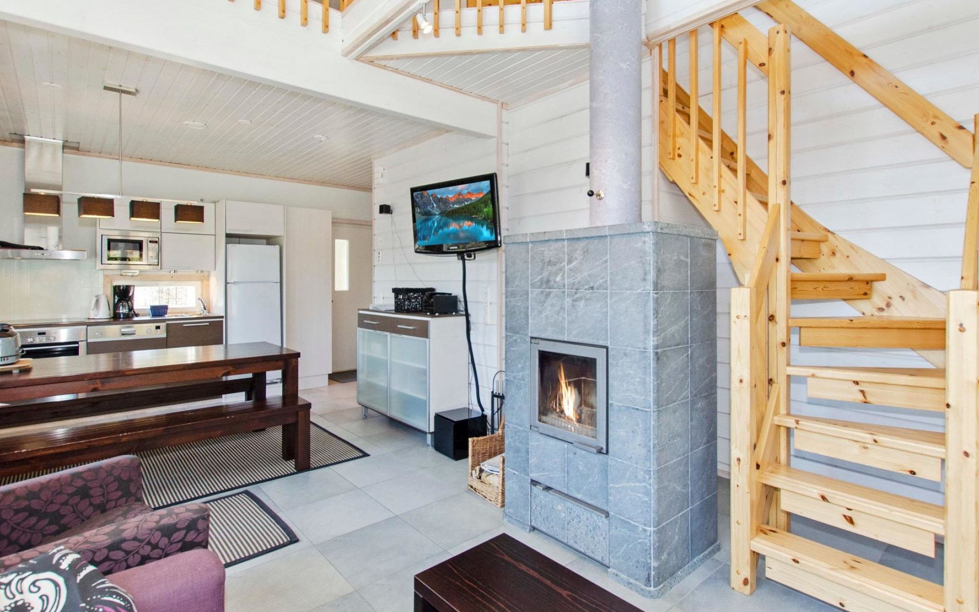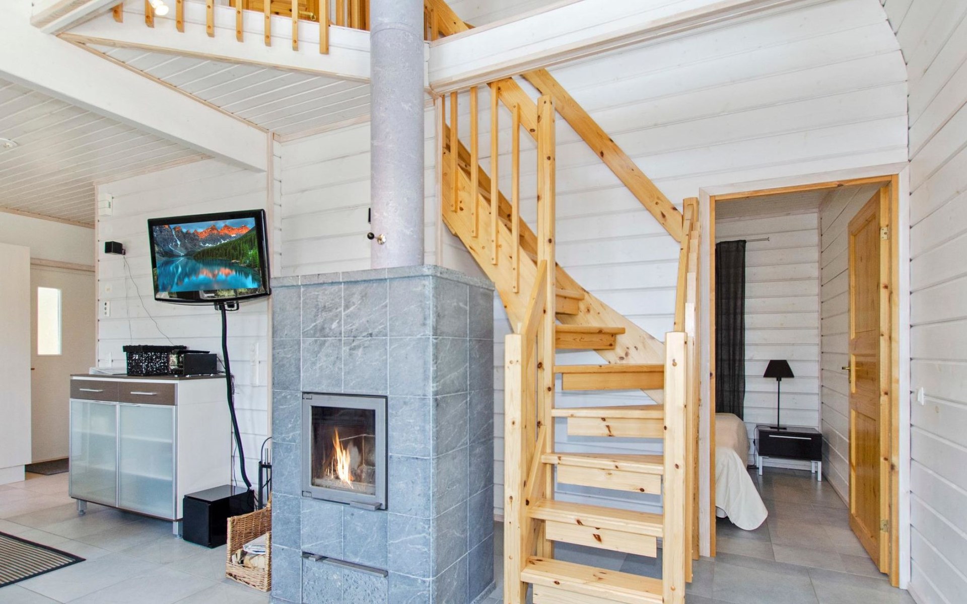 Wood cottage 2008, kitchen-living room, 1 bed room down stairs with double bed and one bed room upstairs with 2 beds, sleeping gallery with sofa bed, washroom, sauna (elec. stove), terrace.