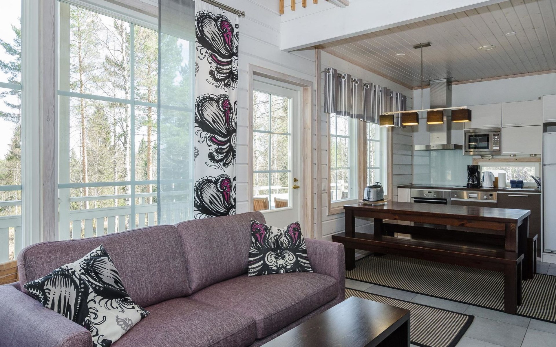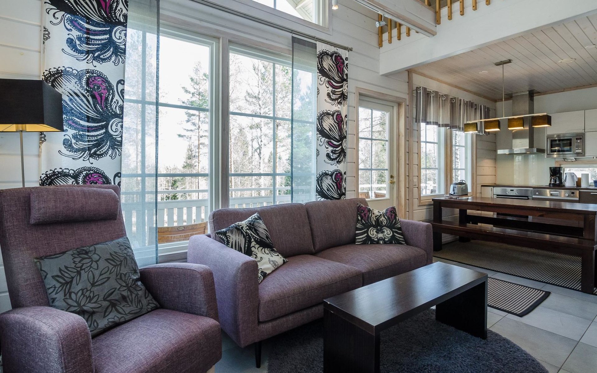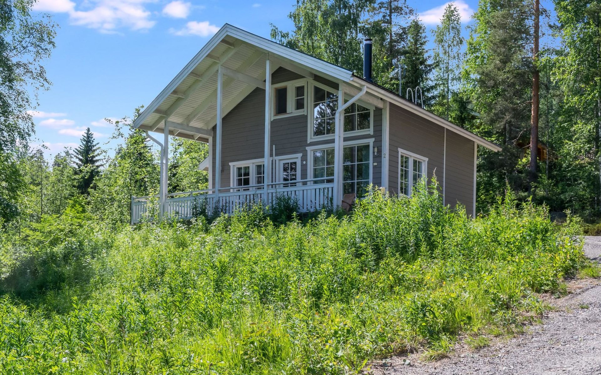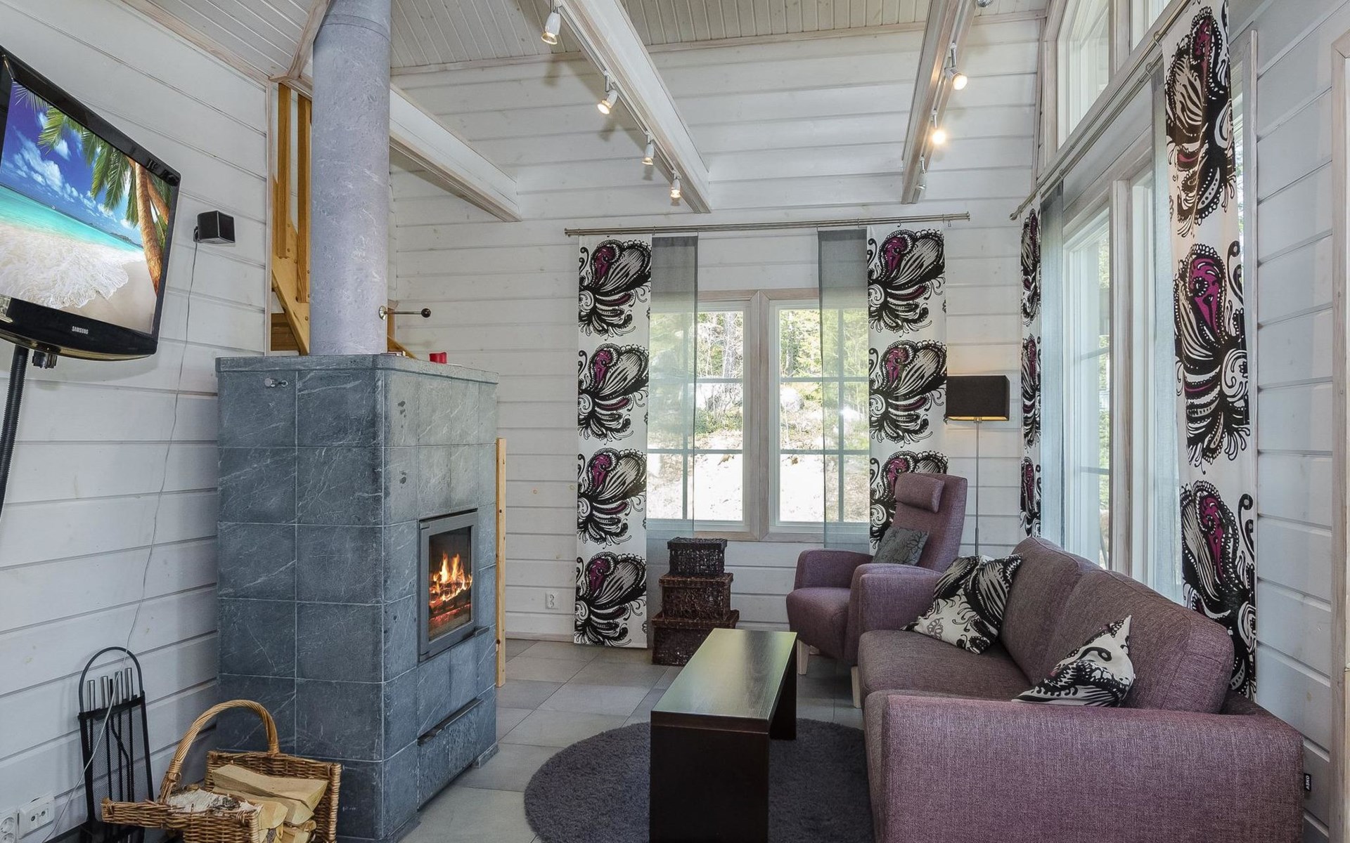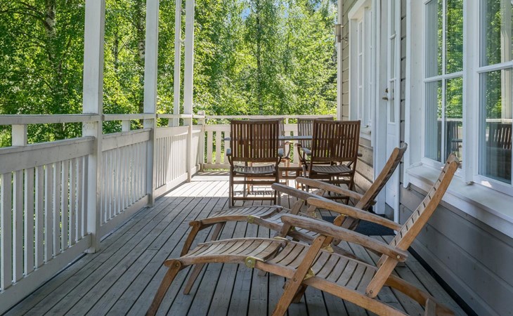 Wood cottage 2008, kitchen-living room, 1 bed room down stairs with double bed and one bed room upstairs with 2 beds, sleeping gallery with sofa bed, washroom, sauna (elec. stove), terrace.