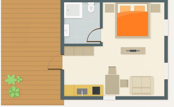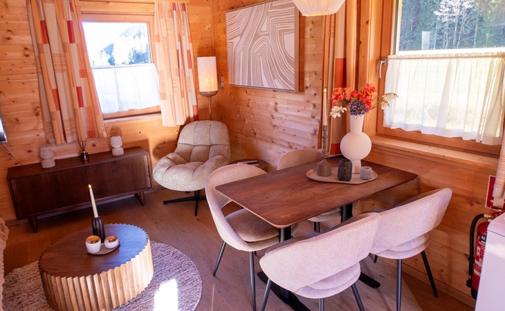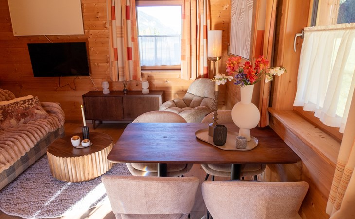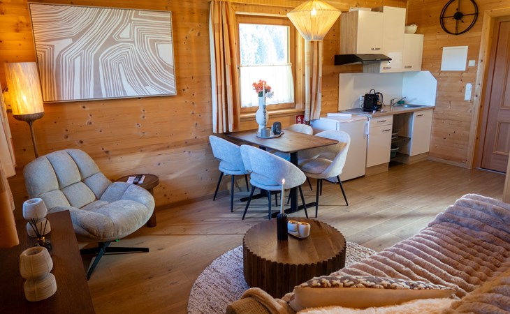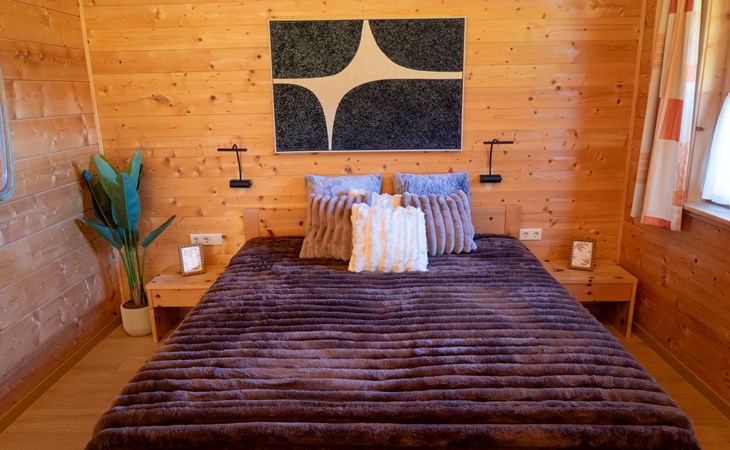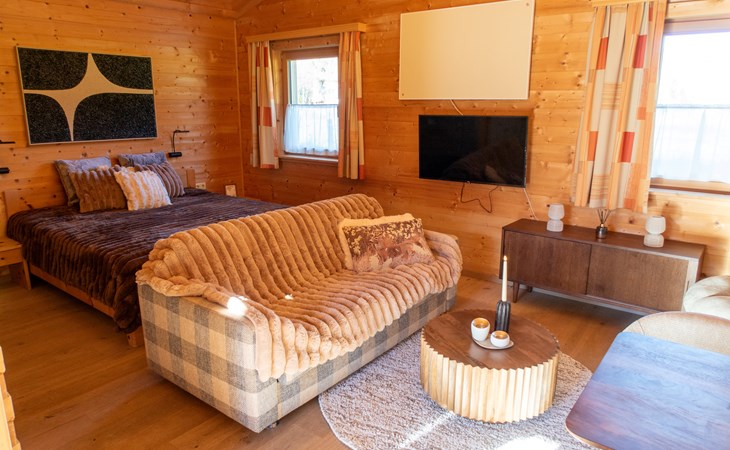 De cabin is geschikt voor twee personen en beschikt over een gezellige woon/slaapkamer, een volledig ingerichte keuken, een tweepersoonsbed, een badkamer met toilet. Comfort en beleving komen hier perfect samen.