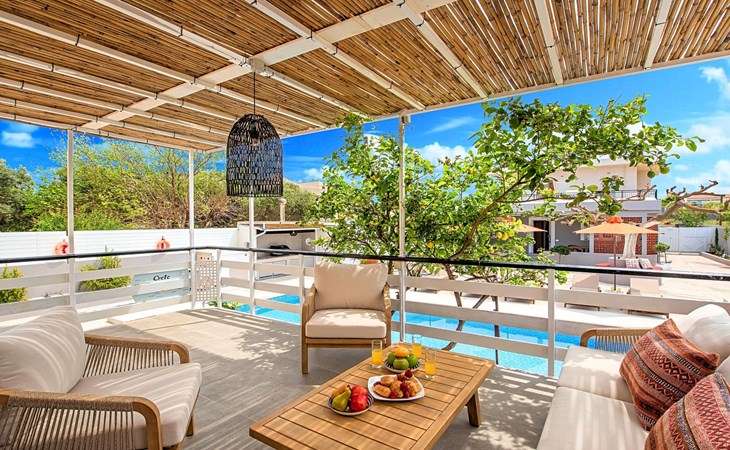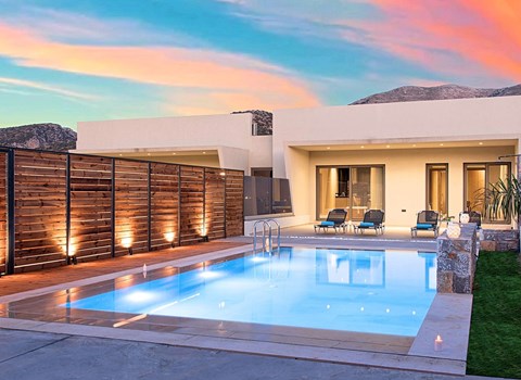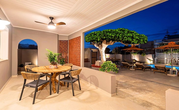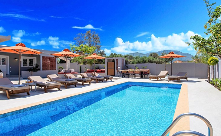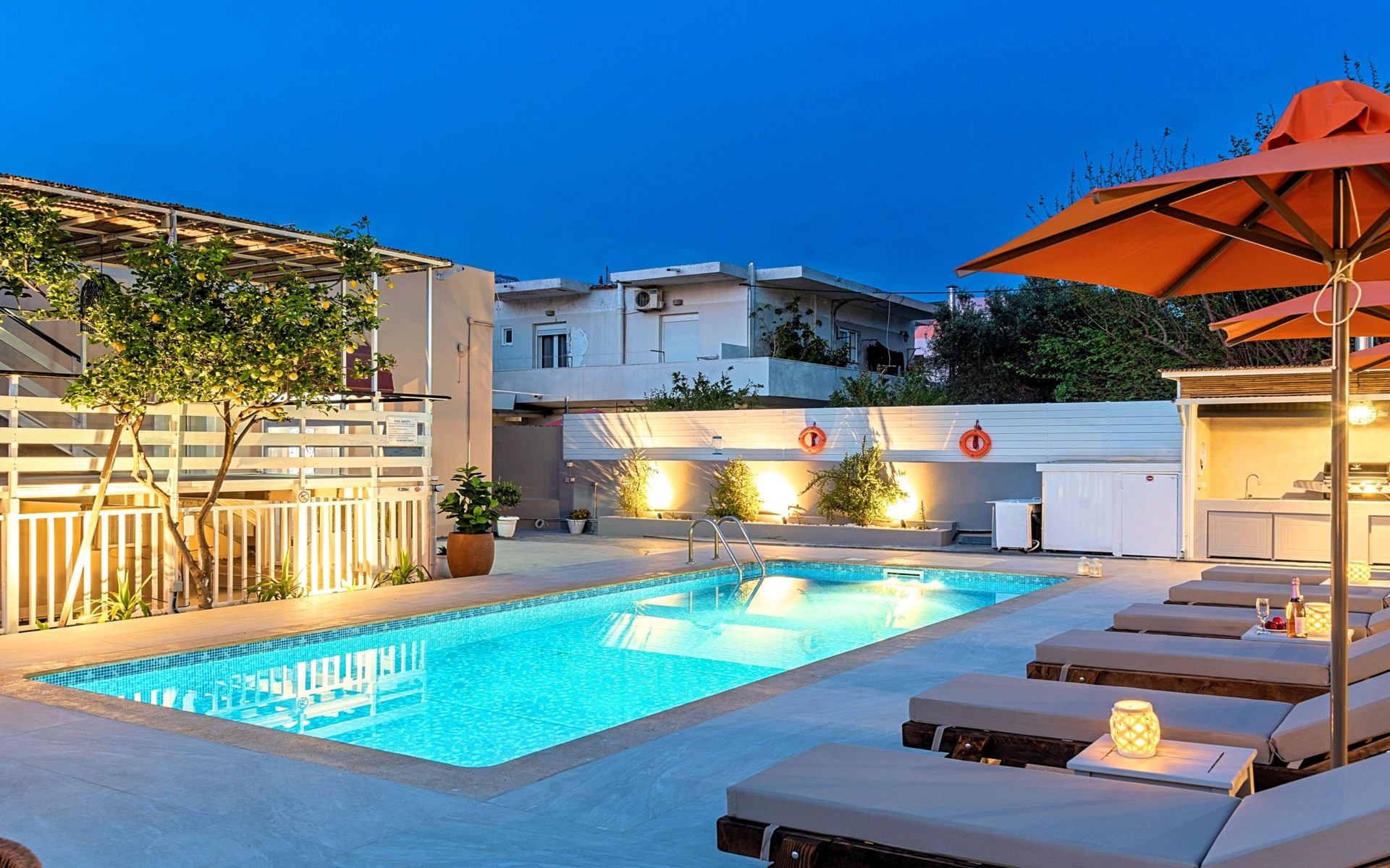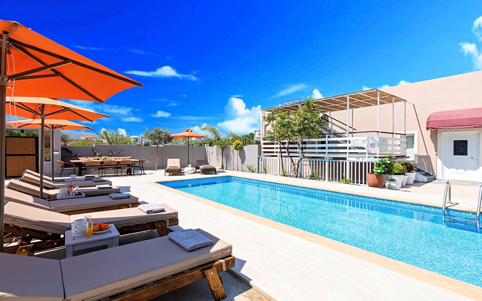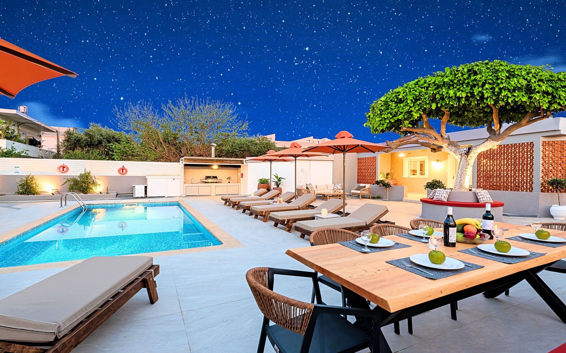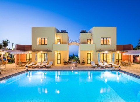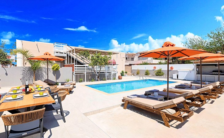 At the heart of Kavros, one of the most touristic places of Crete, Remezzo Villa emerges gleaming a bright, clean-lined Villa, where nature meets simplicity & refinement, enveloping visitors in an ambiance of peace, calm and exclusivity.Smart and modern in design, yet reassuringly unpretentious in attitude, offer a relaxed retreat just few meters away of the longest sandy beach of Crete Island. Attentive service, sun terraces for each bedroom that are perfect platforms for sunbathing and a large pool sanctuary to relax all together. Remezzo Villa is ideal for big families, a group of families or a group of friends. Enjoy your vacations with your parents or with the rest of your family members while at the same time preserving your privacy just like at your own home. The Villa offers 8 bedrooms, 5 bathrooms, 3 living rooms, large fully equipped kitchen, terraces, gardens and a large Pool area with sun lounge, sunbeds, umbrellas, BBQ and a large dining area for all of you.This is a two-floor building Villa. Remezzo Villa description and facilitiesThe villa can accommodate twenty eight (24)guests.The whole building offer four apartments and a large house with 8 bedrooms, 3 living rooms with kitchen facilities, five bathrooms (four with shower and one with bath tub). The whole property can accommodate 19 guests at the bedrooms, plus another 5 quests in sofa beds. Beds description – five queen size double beds – five single beds – five single sofa beds.Building and house approx. 300sqm Swimming pool approx. 40sqm The outdoor pool is heated and can reach 6 to 8 degrees more that the 24 h average air temperature with maximum value of 29°CGeneral information of the Villa and the Area.Kavros village (the village where we are physically located) is a well-known touristic village who belong to the Municipality of Apokoronas, Chania Prefecture.You will find all that you might need in a distance of 20 up to 500 meters from Kavros Pleasure.Super markets and stores open daily from 7.00 a.m. to 10.30 p.m., including weekends.The petrol station is open daily from 7.00 a.m. to 9.00 p.m.There is also a fast food restaurant open 24 hour a day.Bakery and butcher shop are open daily from 8.00 a.m. to 2.00 p.m. and from 6.00 p.m. to 8.00 p.m.The pharmacy stays open Monday to Friday from 9.00 a.m. to 2.00 p.m. In the nearby town of Georgioupolis, just 5 km from Island Suites, there is another pharmacy that stays open daily from 8.00 a.m. to 8.00 p.m.The local medical doctor can be found at his office during most of the days just next to the Villa. In case of emergency, you can also call him at his mobile phone; the number is written at the door of his office.Car rental and bike rental offices and the bookstore are open from 9.00 a.m. until late at night.In the village of Kavros there is a number of taverns and restaurants, open for lunch and dinner until late at night. 1230265