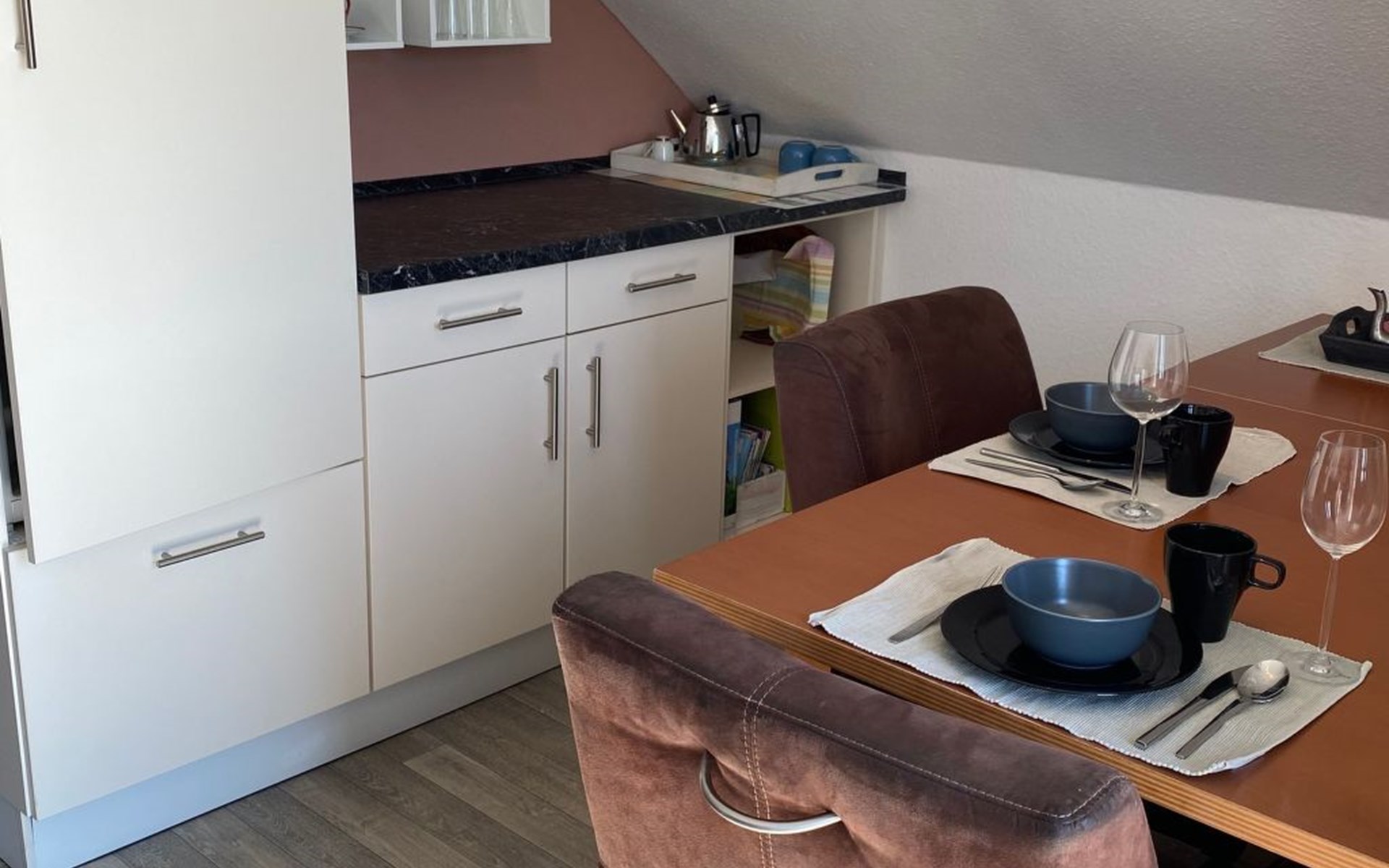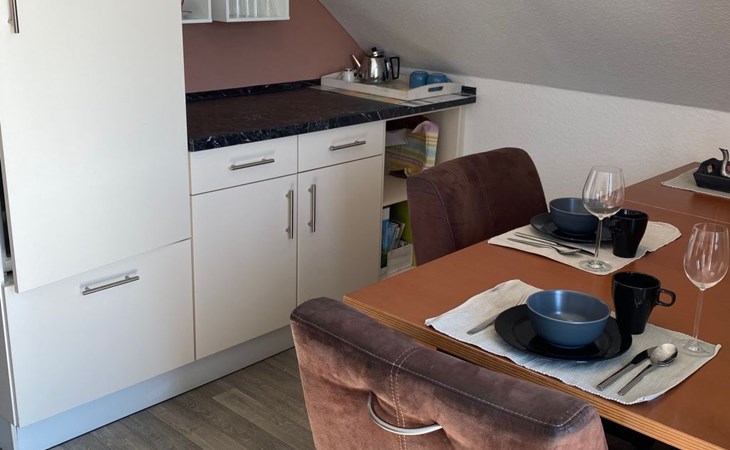 Het gastenverblijf, gelegen op de eerste verdieping boven een galerie/atelier, beschikt over een eigen trap en is van alle gemakken voorzien. De accommodatie bestaat uit een woonkamer, een keuken-eetkamer en een slaapkamer met een tweepersoonsbed (boxspring 1.60m x 2.00m) en een badkamer met douche. Indien gewenst kan er een eenpersoonsbed of kinderbedje in de aangrenzende kamer worden geplaatst. Deze ruimte wordt ook gebruikt voor bagage en kleding en heeft een raam en verwarming. WIFI staat gratis tot uw beschikking. Er is centrale verwarming en radiatoren in elke ruimte.