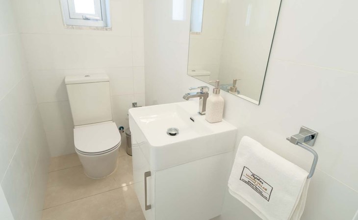 Coral Elite decor is simple, yet sophisticated and luxury. The living, dining and kitchen areas are thoughtfully spacious, with modern design throughout with carefully chosen furniture and furnishings. The living and dining space as well as the fully equipped kitchen are on the ground floor that opens out to the patio, furnished with an outside lounge and dining area as well as sun-beds that surround the private pool. On of the 4 en-suite bedrooms is also located on the ground floor.