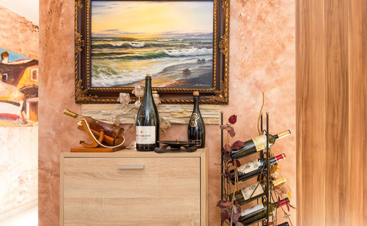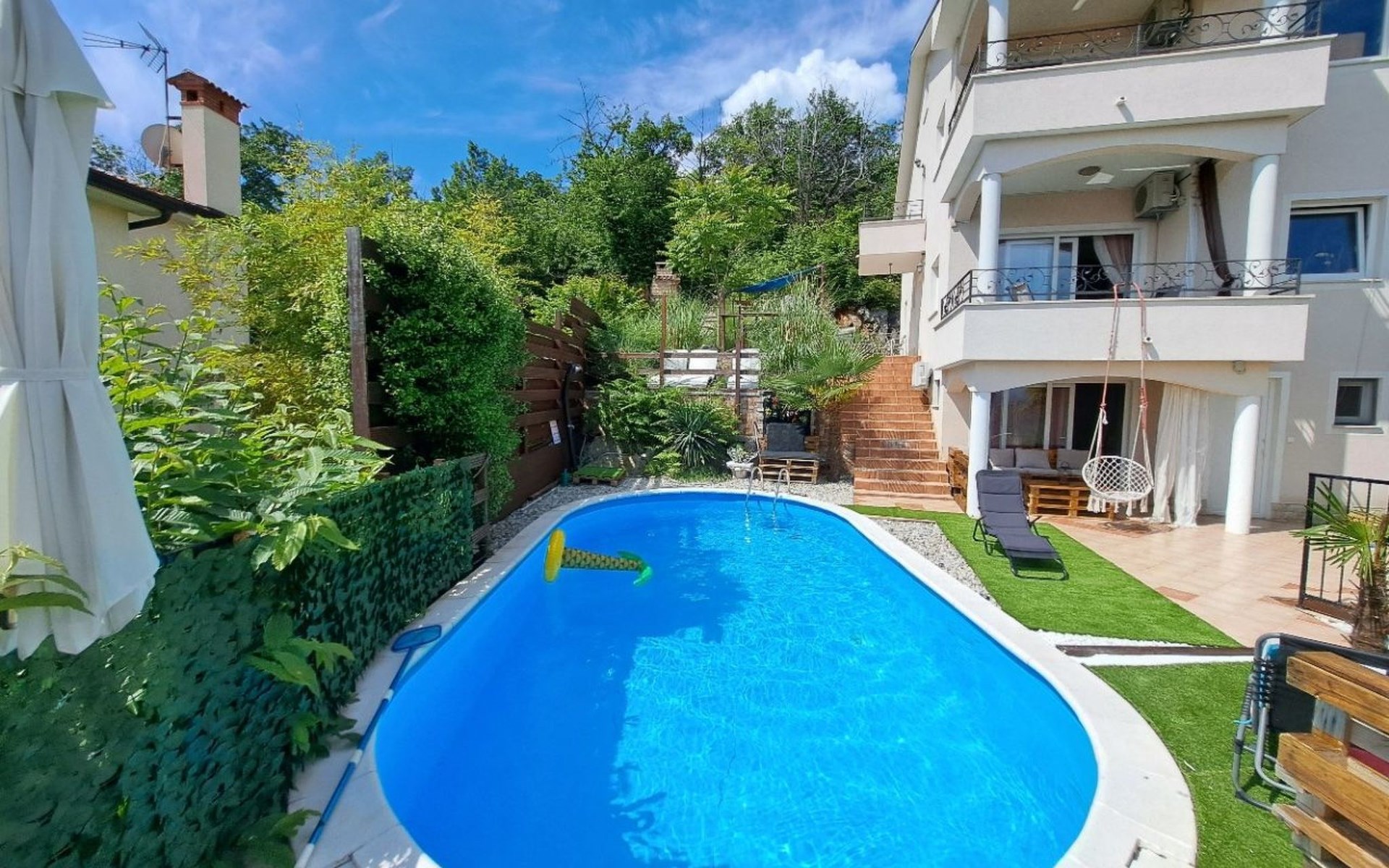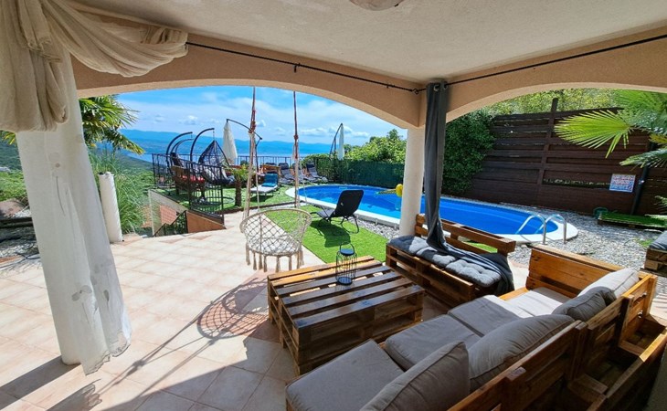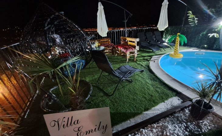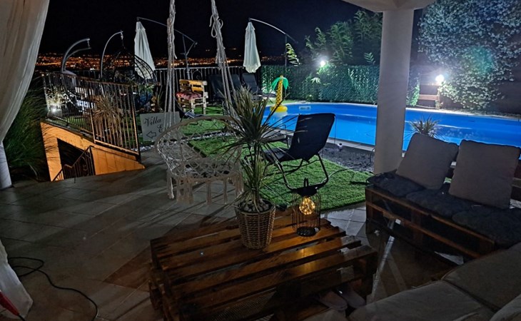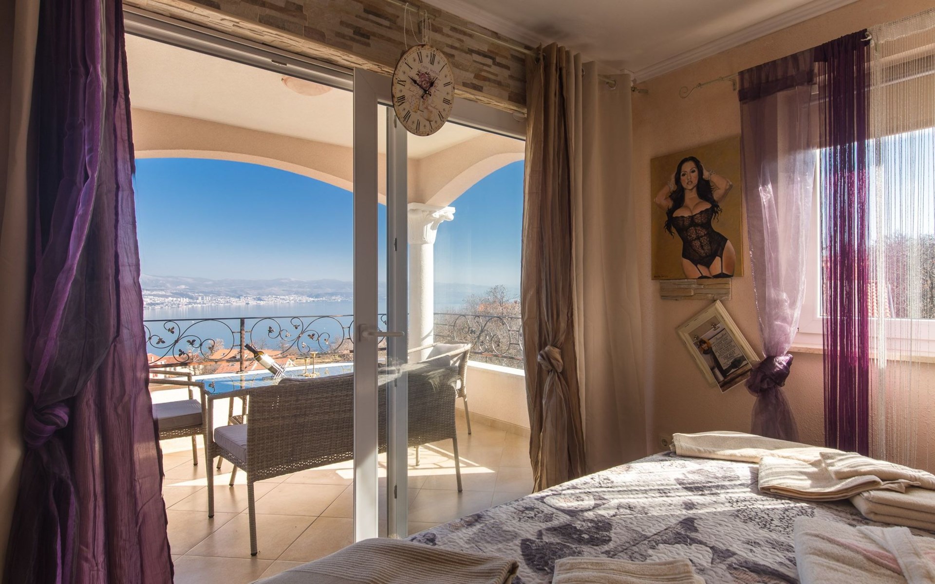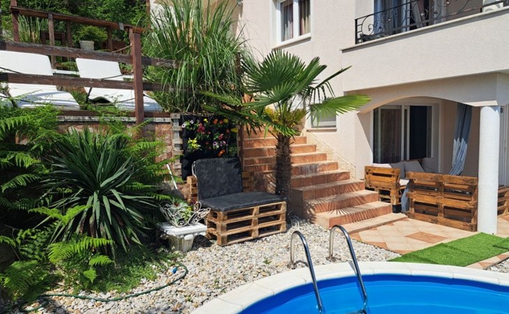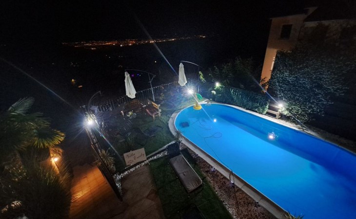 Beautiful Apartment In Unique Villa With Amazing Sea View. If you wan't to have an unforgettable and unique holiday this is a right place for you. This beautiful modern villa is nested on a hill side over a small medieval town of Lovran on the famous Opatija riviera. It boasts wonderful views of the Adriatic from the terraces and very private garden featuring an infinity pool. The location is excellent with all the amenities and the beach in short walking distance. Outside you will find an all fresco dining area, sun loungers and some nice lounge furniture to enjoy the views and the sun. Indoors there is a spacious open living area folded with light and opened to the garden.Villa is a residential facility, built on three floors: ground floor, first floor and attic with a swimming pool and Jacuzzi in the front of the house and an outside kitchen in back of the Villa. The house has, 2 bathrooms, 1 guest toilet, 4 bedrooms, 3 terraces, attic and it is fully air-conditioned. This unique Villa is made in combination of modern living style and vintage style. Apartment in Villa can host up to 8 people and it is perfect for 8 people, like young couples, or one big Family, or even two Families. The Villa has been fully refurnished and decorated in a new fashion cozy design. Each room is different and each room is unique. From master's room which has it's own private bathroom, you can enjoy a beautiful view on the Kvarner Bay and sea with mountains behind while you are laying on your big bad, and in the morning you will see the sun rising while you wake up. Enjoy your morning coffe on your terrace while watching the sea in front of you. On the ground floor or first floor is a beautiful large living room with view on the Kvarner Bay with a fireplace, covered terrace, kitchen and dining room with access to the rear of the house to the terrace. The rear terrace behind the kitchen and dinning room is equipped with a big large table and summer kitchen, so you can sit outside and enjoy your morning breakfast, launch or dinner. On the small hill behind the house is big fireplace where you can prepare your favourite meals outside in the nature, surrounded by beautiful garden with lots of flowers, palms and green wood. From this point you have also a beautiful view on the swimming pool and Kvarner bay and City of Rijeka which shines at nights giving you a wonderful feeling and a great view. This place is a place where you will for sure enjoy your stay in the villa. Imagine yourself staying outside on the fresh air, with a fireplace burning, drinking a glass of homemade vine or a glass of cold beer, overlooking the Kvarner bay and City of Rijeka while the music is playing your favourite song. It is just fantastic and this is something you can just imagine but you can feel it in Villa. Internal stairs lead to the second floor where there are three large bedrooms and a large bathroom. Each room is decorated in a unique cozy style, like Lover's room in violet colour, or Paris room in red and grey, or master room with it's own private bathroom with a terrace and view on the sea. In the attic is a small studio with big double bed, perfect place for kids to play. On each floor there are wonderful large covered balcony overlooking the entire Kvarner bay and Adriatic sea. The house is situated in a peaceful location with beautiful sea views and surrounded by greenery and overlooking Lovran chestnuts. The garden is well tendered with lots of green trees, flowers, palms, and green grass, making your stay more confortable. Interior of the house is completely decorated with beautiful pictures from famous academic painter Claudio Frank. The house has parking space for approximately three vehicles. In front of the house, in the garden there is a big swimming pool with a beautiful view on a sea and City of Rijeka and Kvarner bay, where you can enjoy swimming and relaxing in the pool drinking your favourite cocktail. The area around the pool is equipped with sun loungers and some nice lounge furniture to enjoy the views and the sun. There are also lots of palm trees around the swimming pool making you feel like you are on the beautiful beach. Close to the swimming pool is another terrace with a Jacuzzi and hidromasage where you can enjoy your stay in this massage pool and drink your favorite cocktail. Just to point out what is so special in the Villa: -The house is situated on the hill with a beautiful view on the sea and Kvarner bay -The house is surrounded by the trees so you have a complete privacy at this place -The interior of the house is completely new and the house is equipped with everything you need to make your stay comfortable and unforgettable -The wine cellar with more than 50 different vines that you can taste and drink if you like it -Outside covered kitchen so you can stay outside on the fresh air in the hot summer days and nights -Outside Jacuzzi with a view on the sea -Outside swimming pool with the view on the sea -A butler on your disposal if you need it -If you don’t want to go to the supermarket for a shopping there is a butler at your disposal who will make a shopping for you or any other thing you need -You don’t have a time to make a bed or clean the kitchen or house no problem -There is a cleaning women also at your disposal when ever you need it she will came and do her job. And a thing that you will really like is the next one: -The first day when you arrive I can make a barbecue for all of you so you can eat and drink as much as you want and can. And I’m sure you will love this barbecue because it is made from home made staff, like meat, mushrooms, vegetables, all natural, and homemade vine. And that is just for a single price. - Or I can make also a fish diner for all of you with fresh sea food like fresh fish and other sea specialties and a home made white vine that will taste so good that you will really remember this dinner. And this is also for a single price . -And if you need any 